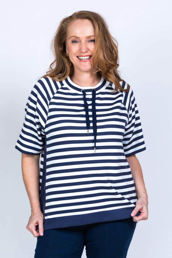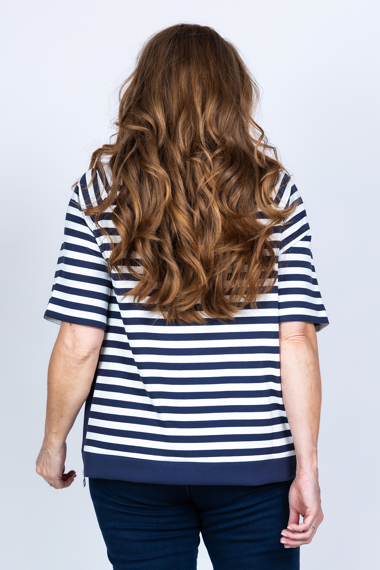 Gestreepte trui met korte mouwen, een ronde hals met koordje en ritsen aan de zijkant