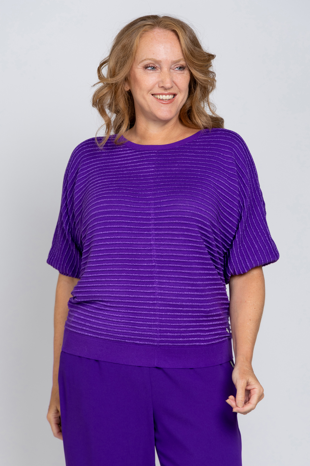 Paars truitje met een ronde hals, korte vlindermouwen en hij heeft een fijn glitterdraadje in de stof