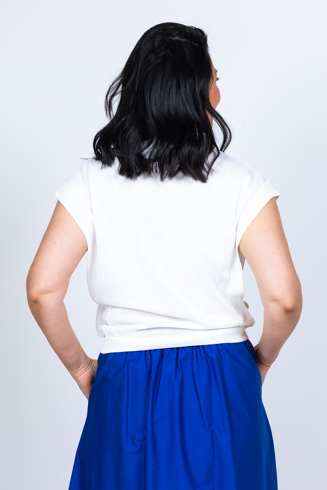 Truitje met een ronde hals, aangeknipte mouwen en fantasieboord