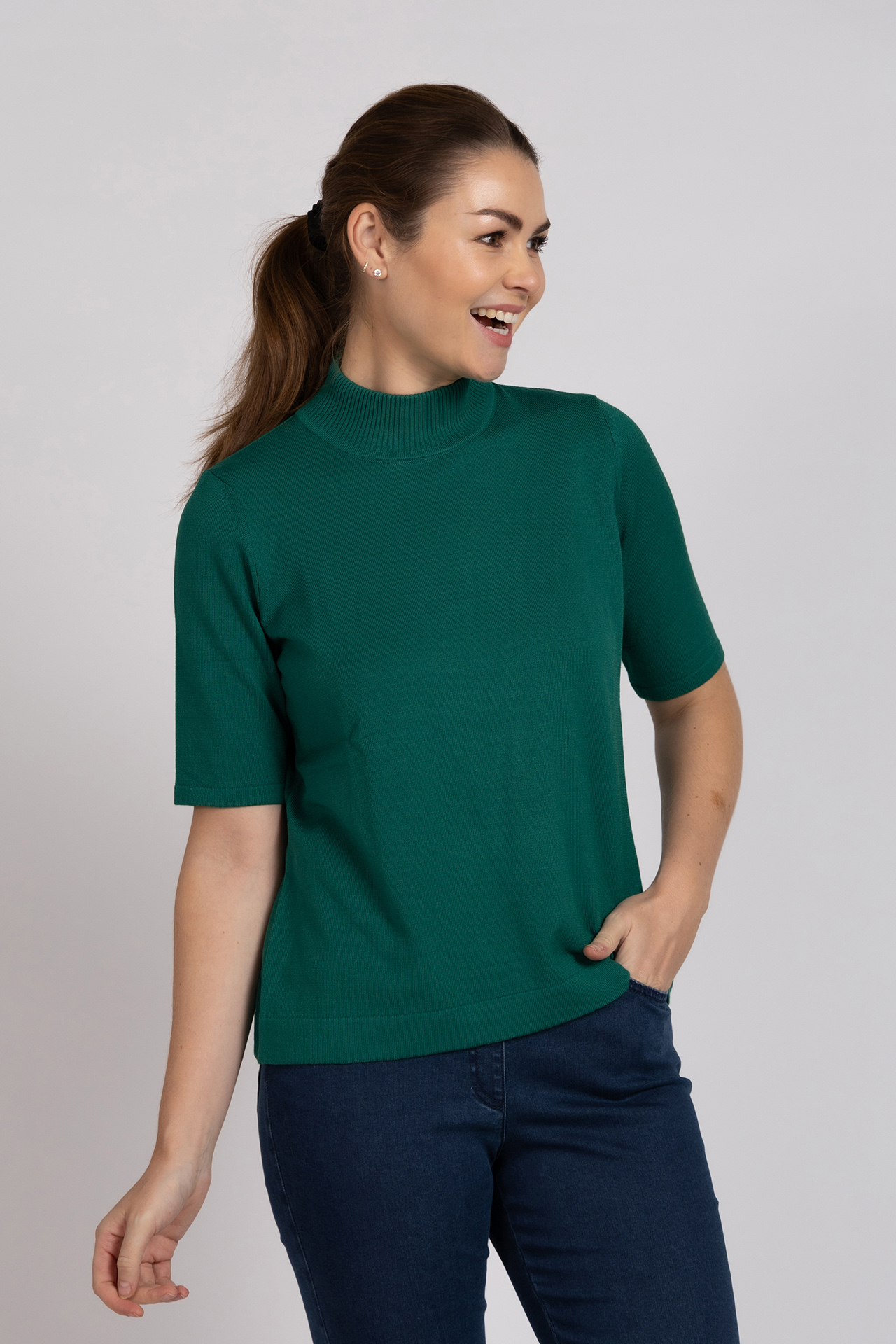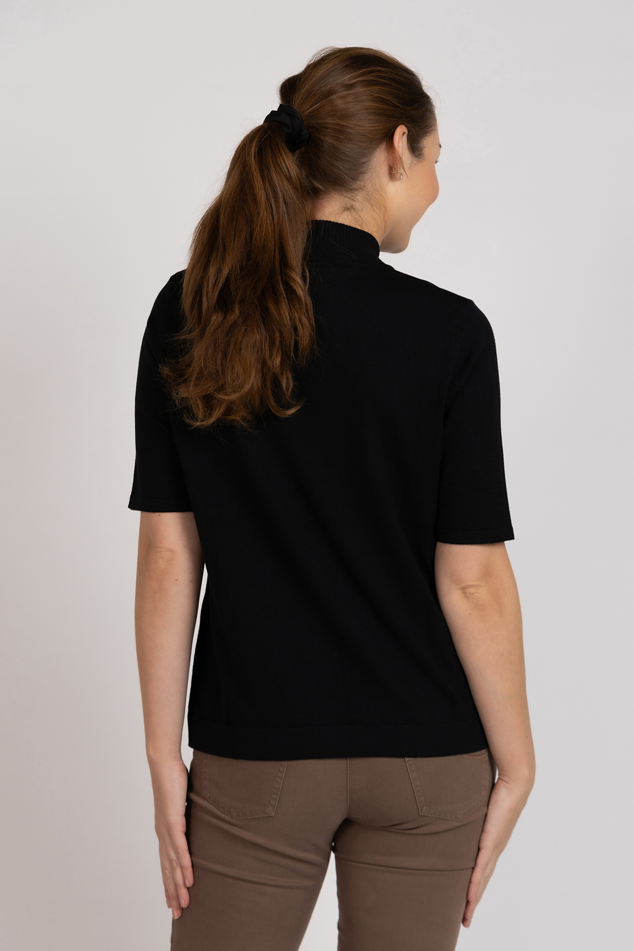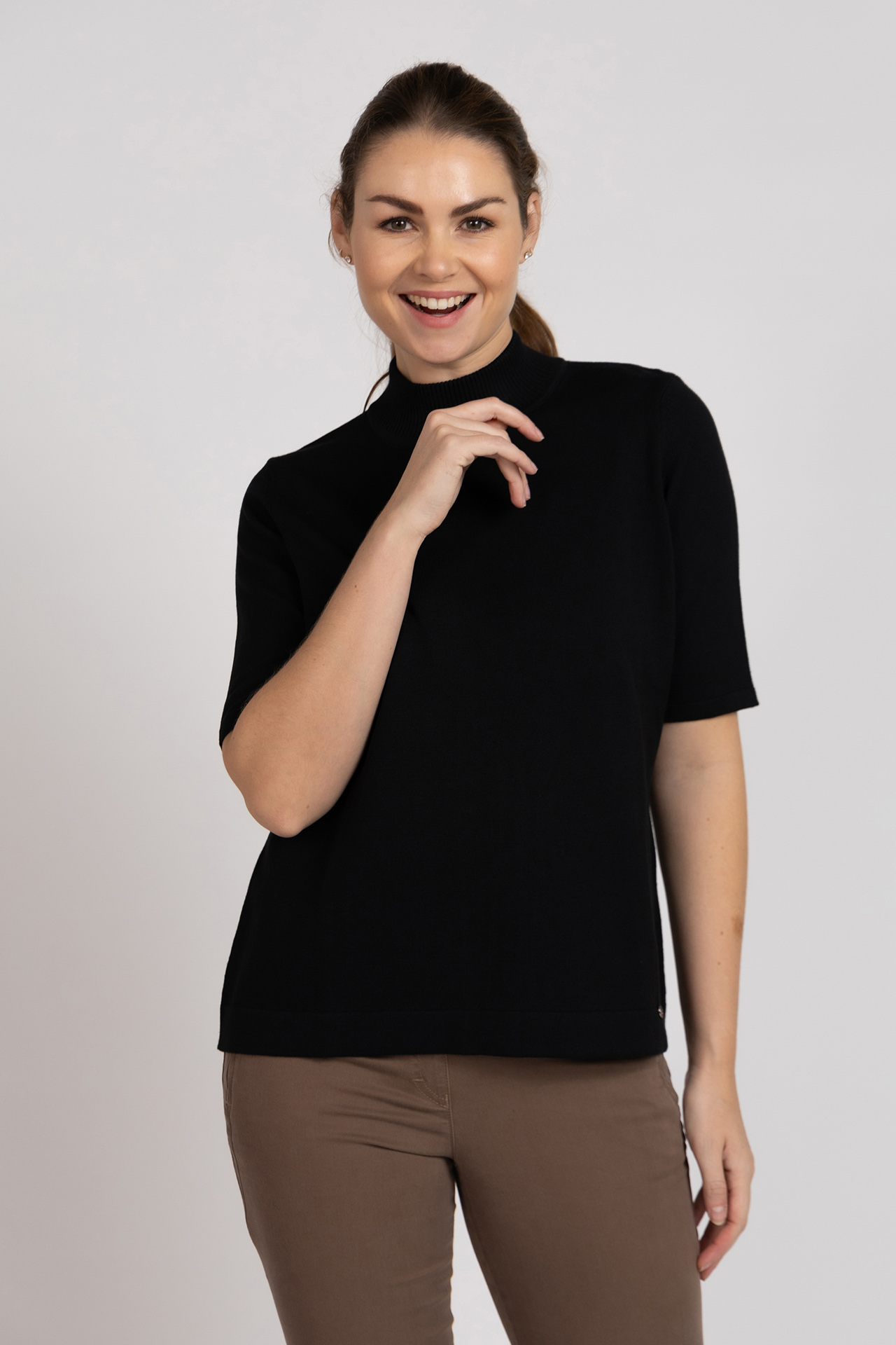 Trui met korte mouwen en een ronde hoge hals. Dit truitje is in meerdere kleuren verkrijgbaar