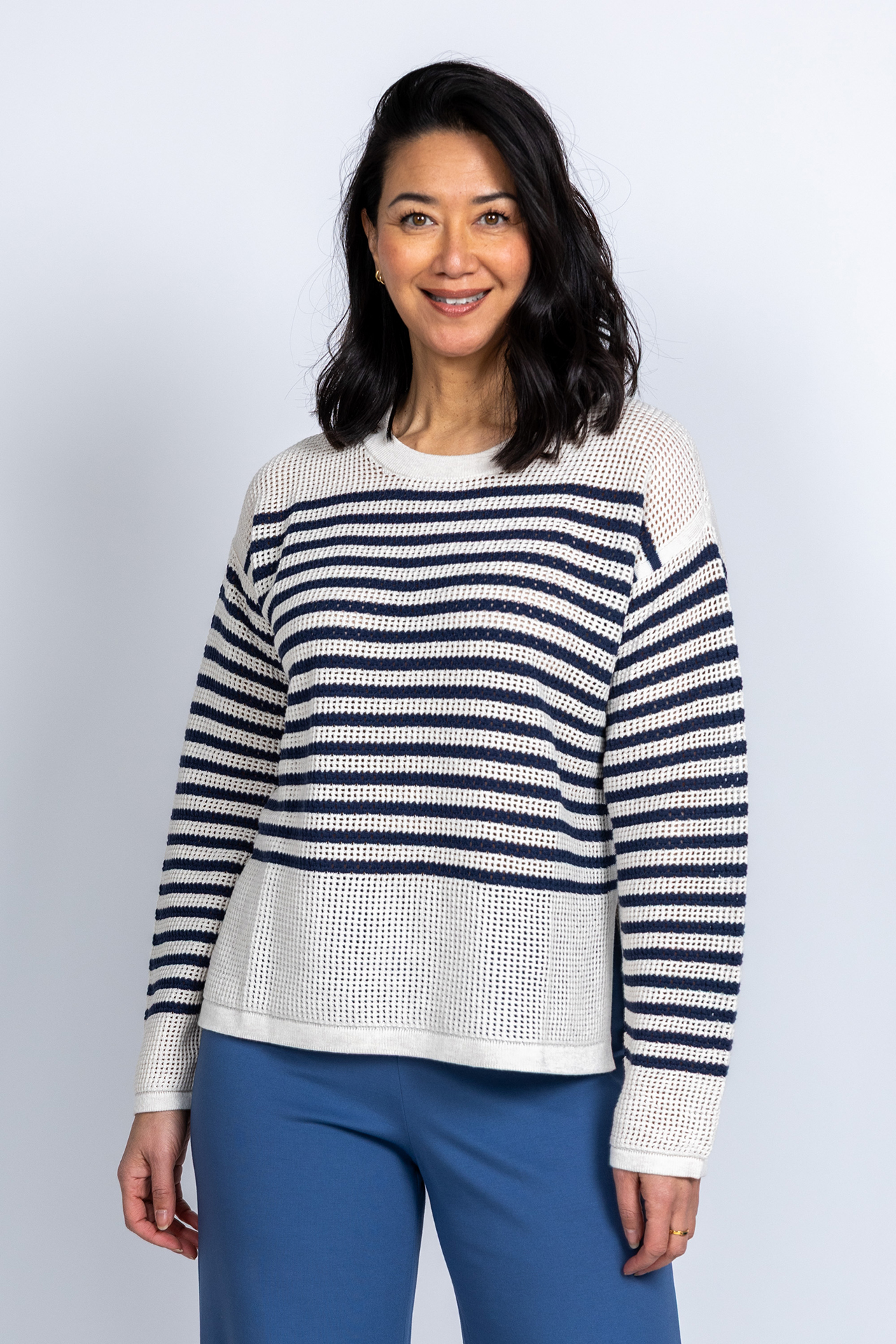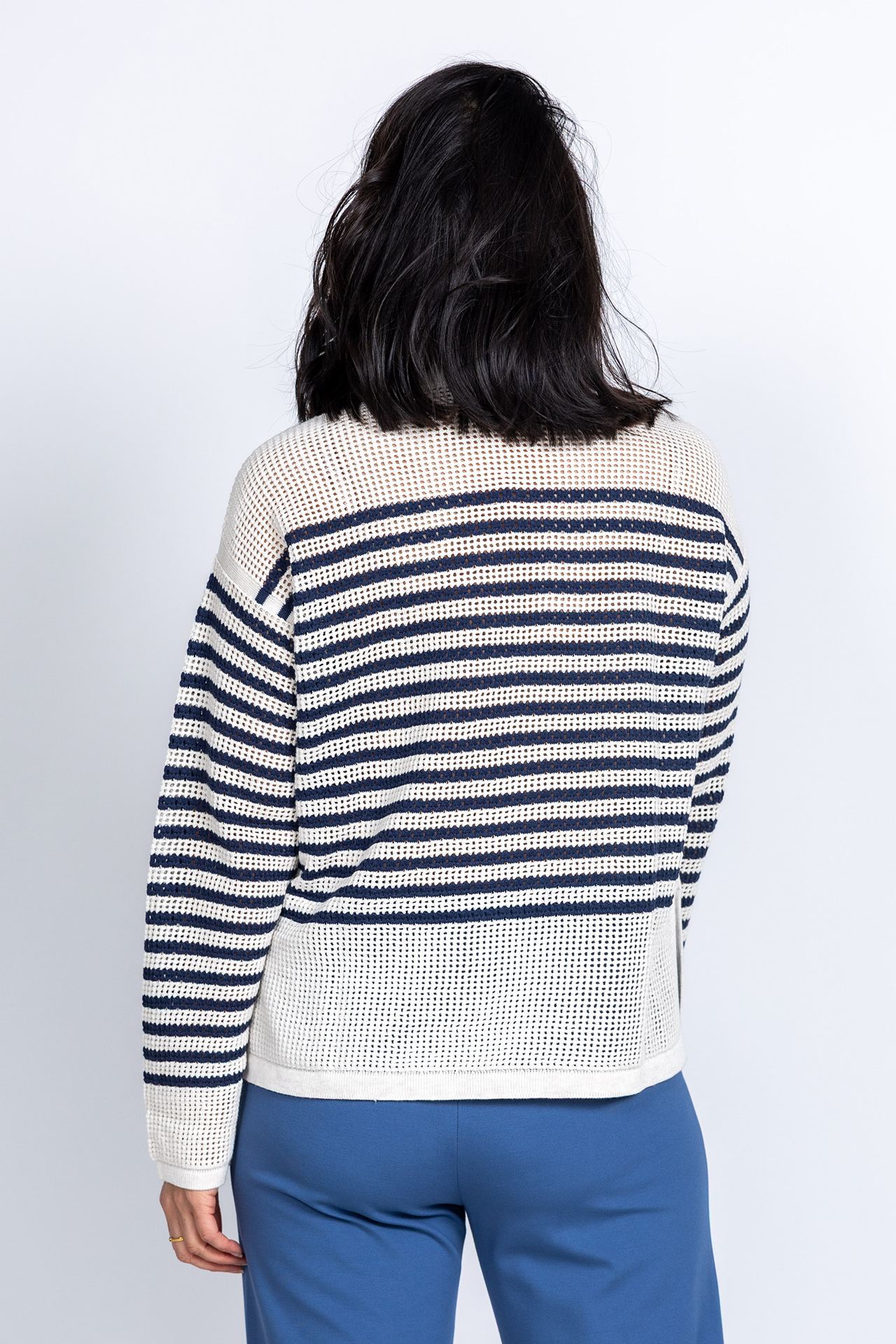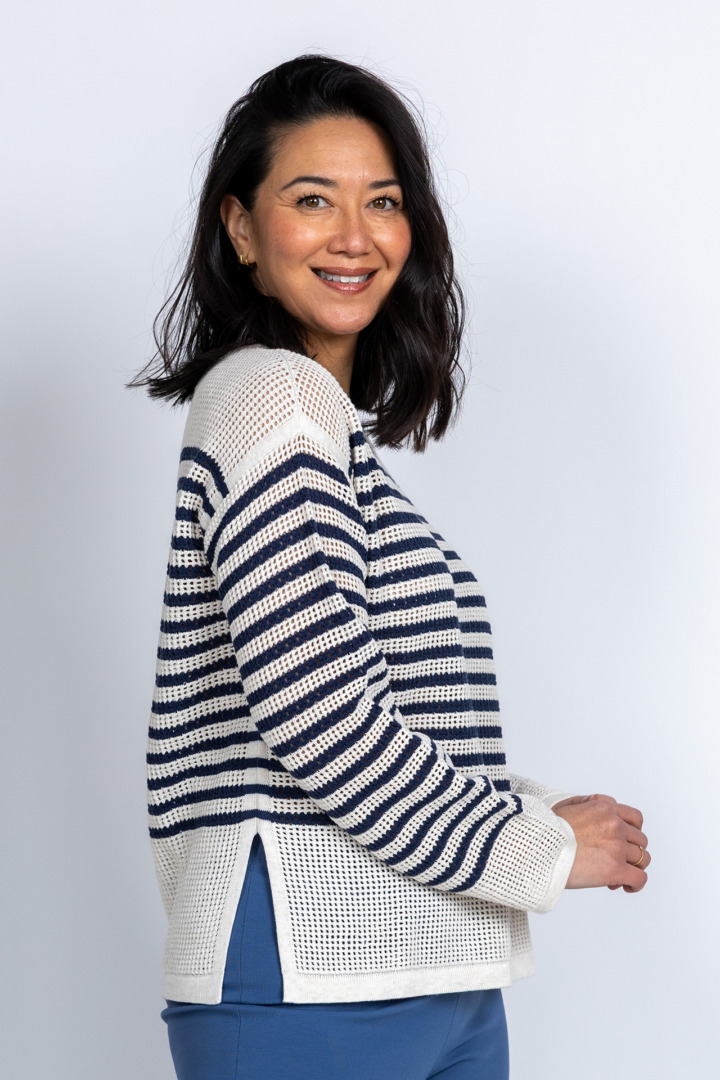 Opengewerkte trui met donkerblauwe strepen, splitten aan de zijkant en een ronde hals