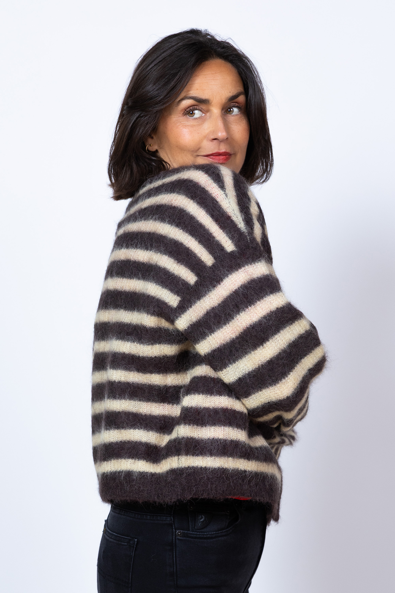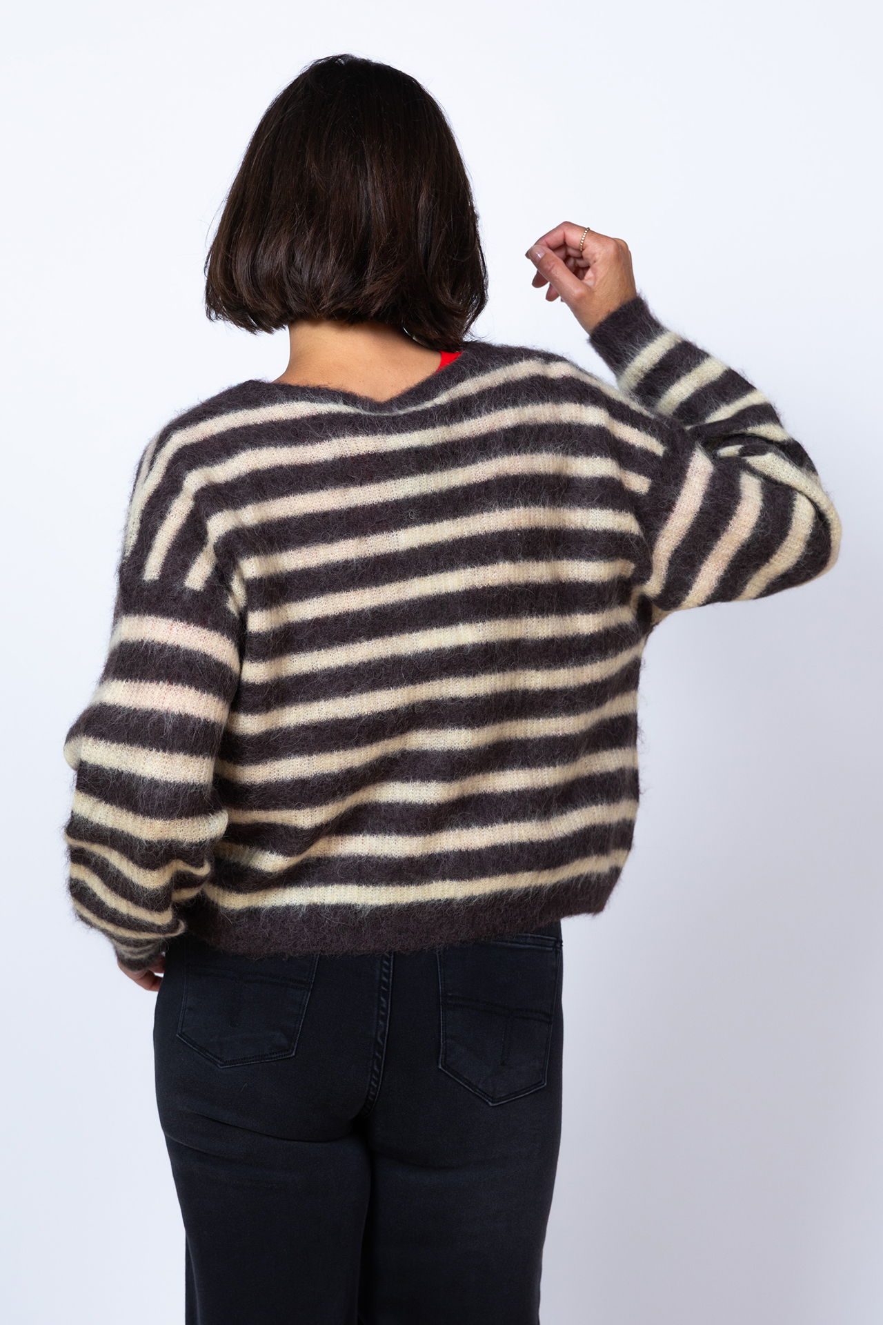 Gestreept alpacamix vest met een V-hals, knoopjes en het logo op de borst