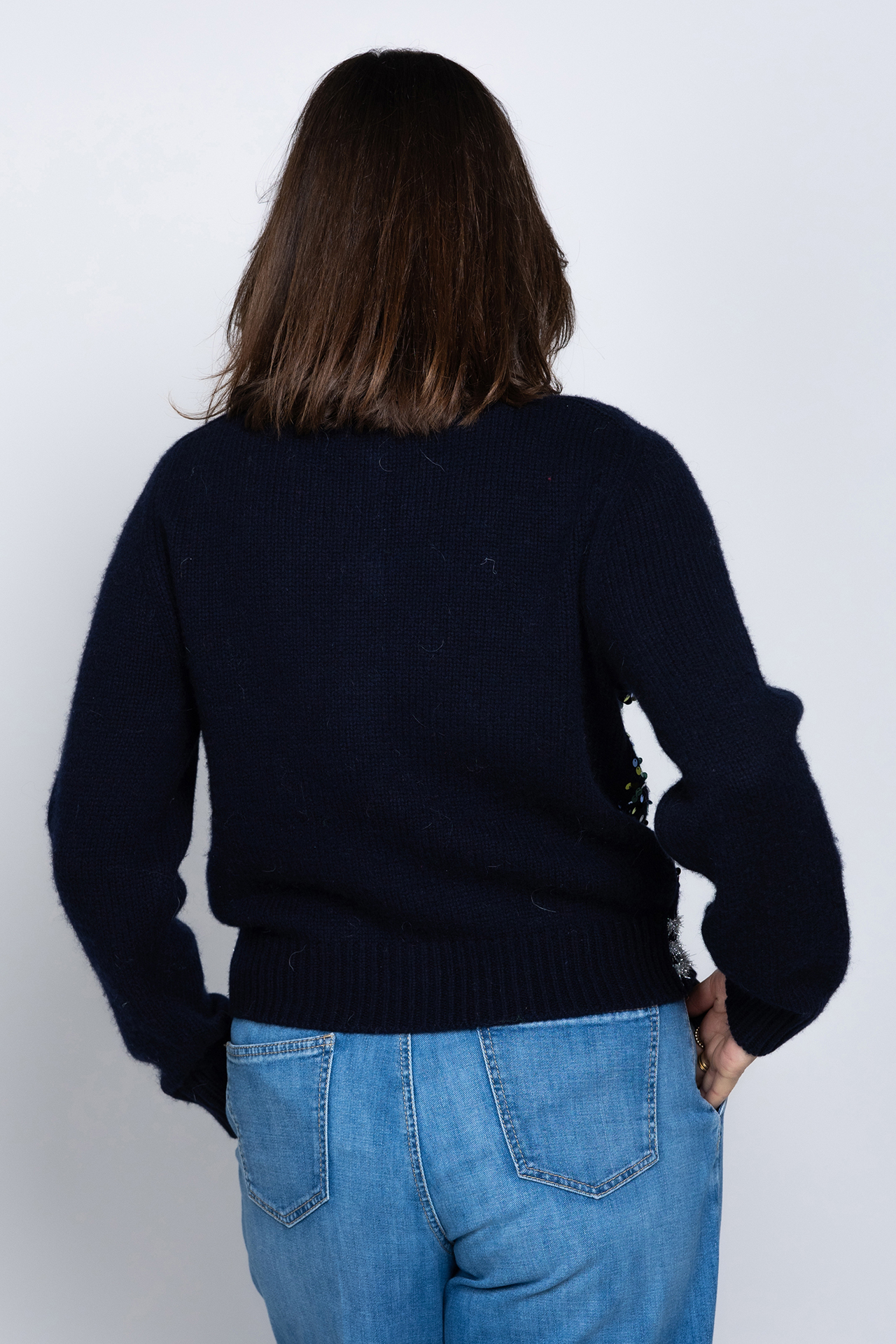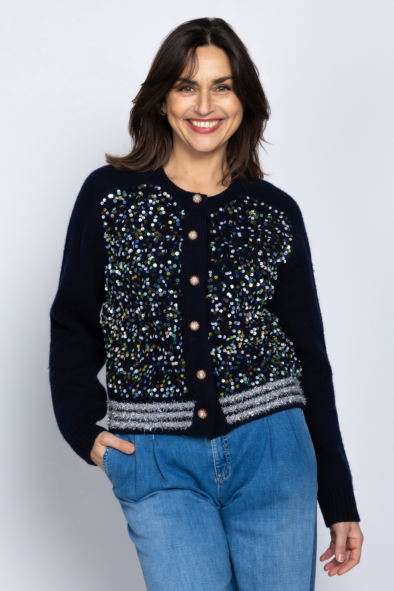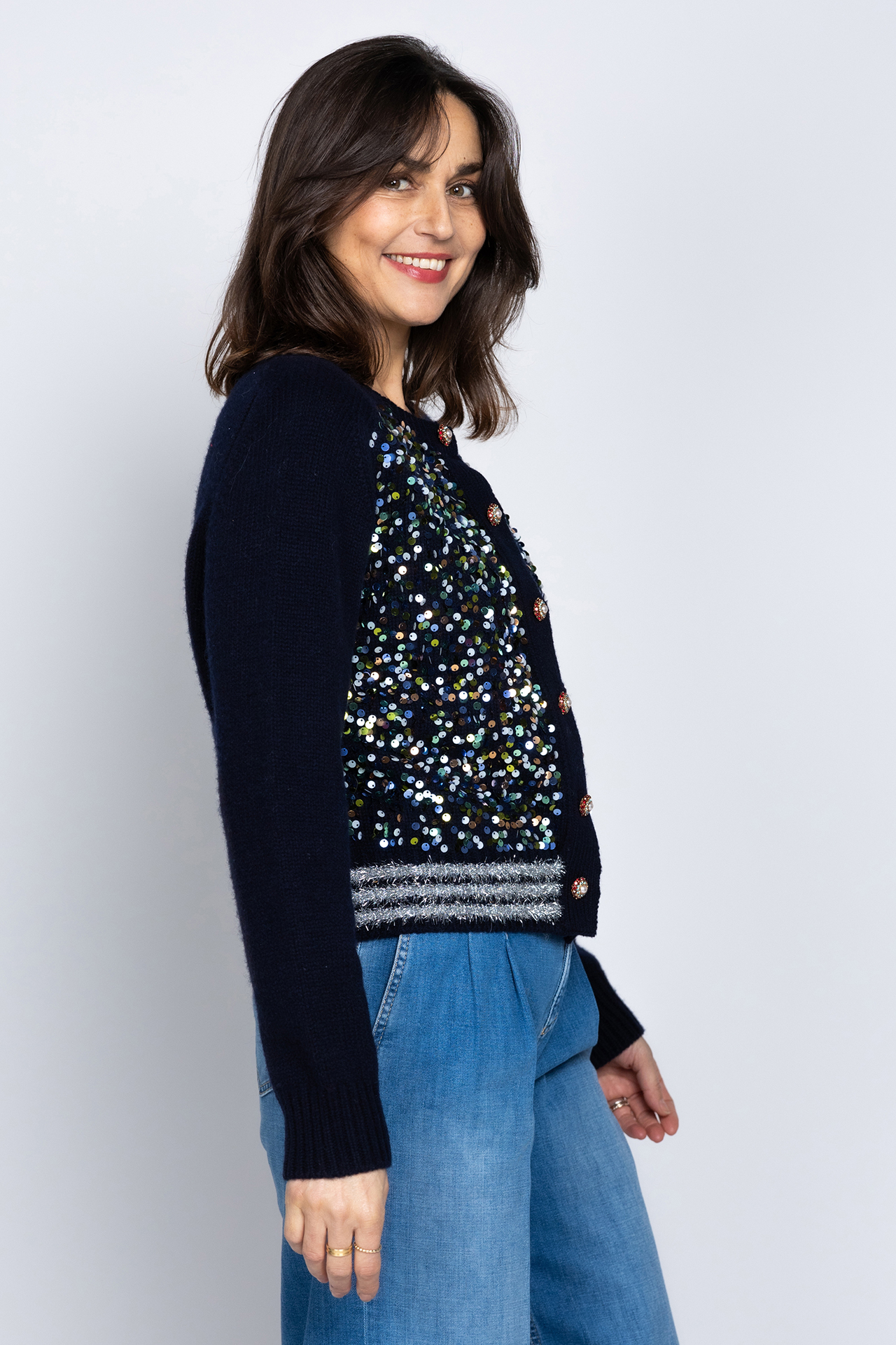 Gebreid vest met gekleurde pailletten, bijzondere knopen en zilverdraad aan de voorkant