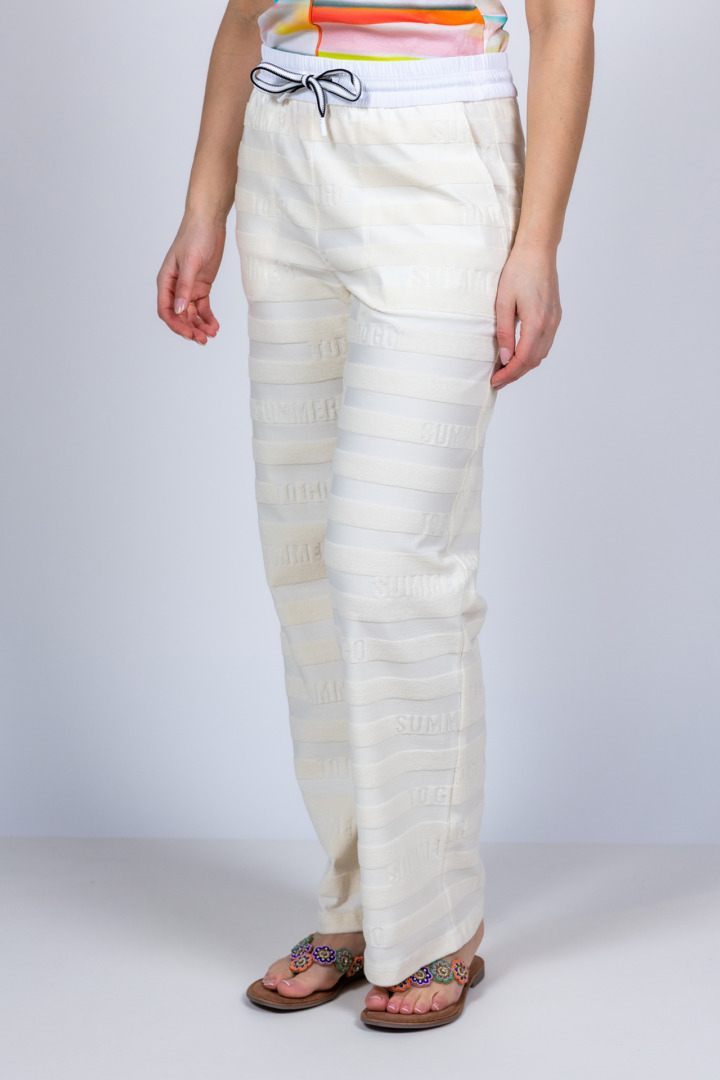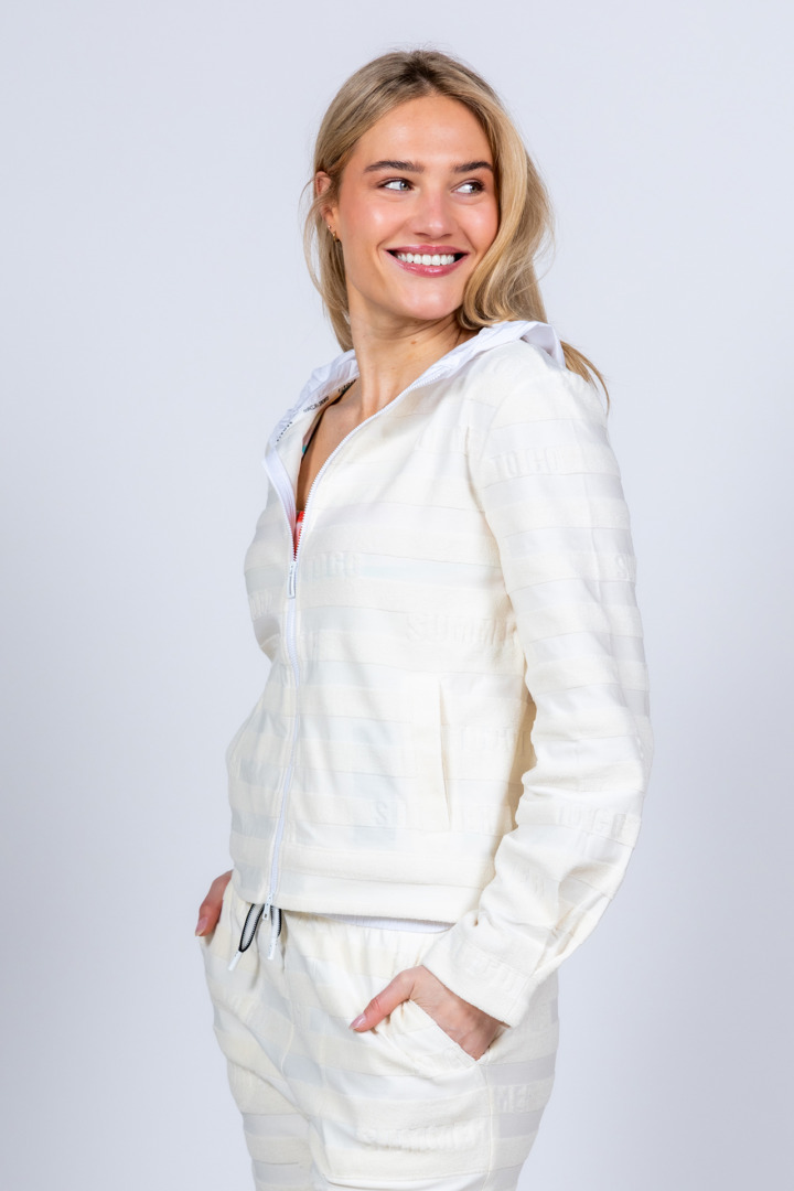 Vest met een ton sur ton streepdessin met tekst, dubbel deelbare ritssluiting, capuchon en steekzakken aan de voorkant