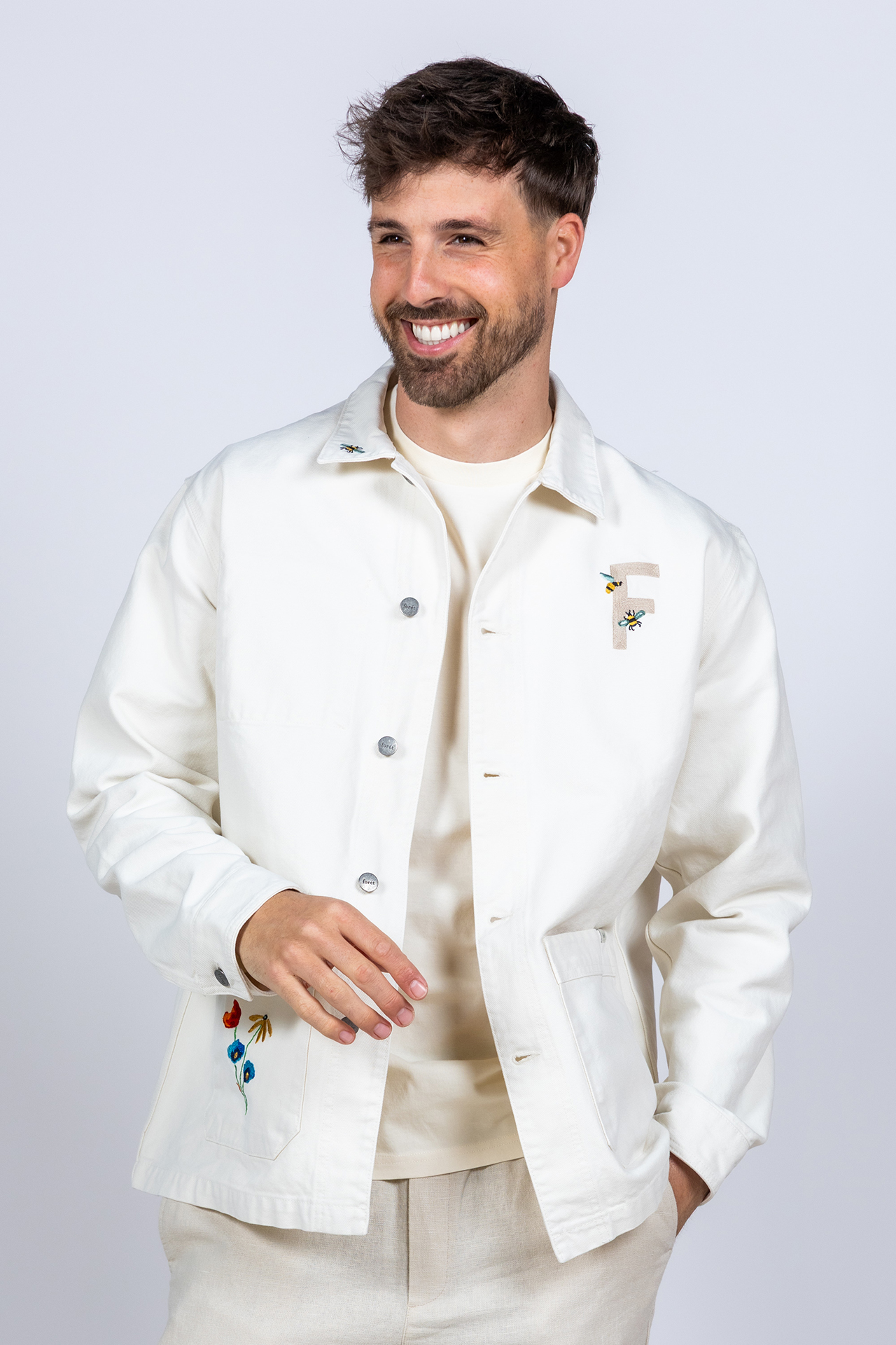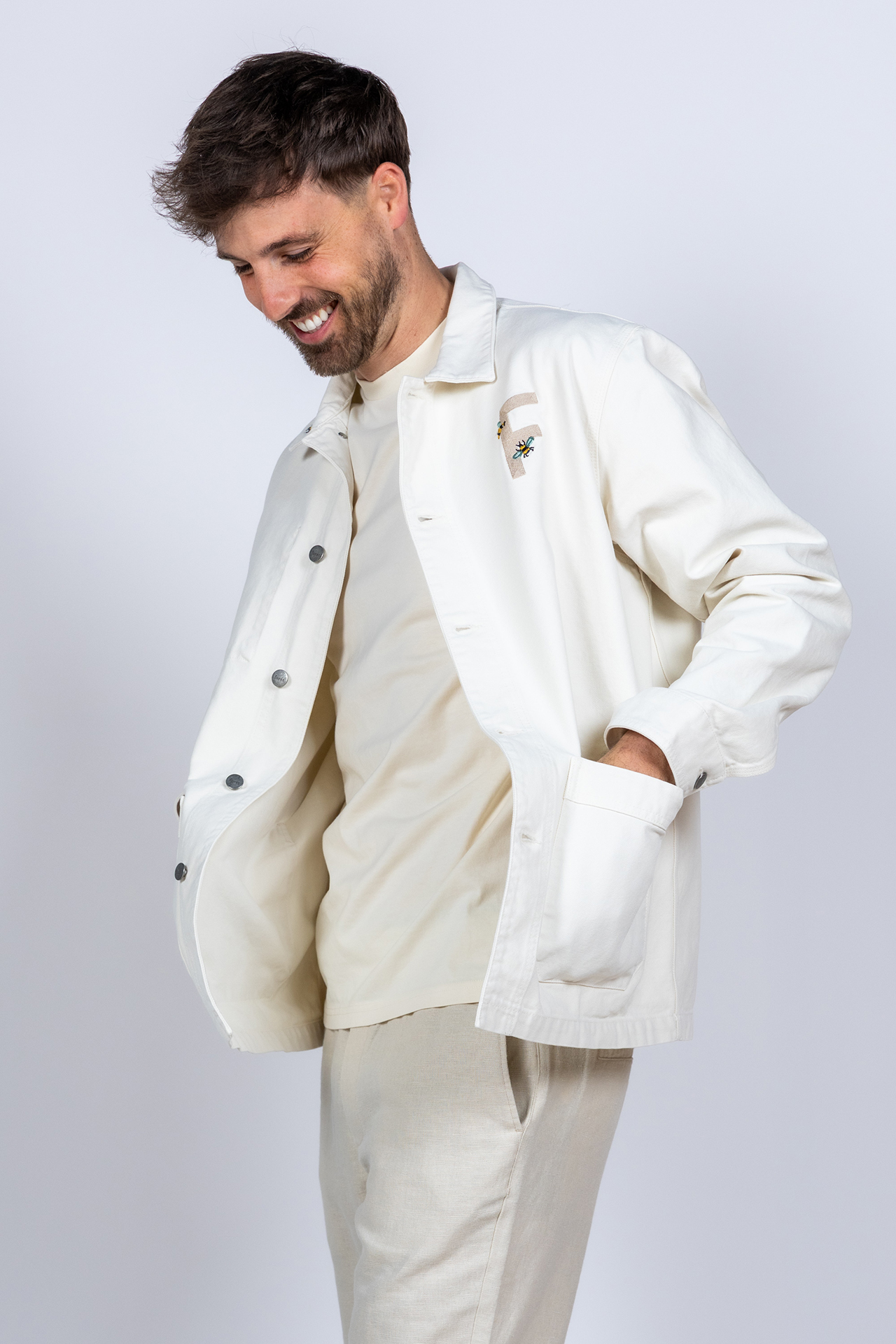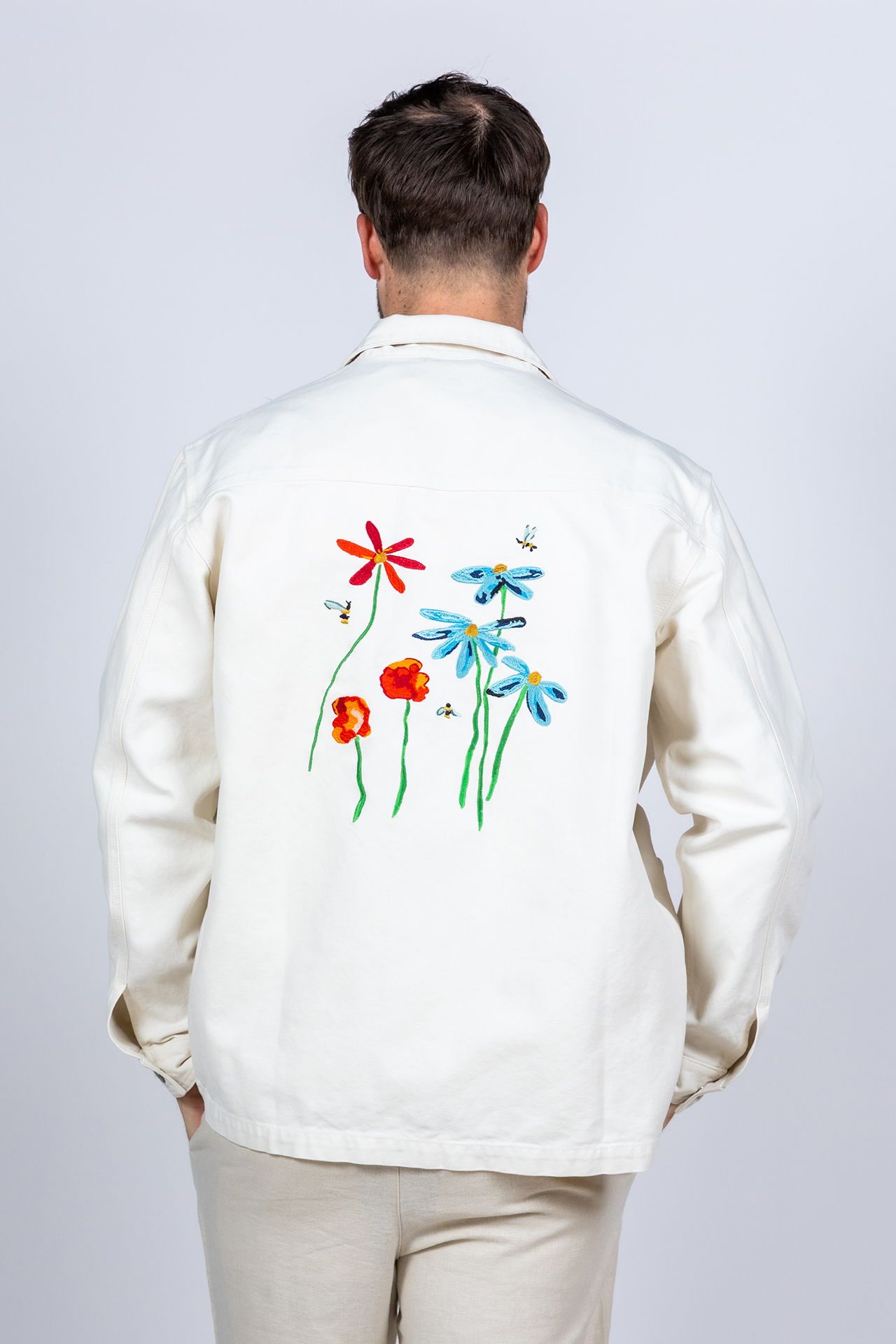 Jasje gemaakt van organisch katoen met lange mouwen en knopen. Hij heeft een kraag en geborduurde bloemen aan de voor- en achterkant