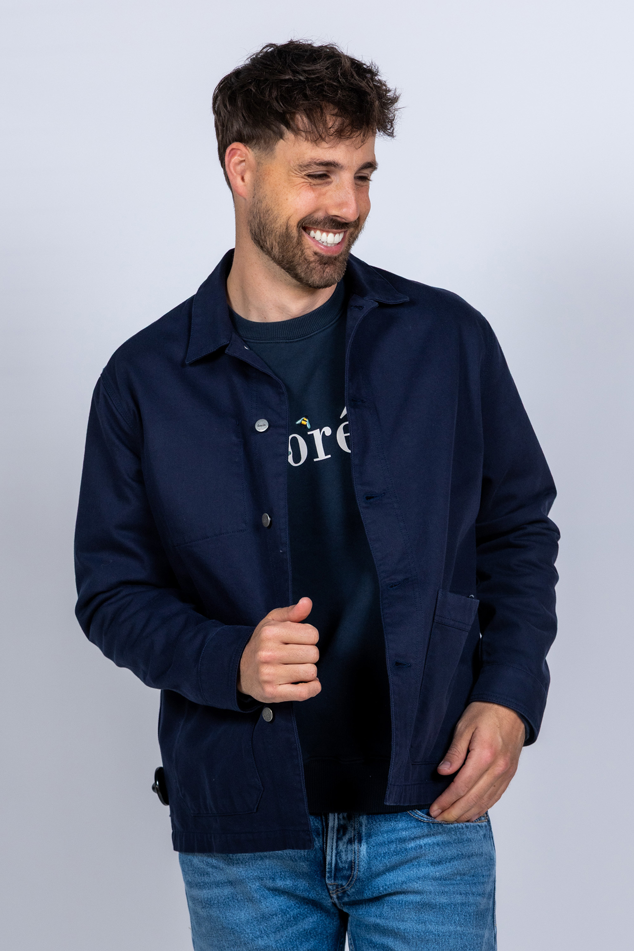 Jasje met opgestikte zakken aan de voorkant, de merknaam aan de achterkant geborduurd en hij is gemaakt van organisch katoen