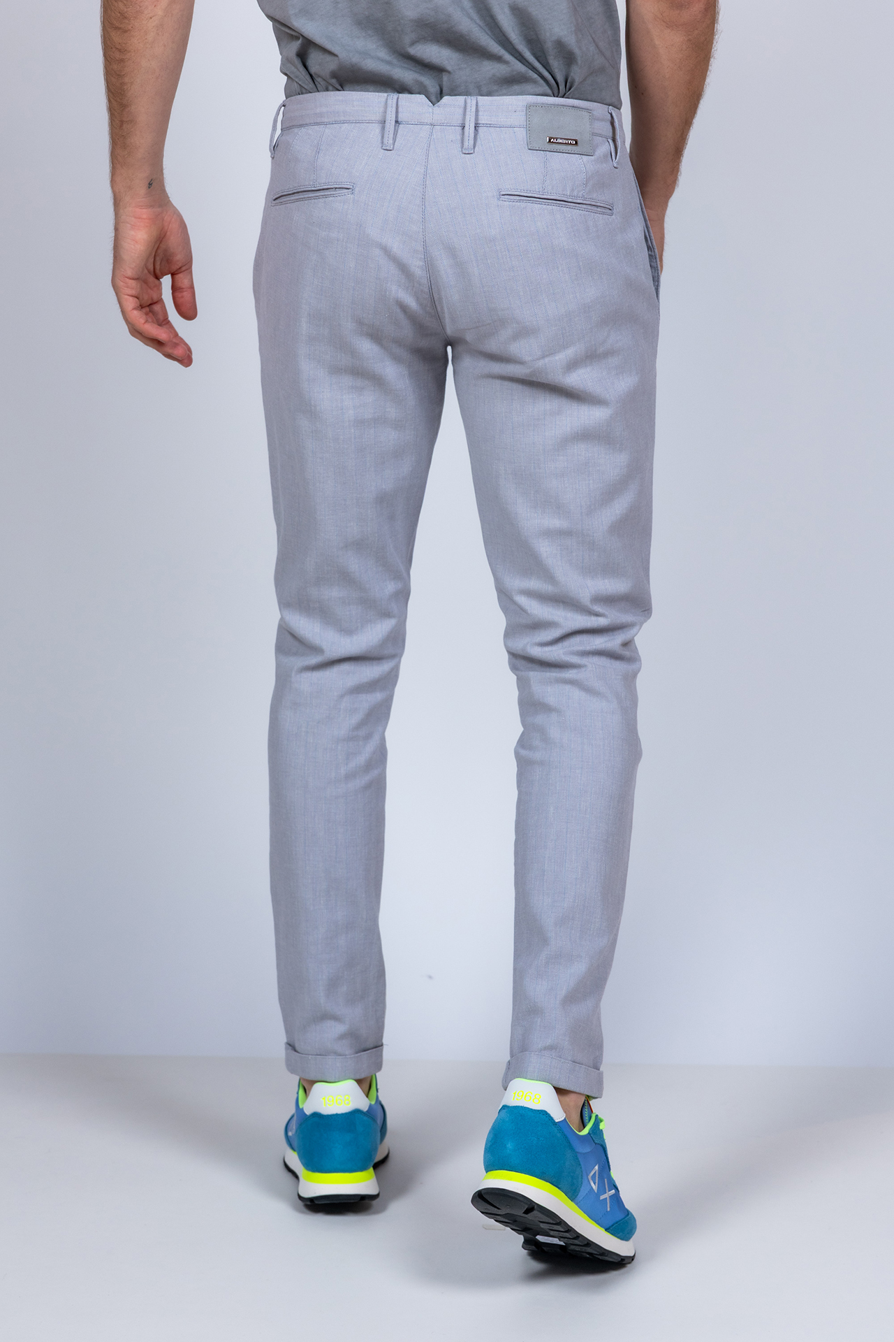 Krijtstreep broek met een knoop- en ritssluiting en lusjes in de band voor een ceintuur. Hij heeft steekzakken aan de voorkant, paspelzakken aan de achterkant en stretch in de stof waardoor hij comfortabel draagt
