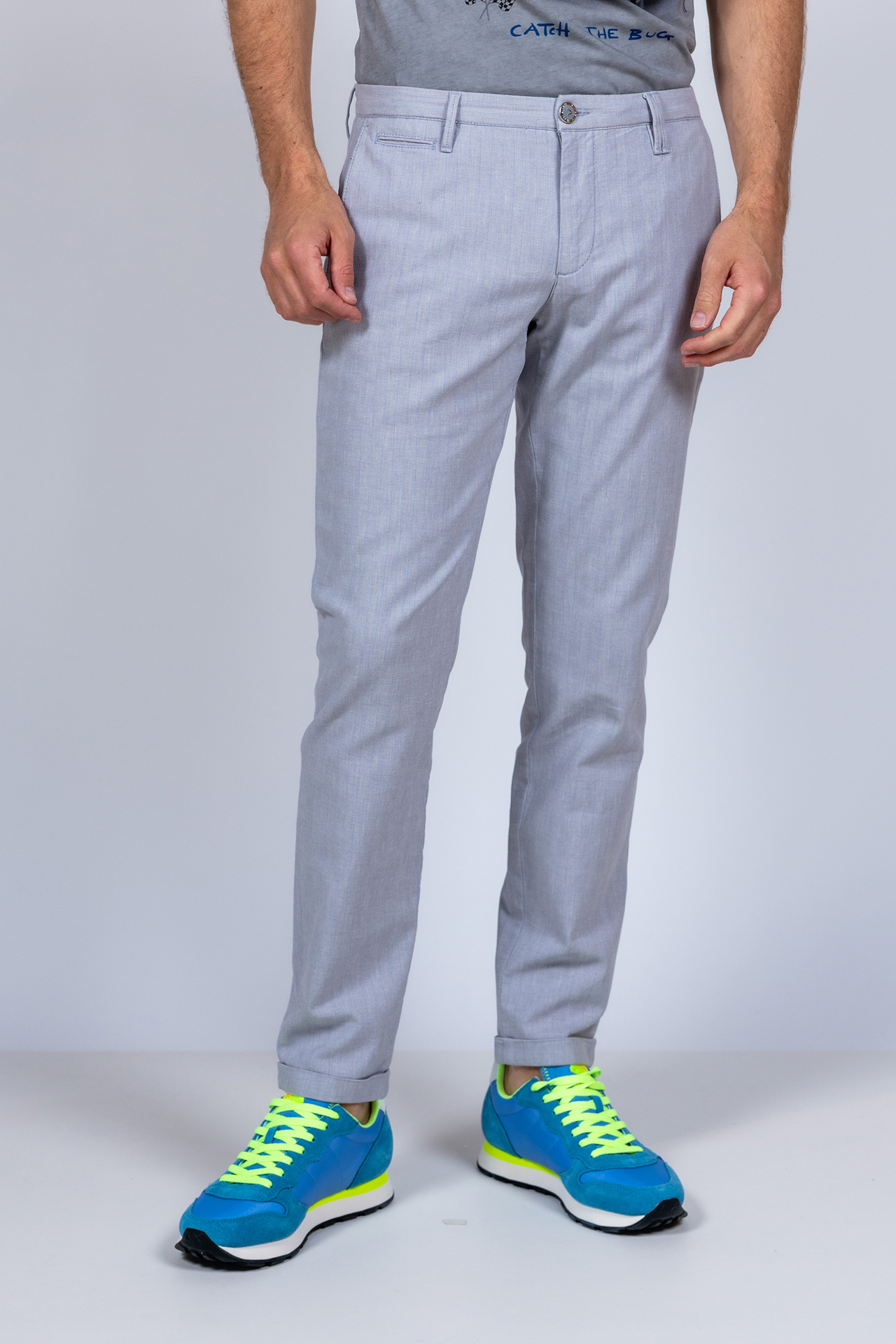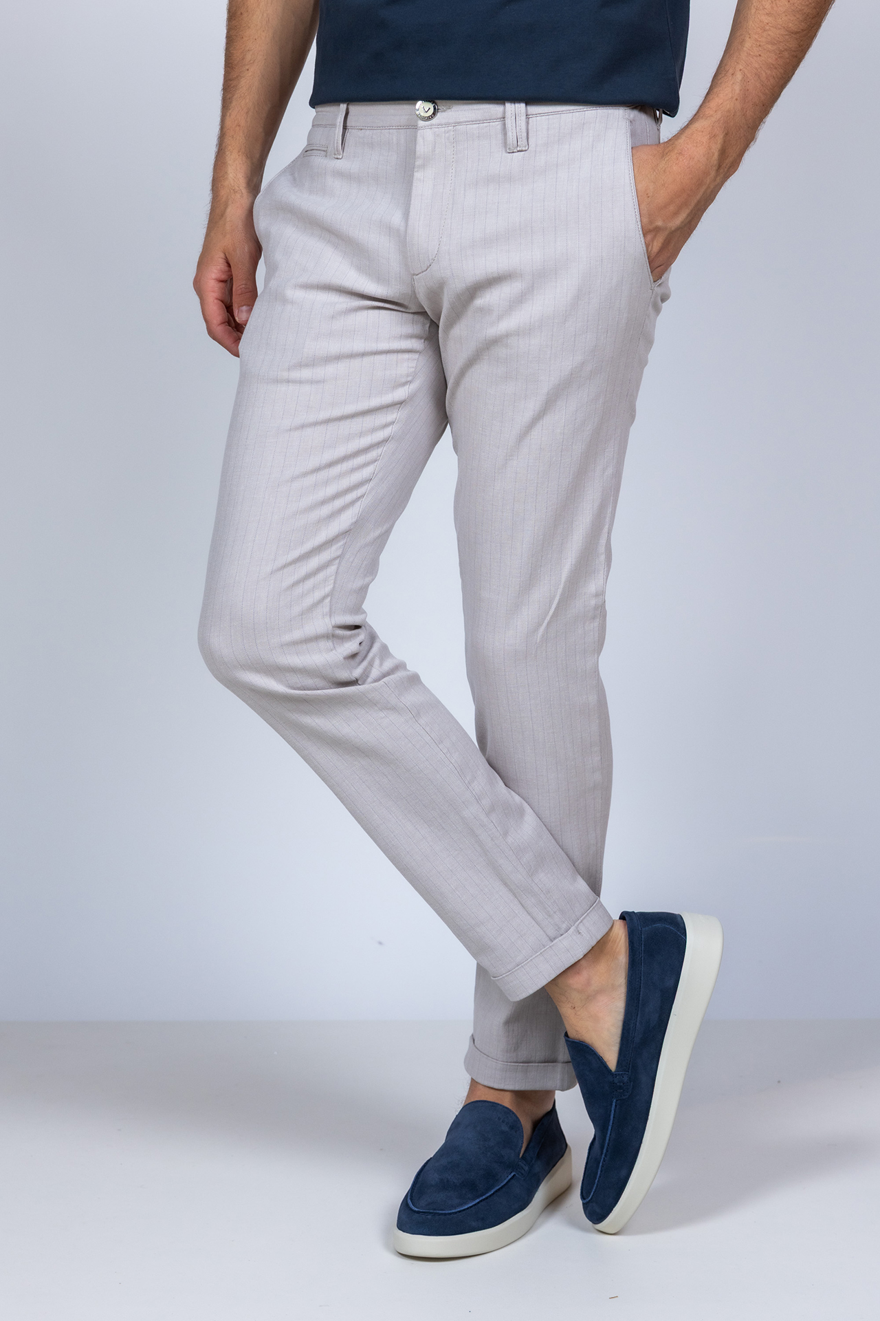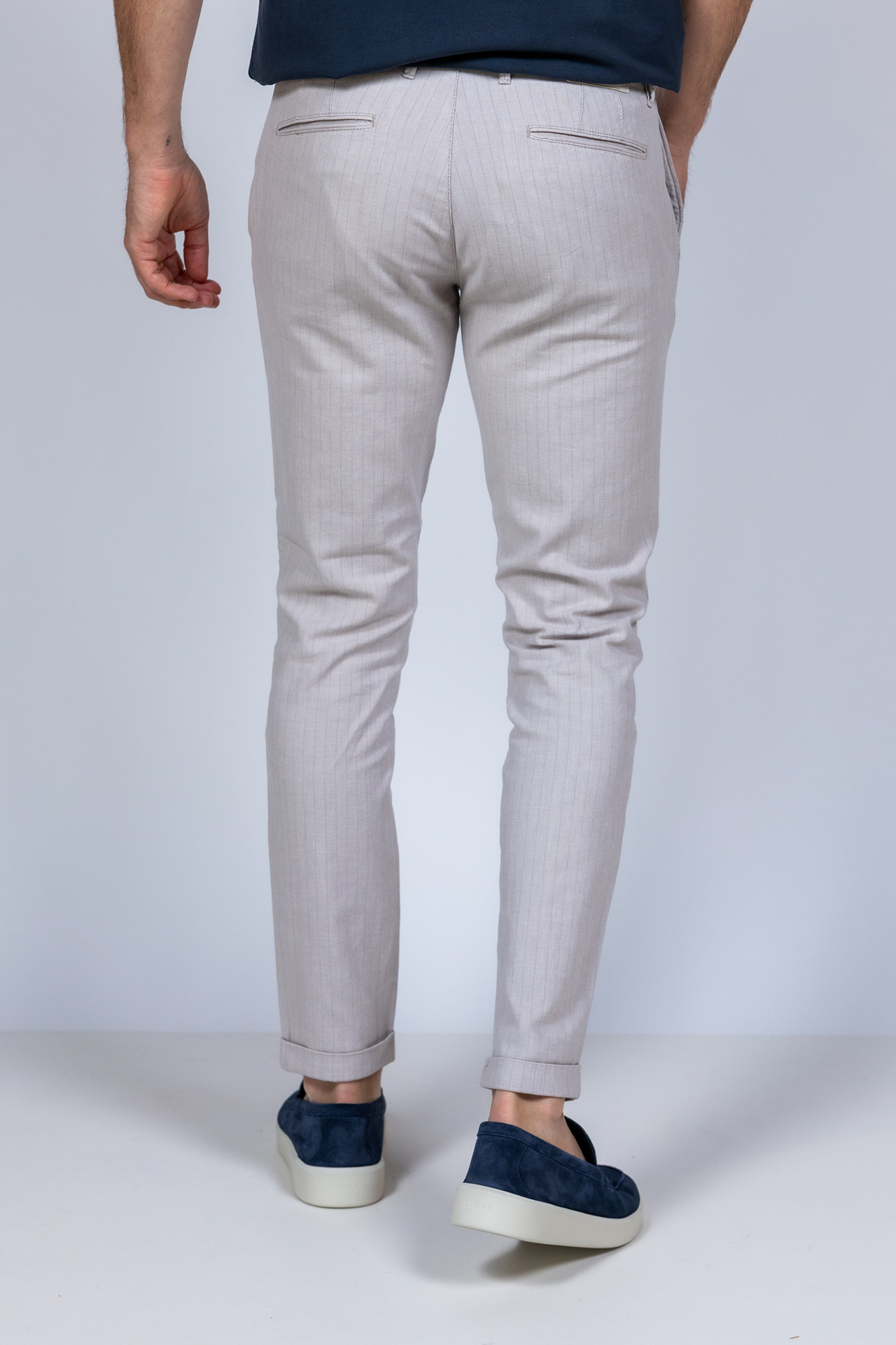 Krijtstreep broek met een knoop- en ritssluiting en lusjes in de band voor een ceintuur. Hij heeft steekzakken aan de voorkant, paspelzakken aan de achterkant en stretch in de stof waardoor hij comfortabel draagt