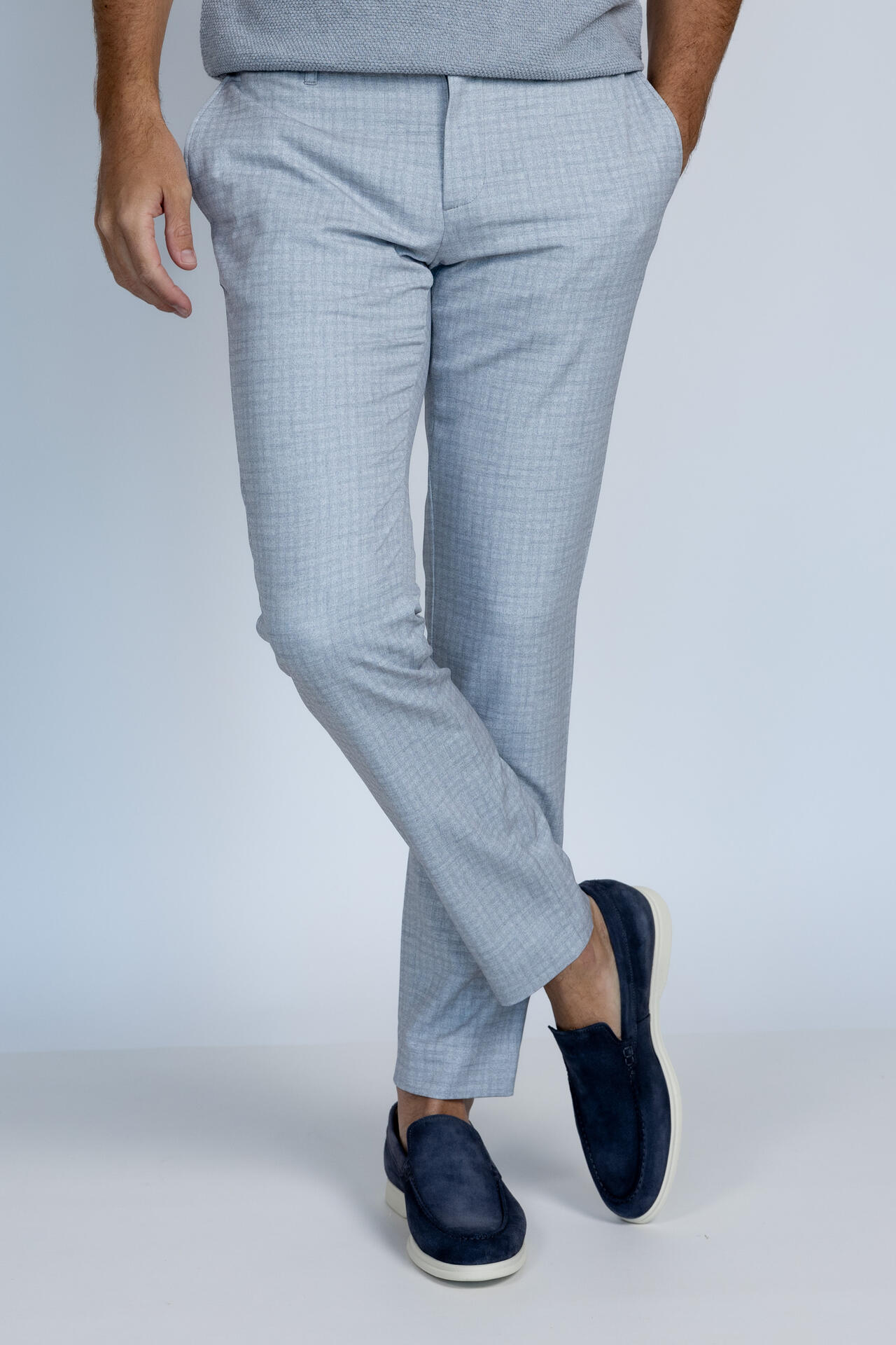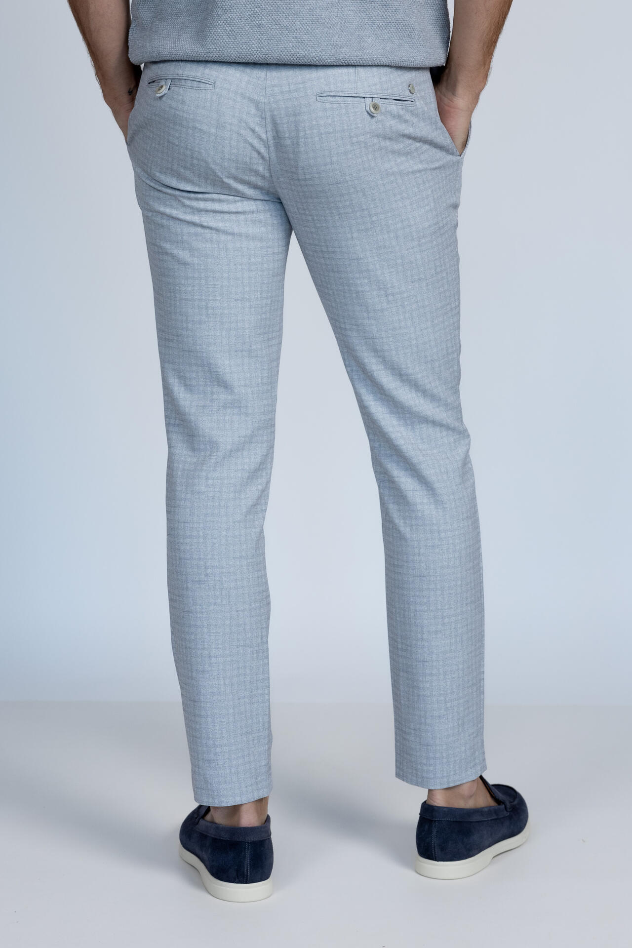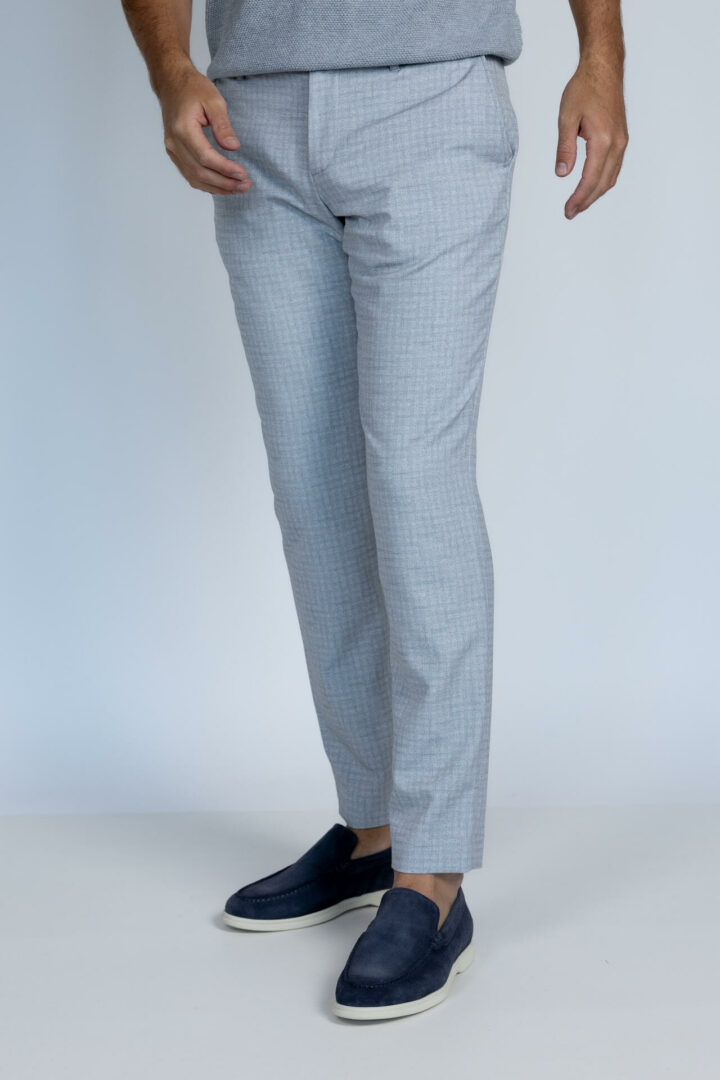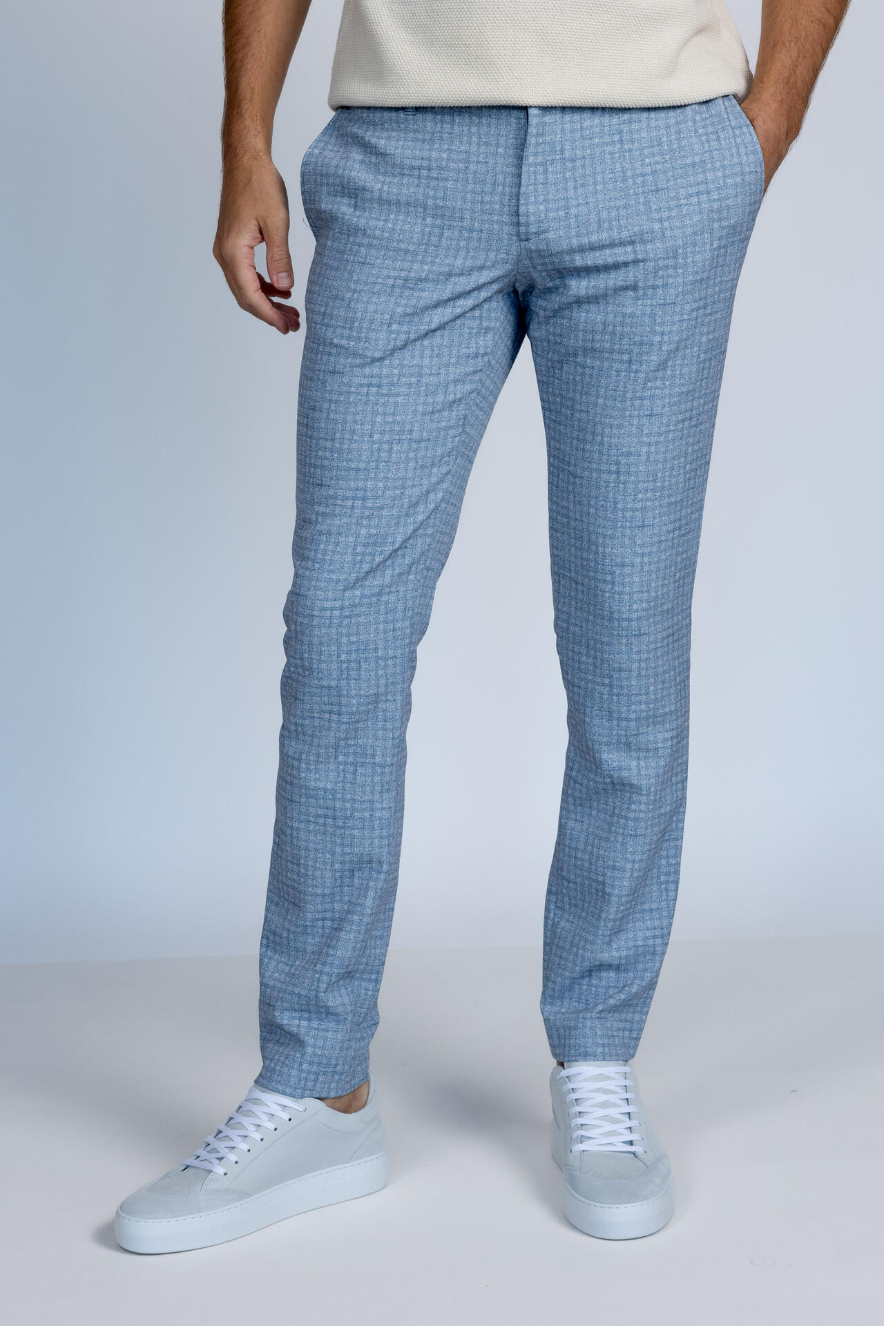 Geruite broek met een knoop- en ritssluiting en lusjes in de band voor een ceintuur. Hij heeft steekzakken aan de voorkant, paspelzakken aan de achterkant en stretch in de stof waardoor hij comfortabel draagt