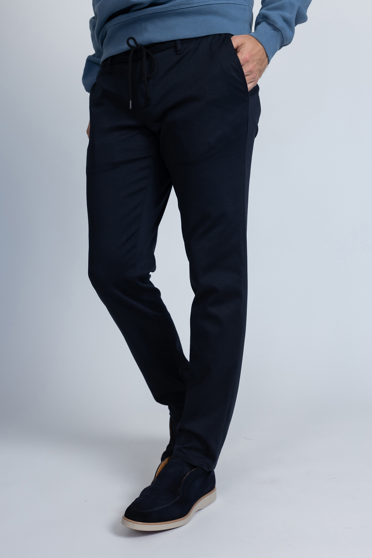 Broek met een knoop- en ritssluiting, lusjes en een koordje in de band, steekzakken aan de voorkant en fake zakken aan de achterkant