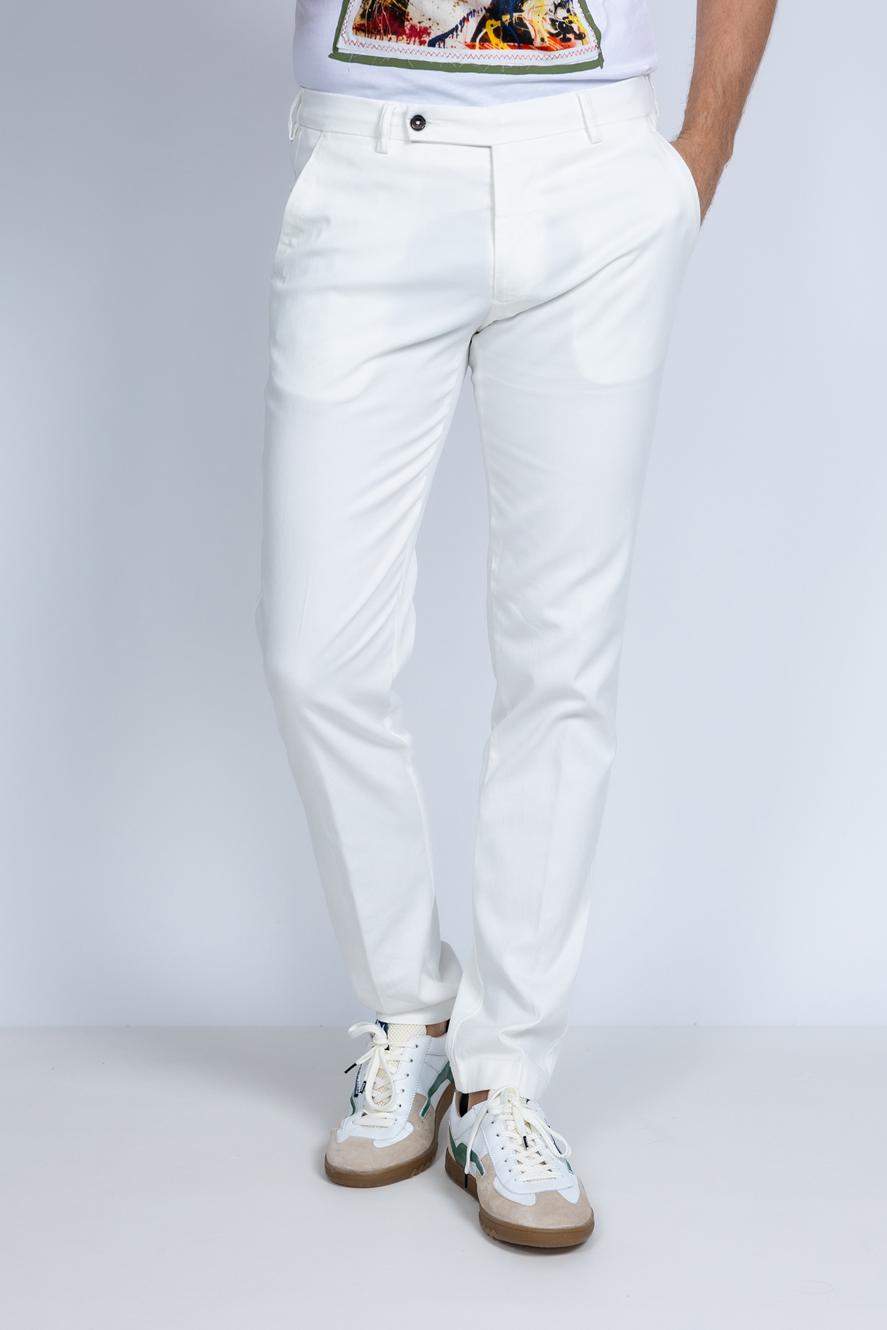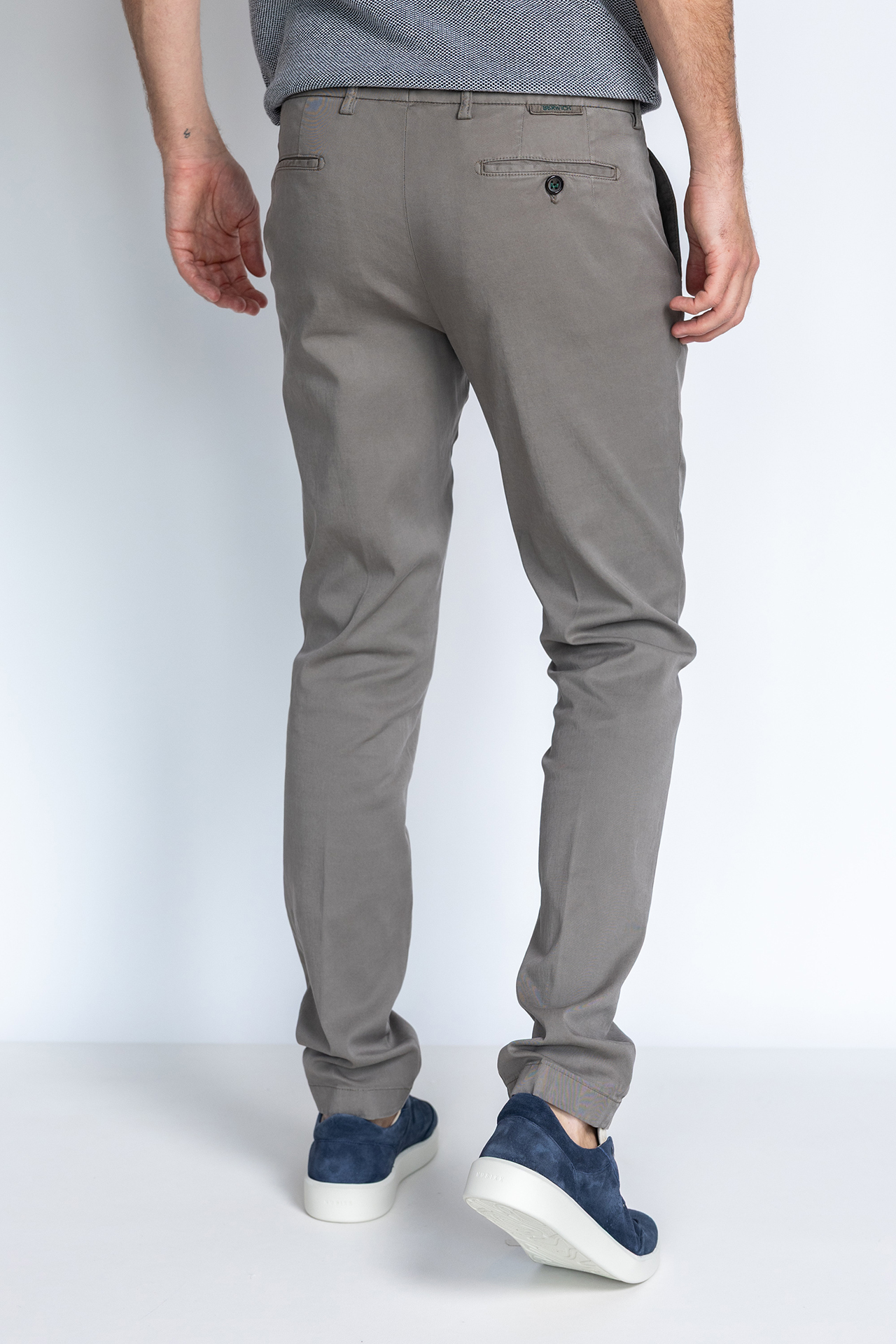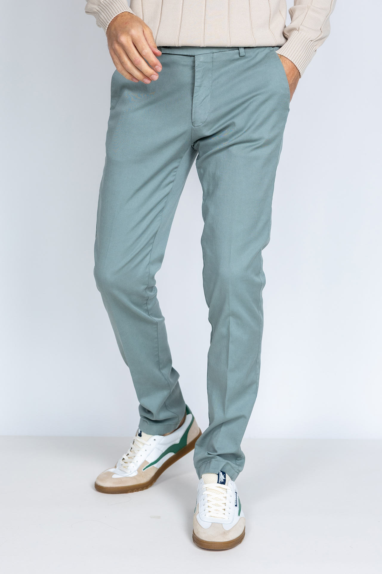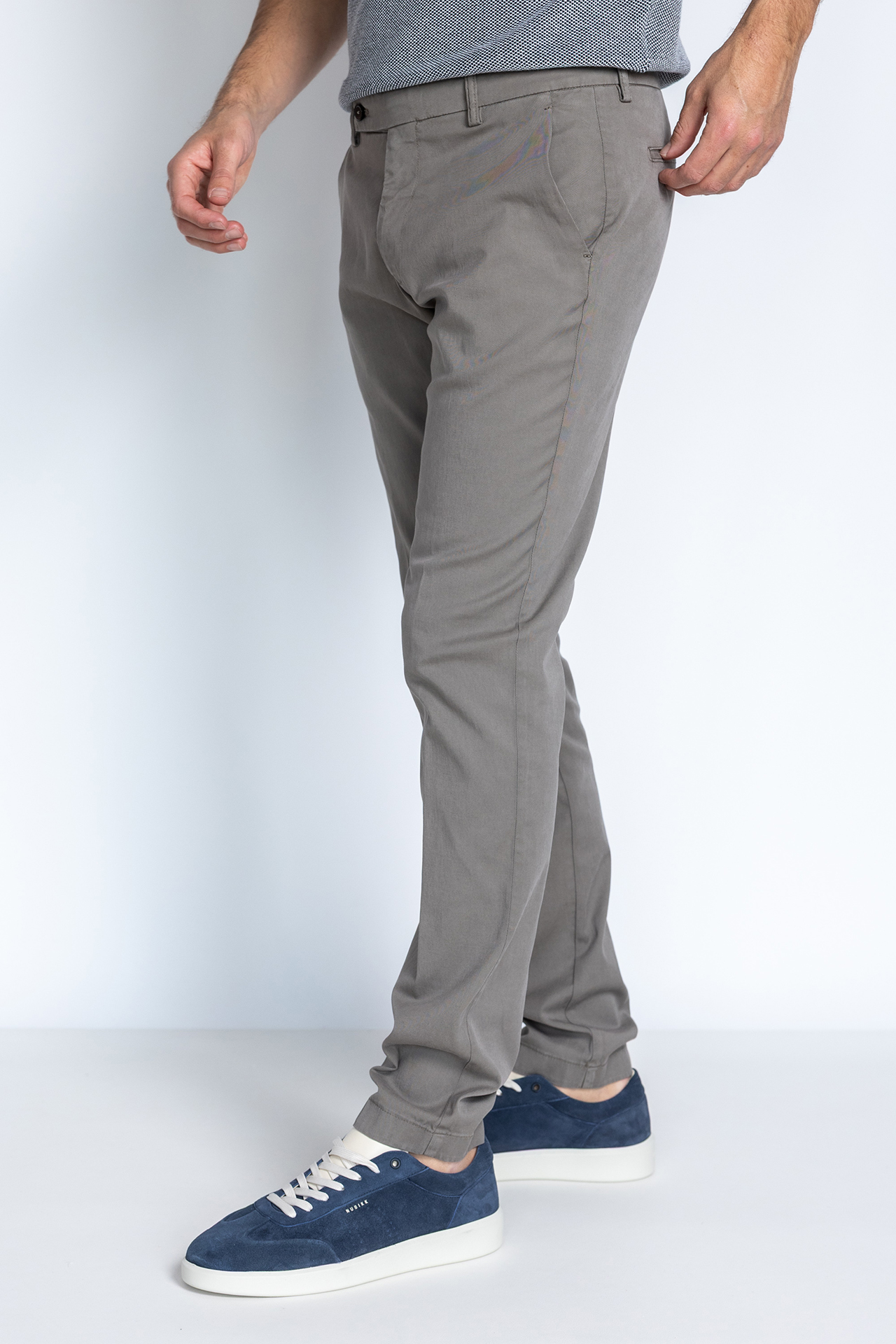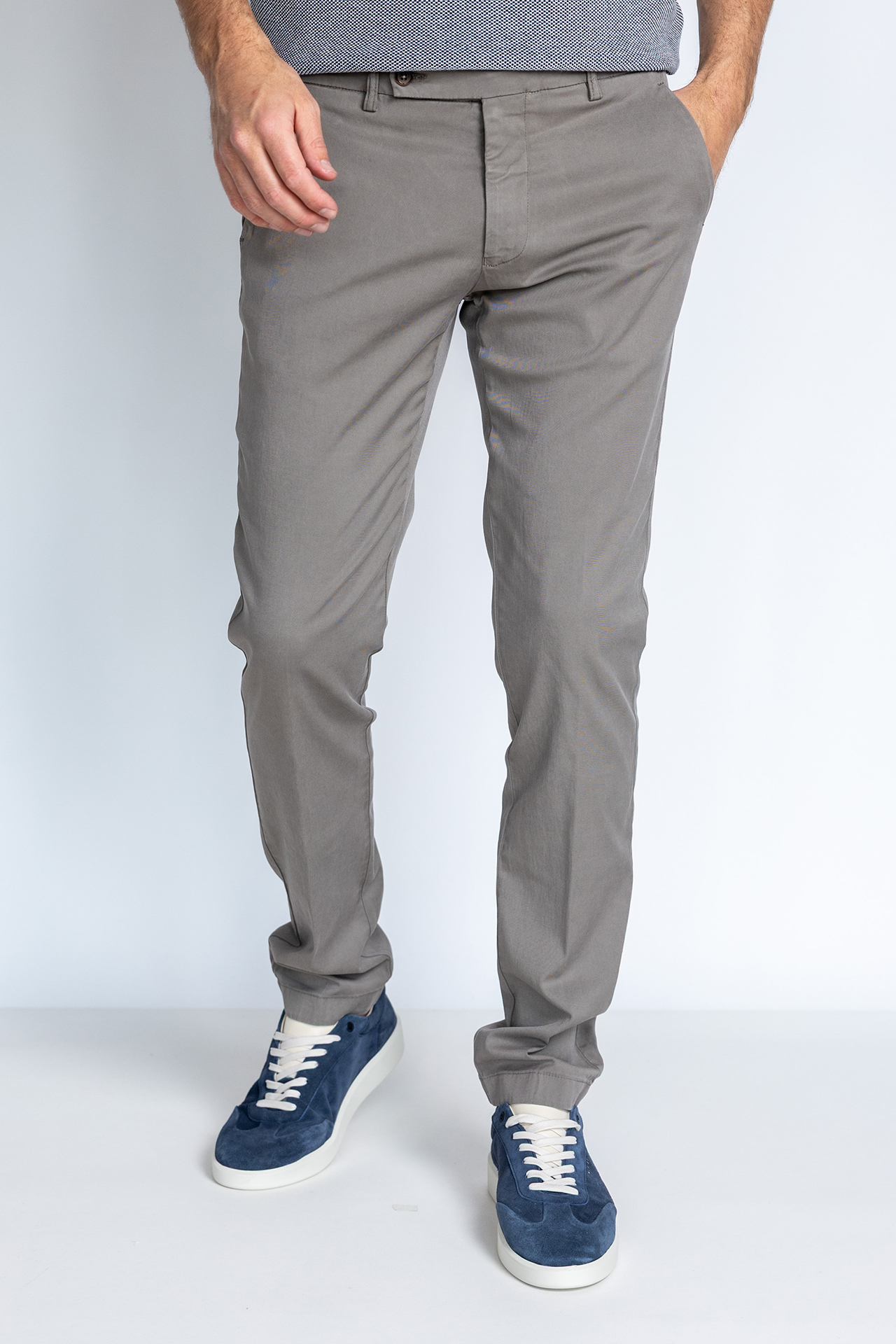 Chino met een knoop- en ritssluiting en lusjes in de band voor een ceintuur. Hij heeft steekzakken aan de voorkant, paspelzakken aan de achterkant en een klein beetje stretch in de stof waardoor hij comfortabel draagt