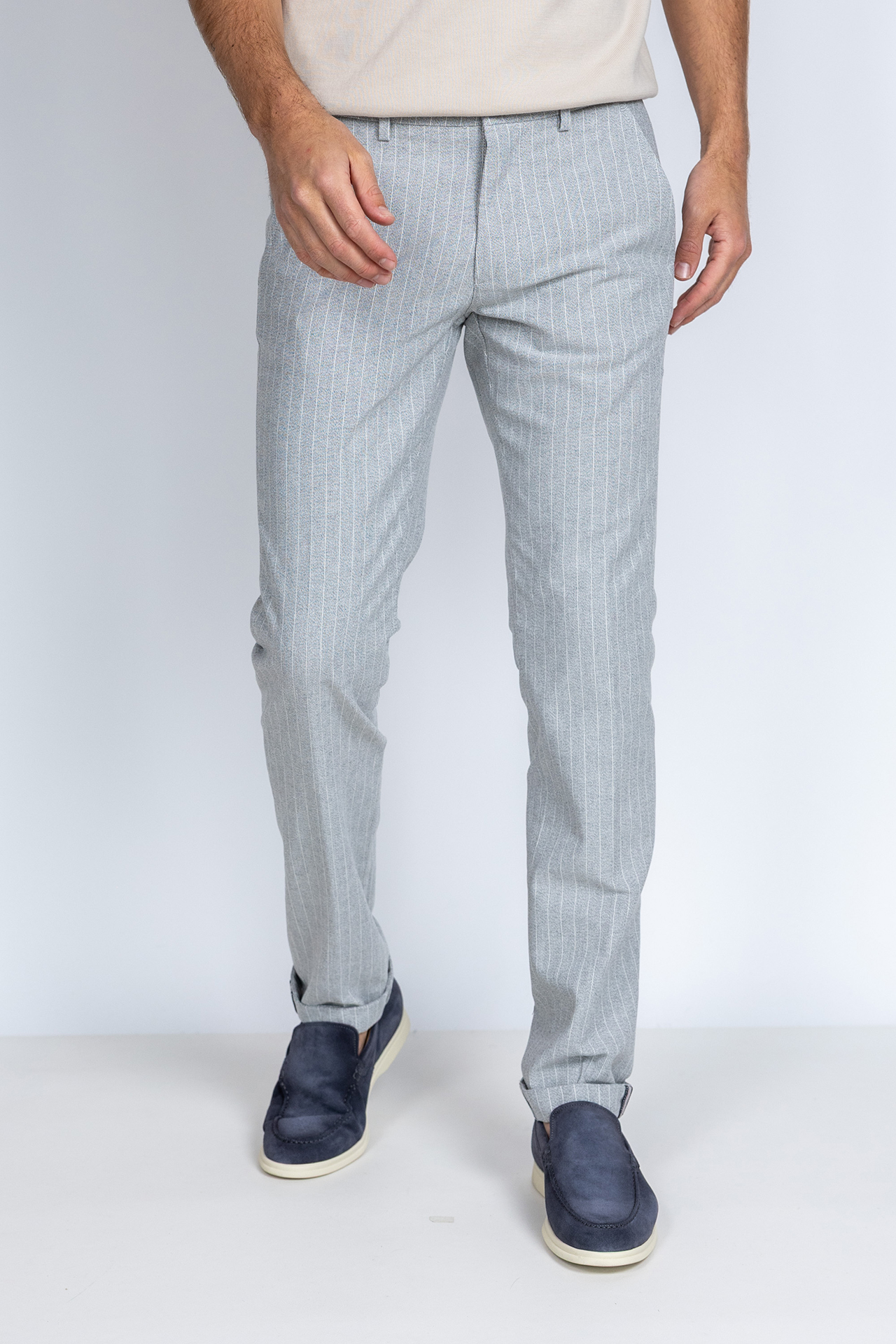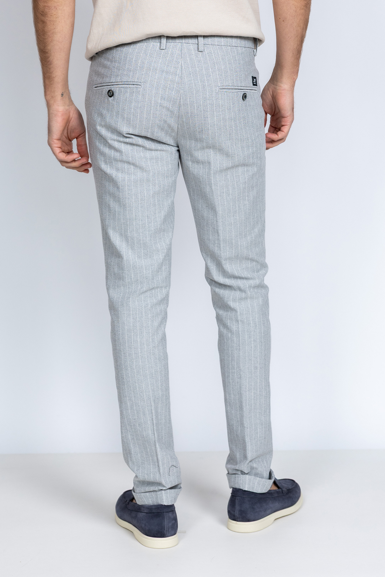 Krijtstreep broek met lusjes in de band voor een ceintuur, steekzakken aan de voorkant en paspelzakken aan de achterkant