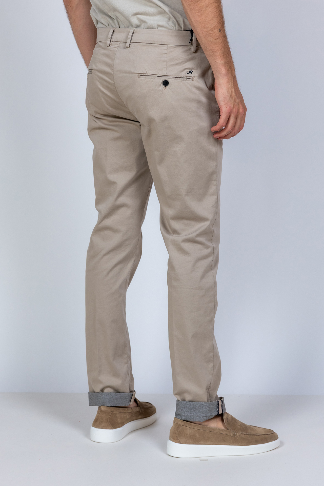 Chino met een knoop- en ritssluiting en lusjes in de band voor een ceintuur. Hij heeft steekzakken aan de voorkant, paspelzakken aan de achterkant en stretch in de stof waardoor hij comfortabel zit