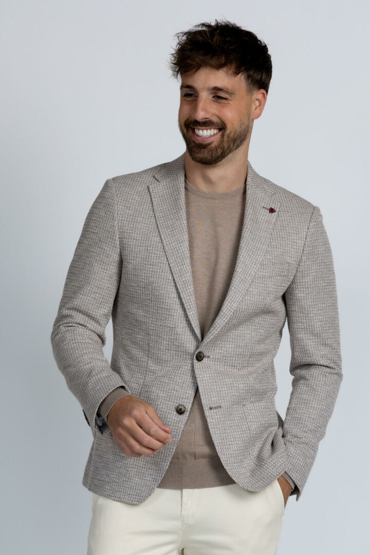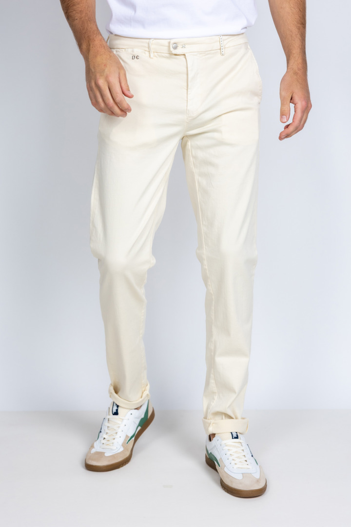 Chino met een knoop- en ritssluiting en lusjes in de band voor een ceintuur. Hij heeft steekzakken aan de voorkant, fake zakken aan de achterkant en stretch in de stof waardoor hij lekker draagt
