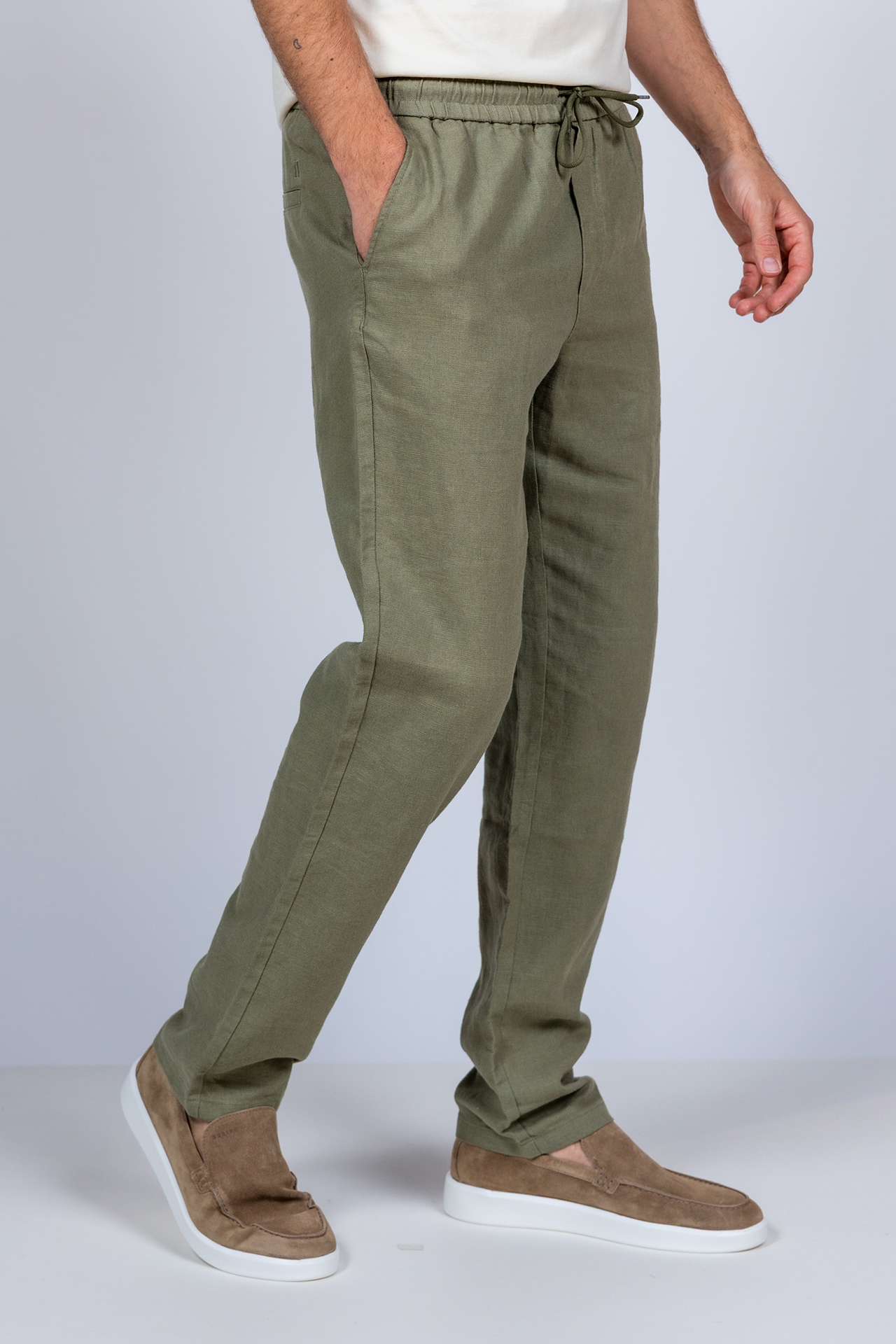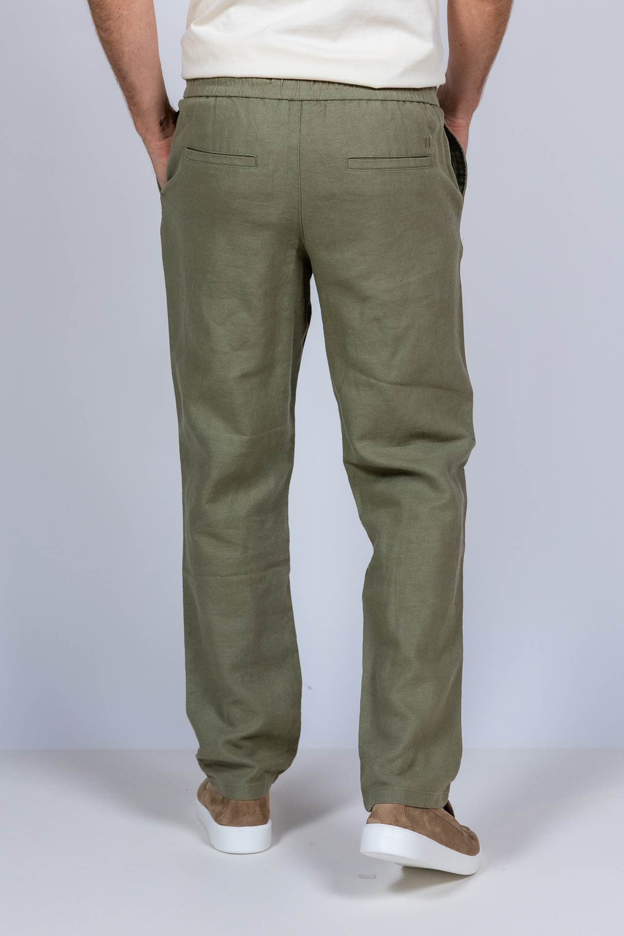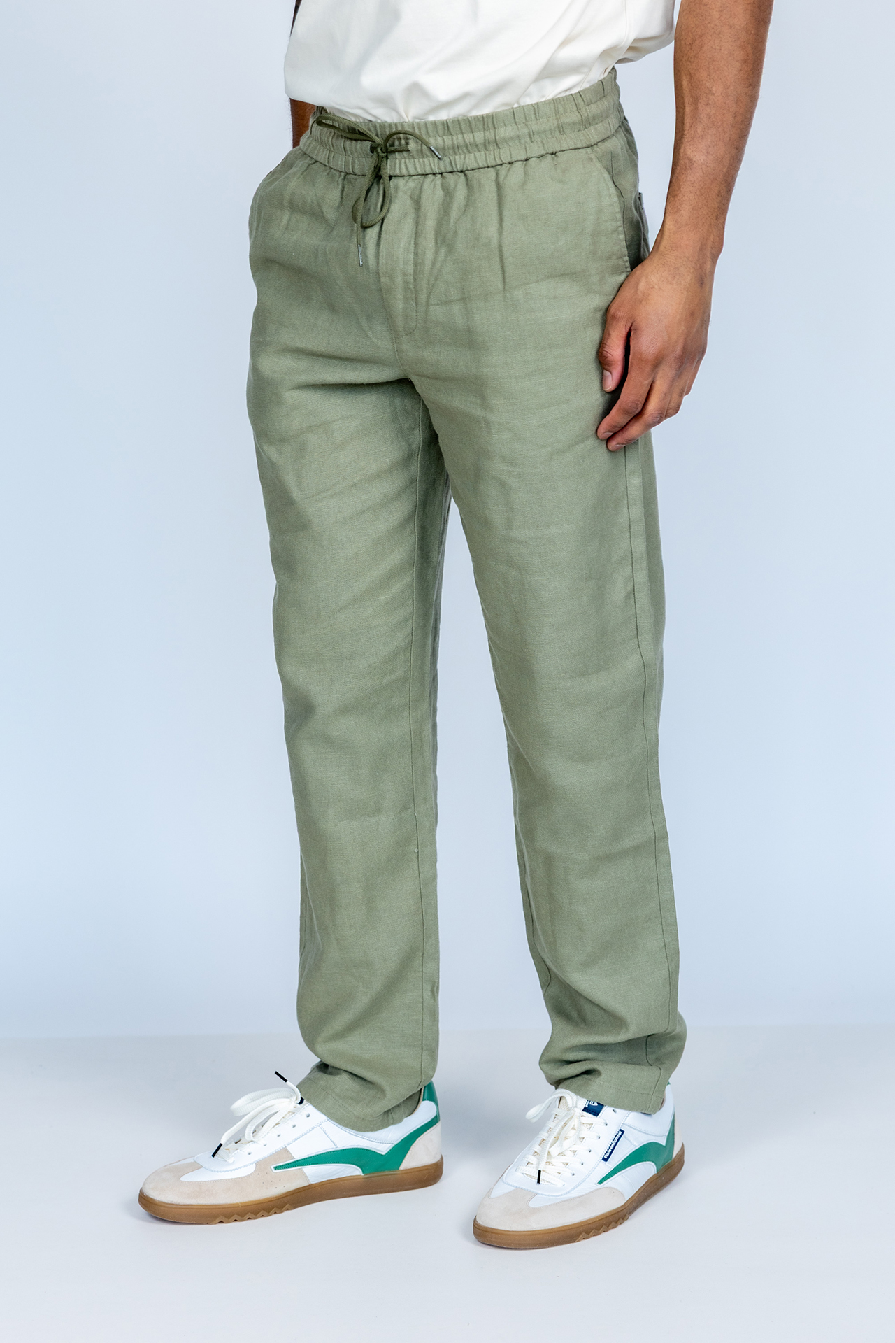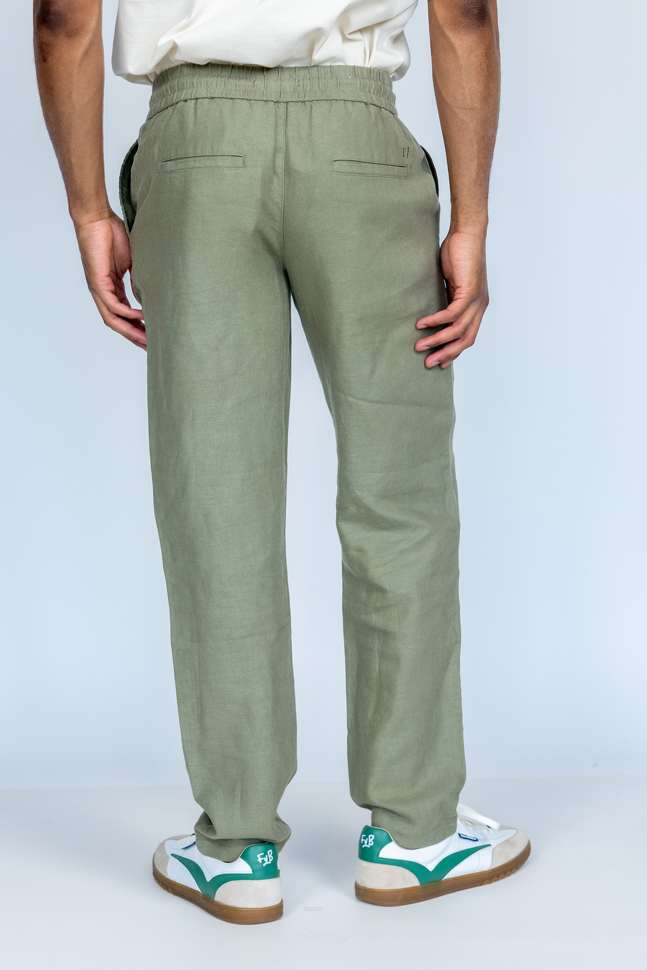 Linnen- en katoenmix broek met een elastische band met koordje in de taille. Hij heeft steekzakken aan de voorkant en fake zakken aan de achterkant