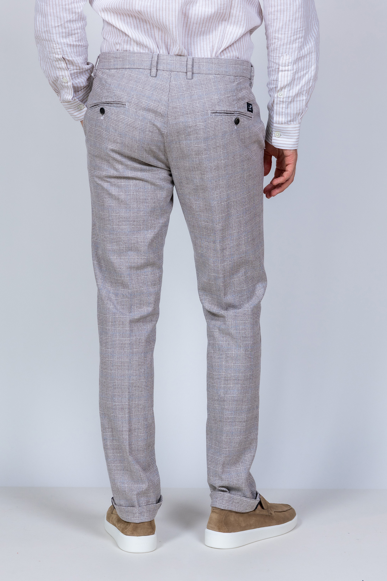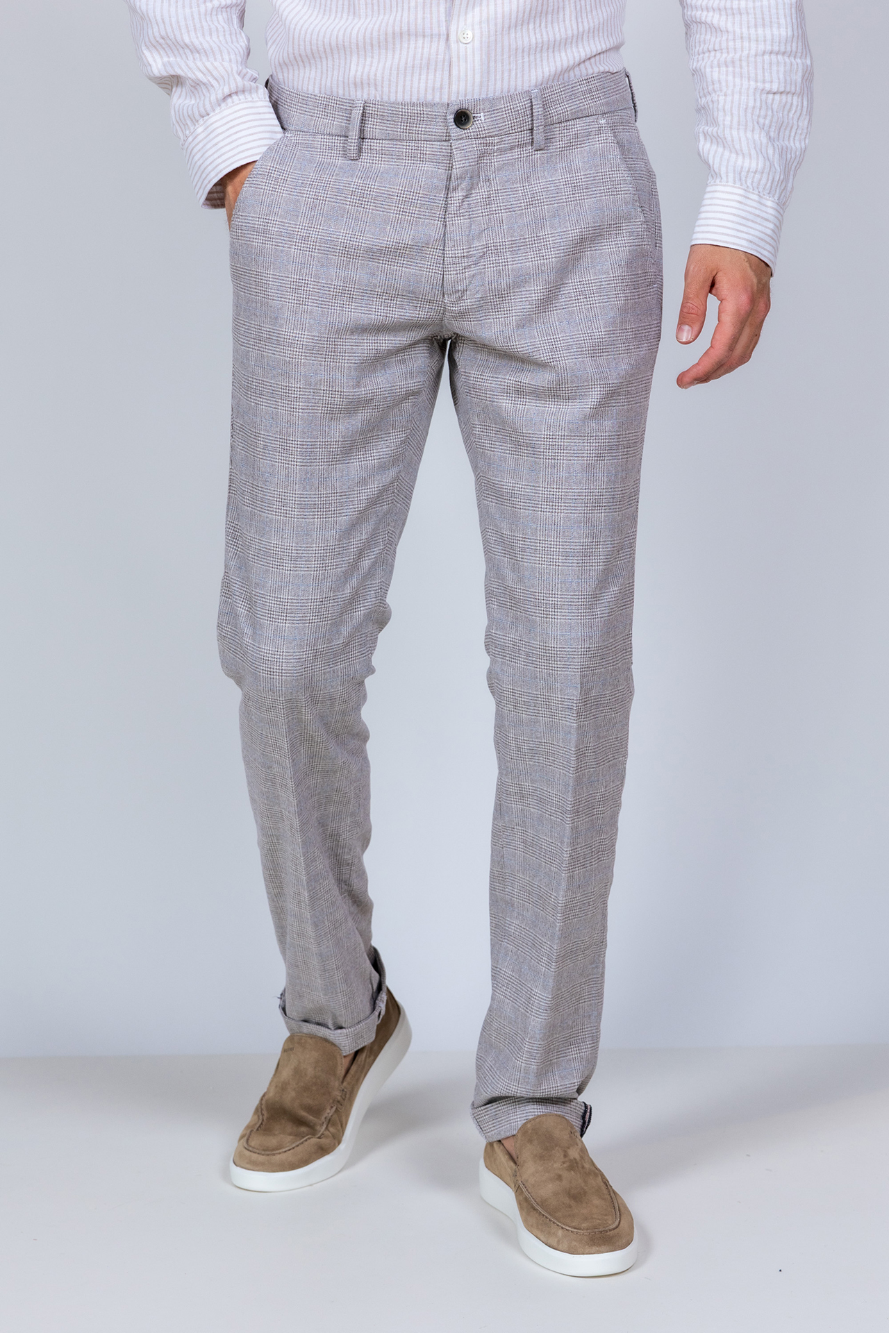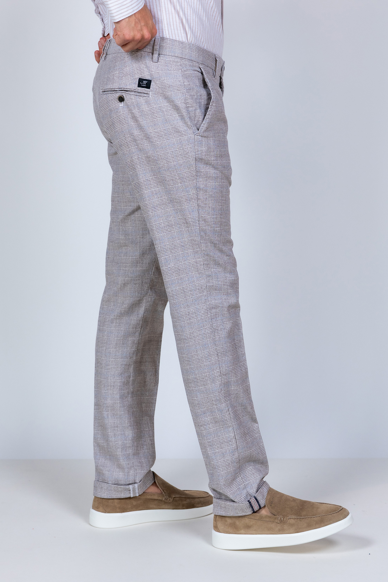 Katoenen broek met een knoop- en ritssluiting en lusjes in de band voor een ceintuur. Hij heeft steekzakken aan de voorkant, paspelzakken aan de achterkant, een fijn ruitdessin en stretch in de stof waardoor hij comfortabel draagt