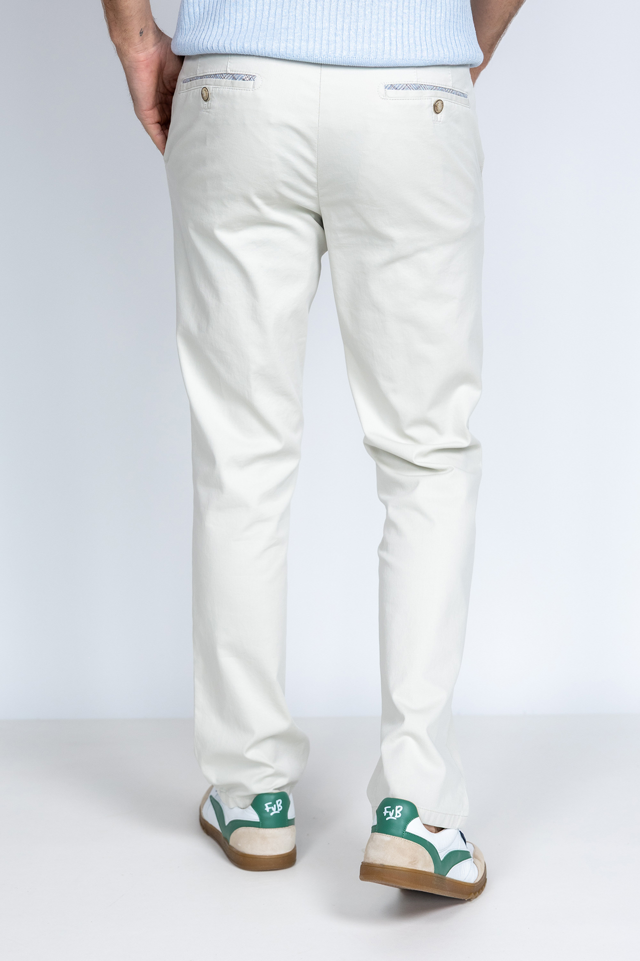Katoenen broek met een knoop- en ritssluiting en lusjes in de band voor een ceintuur. Hij heeft steekzakken aan de voorkant, paspelzakken aan de achterkant en stretch in de stof waardoor hij comfortabel draagt