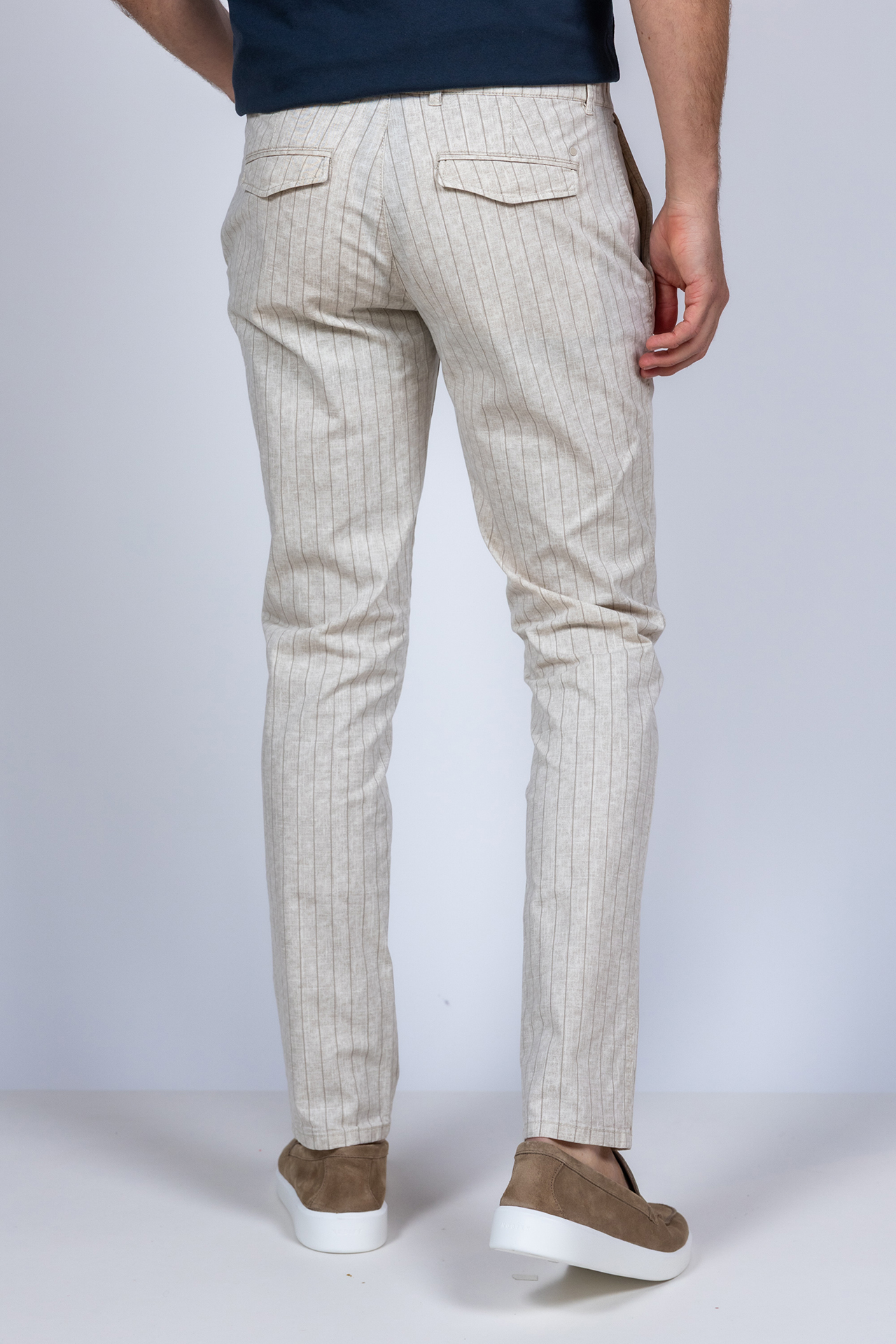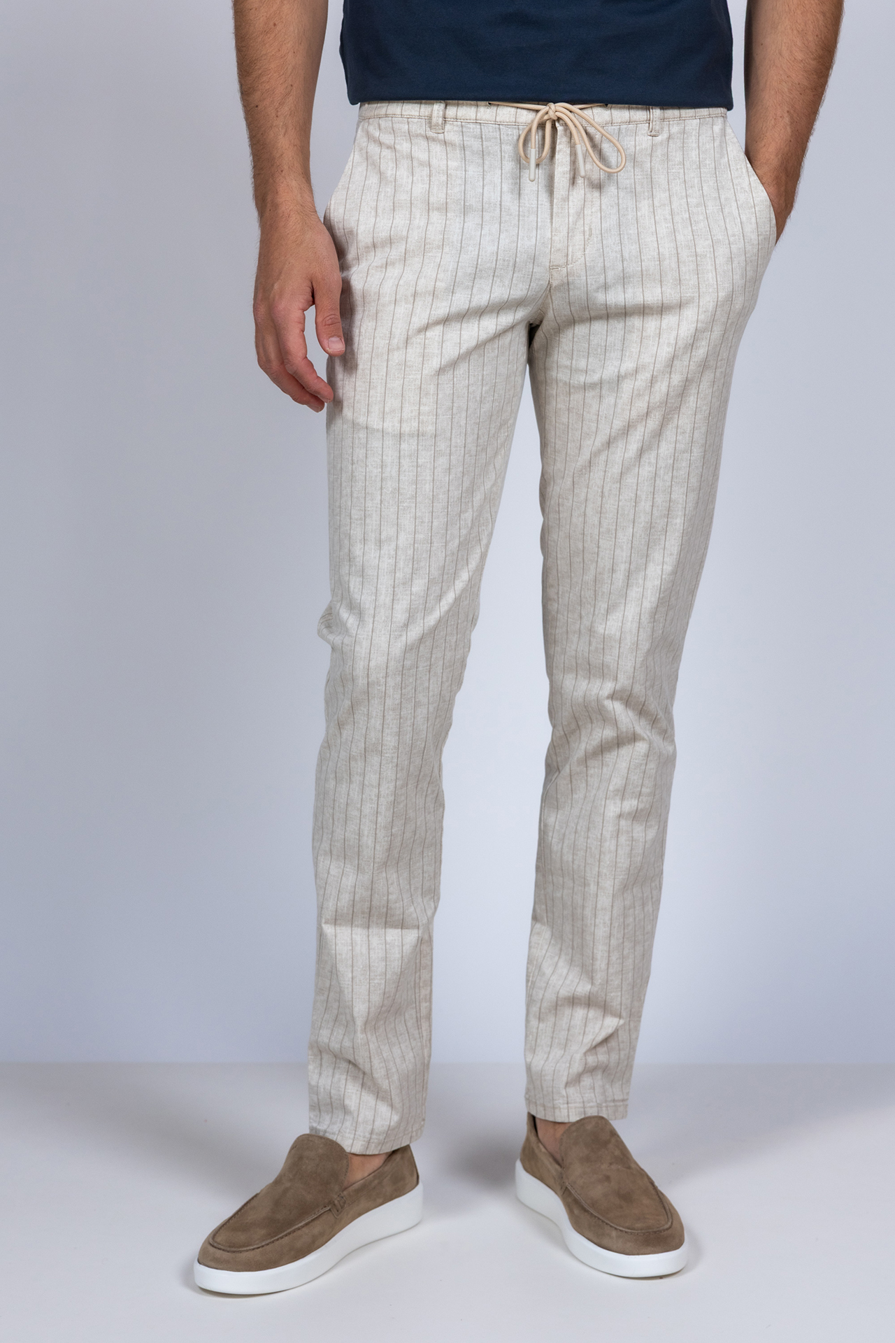 Broek met een knoop- en ritssluiting, lusjes en een koordje in de band. Hij heeft steekzakken aan de voorkant, klepzakken aan de achterkant en een krijtstreep. Ook zit er stretch in de stof waardoor hij comfortabel draagt