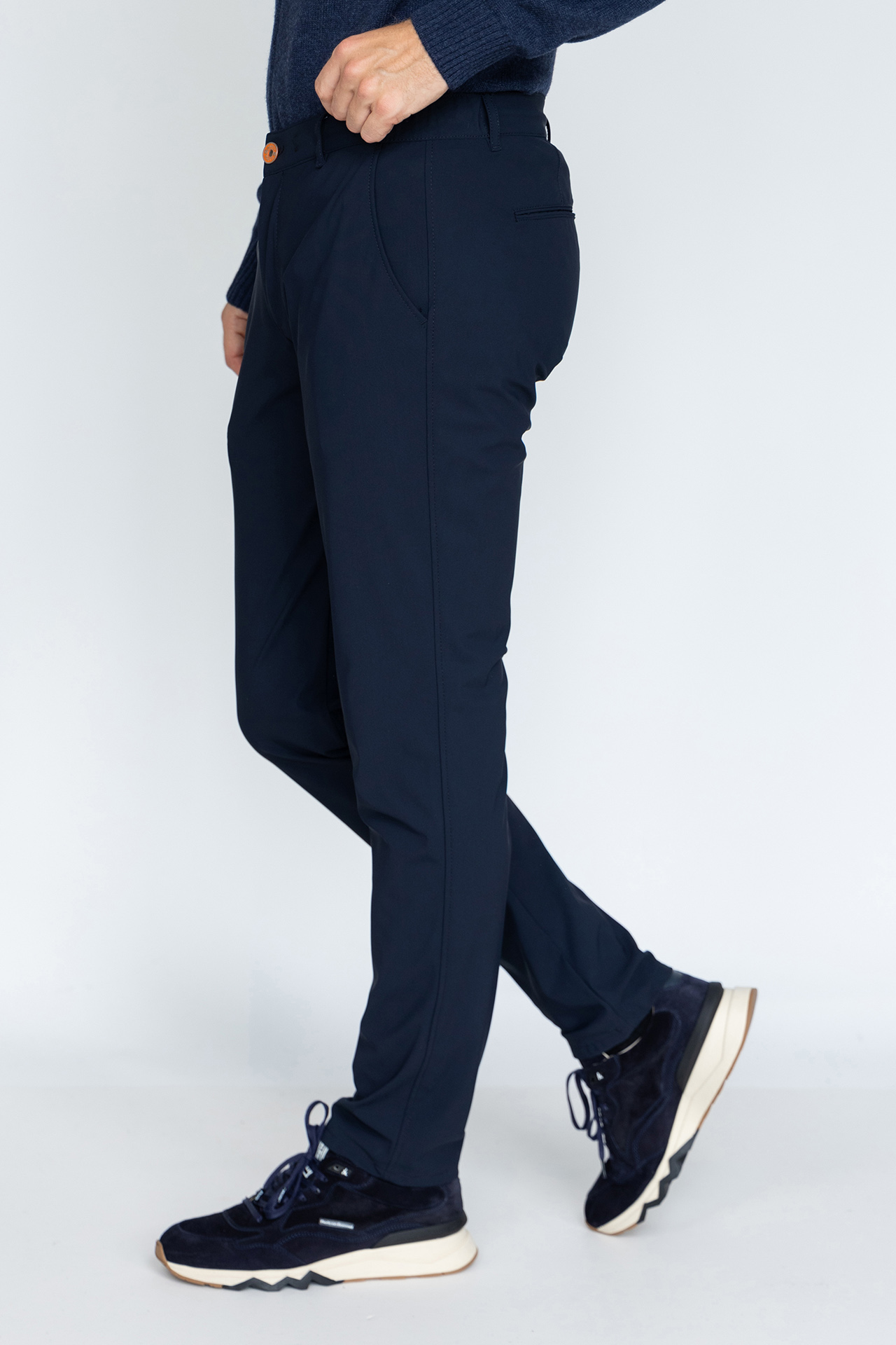 Travelstof broek met een knoop- en ritssluiting, steekzakken aan de voorkant en fake zakken aan de achterkant