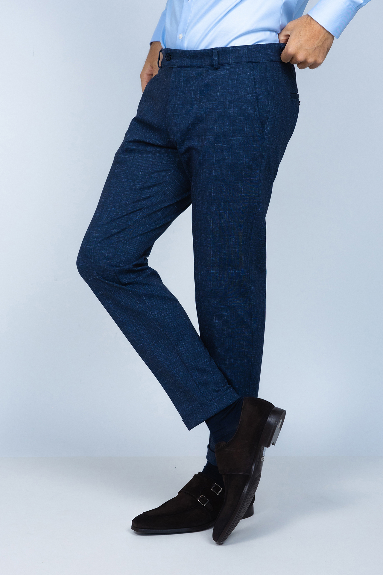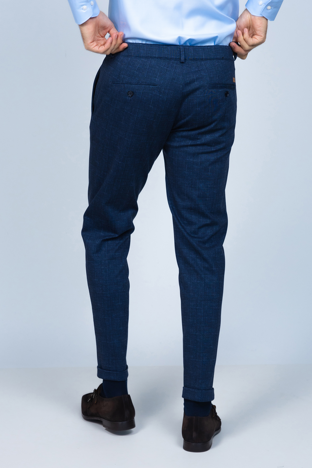 Pantalon met een knoop- en ritssluiting en lusjes in de band voor een ceintuur. Hij heeft steekzakken aan de voorkant, paspelzakken aan de achterkant en een fijn ruitdessin. Ook zit er stretch in de stof waardoor hij comfortabel draagt
