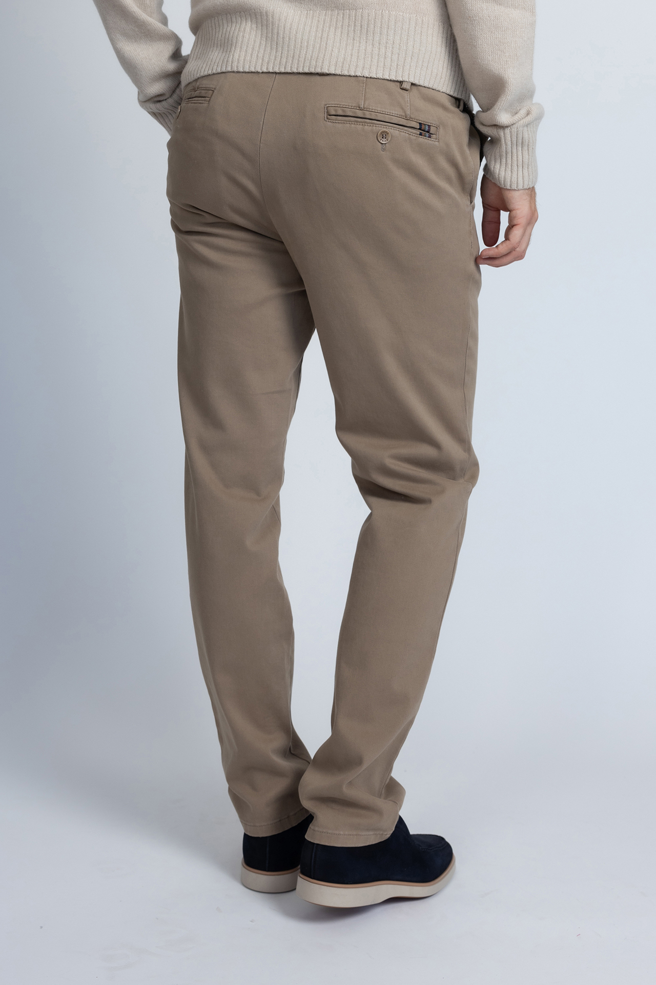 Pantalon met een knoop- en ritssluiting, lusjes in de band voor een ceintuur, steekzakken aan de voorkant, paspelzakken aan de achterkant en er zit een beetje stretch in waardoor hij comfortabel zit