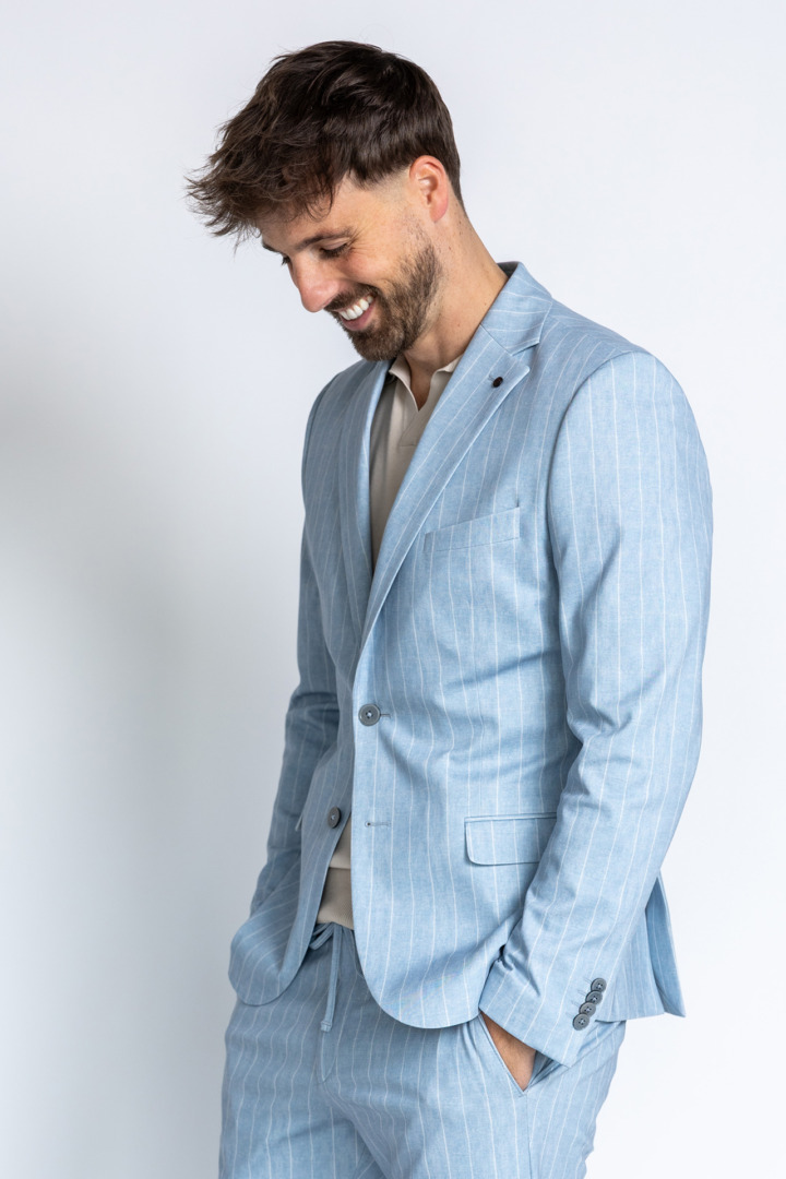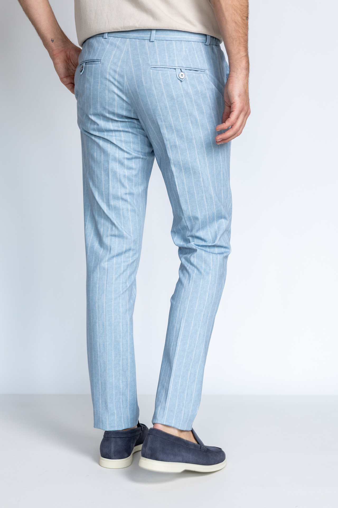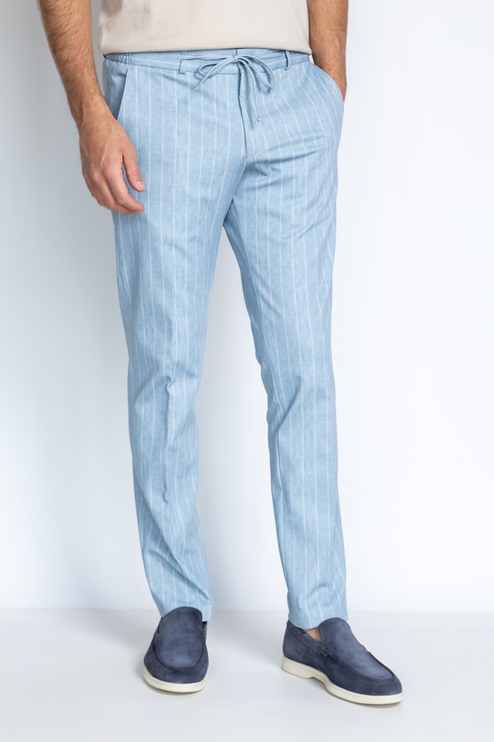 Krijtstreep pantalon met lusjes en een strikkoordje in de band. Hij heeft steekzakken aan de voorkant, paspelzakken aan de achterkant, stretch in de stof waardoor hij comfortabel draagt en een krijtstreep