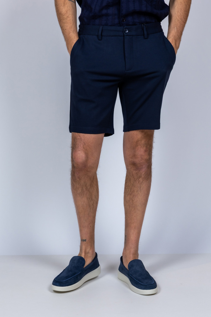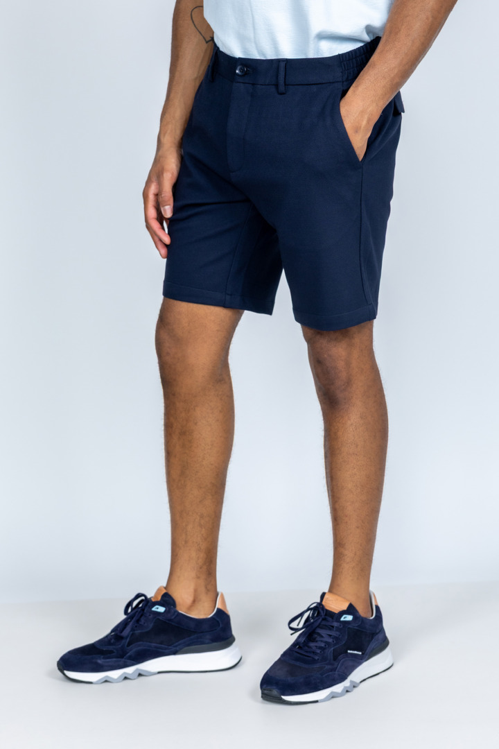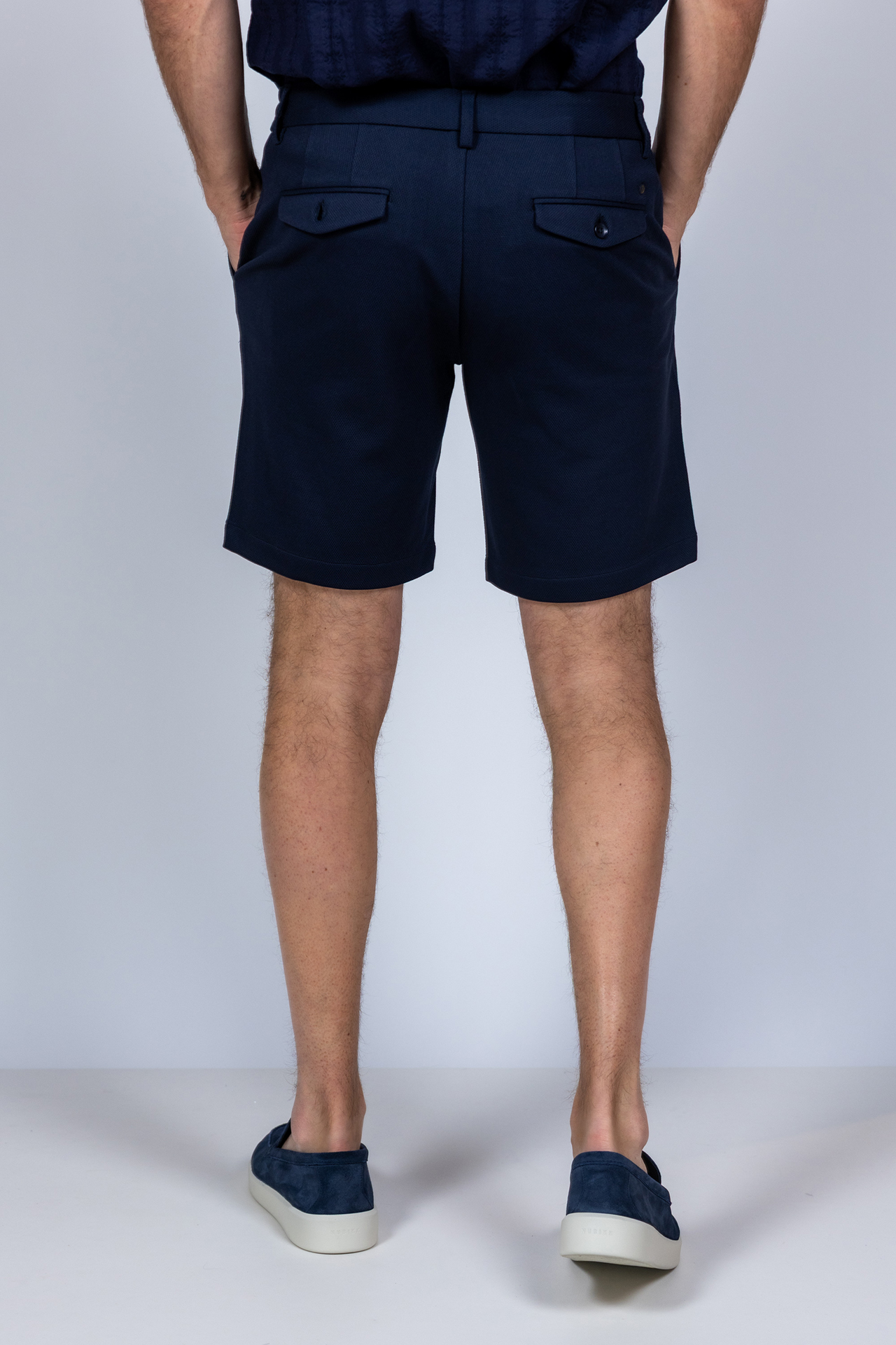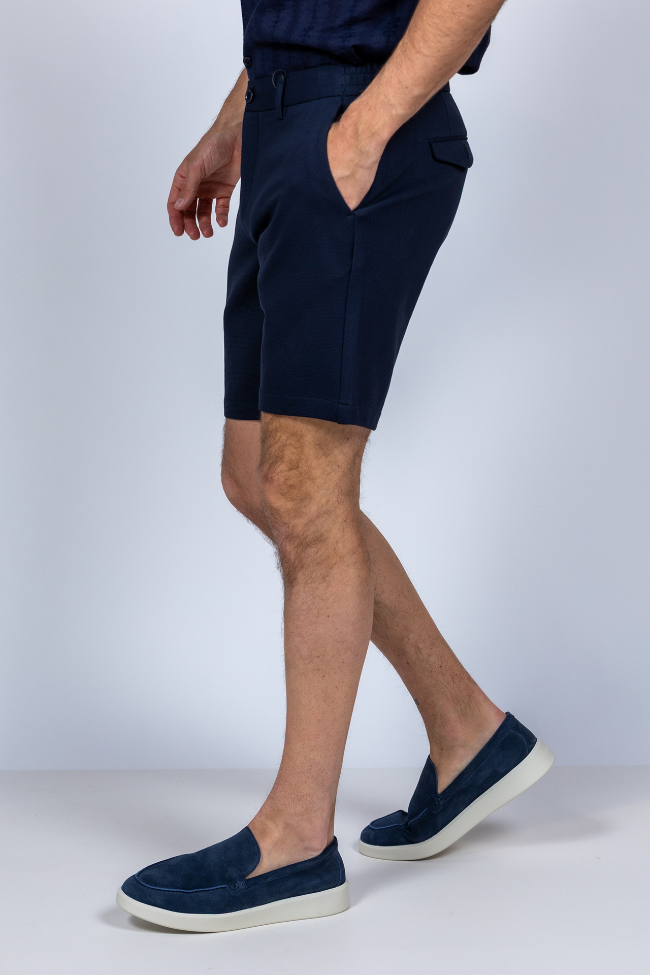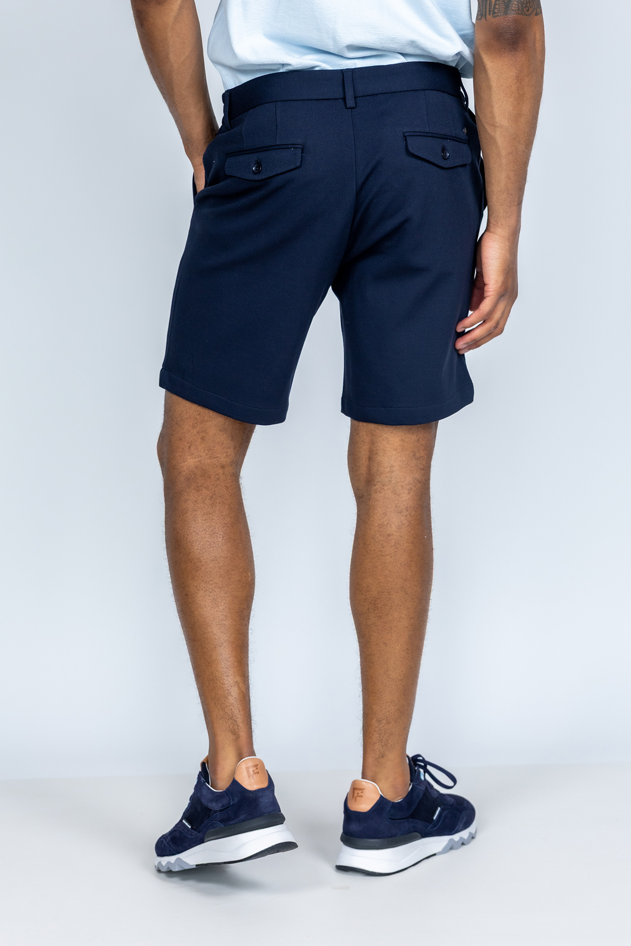 Short met een knoop- en ritssluiting en lusjes in de band voor een ceintuur. Hij heeft steekzakken aan de voorkant en klepzakken aan de achterkant