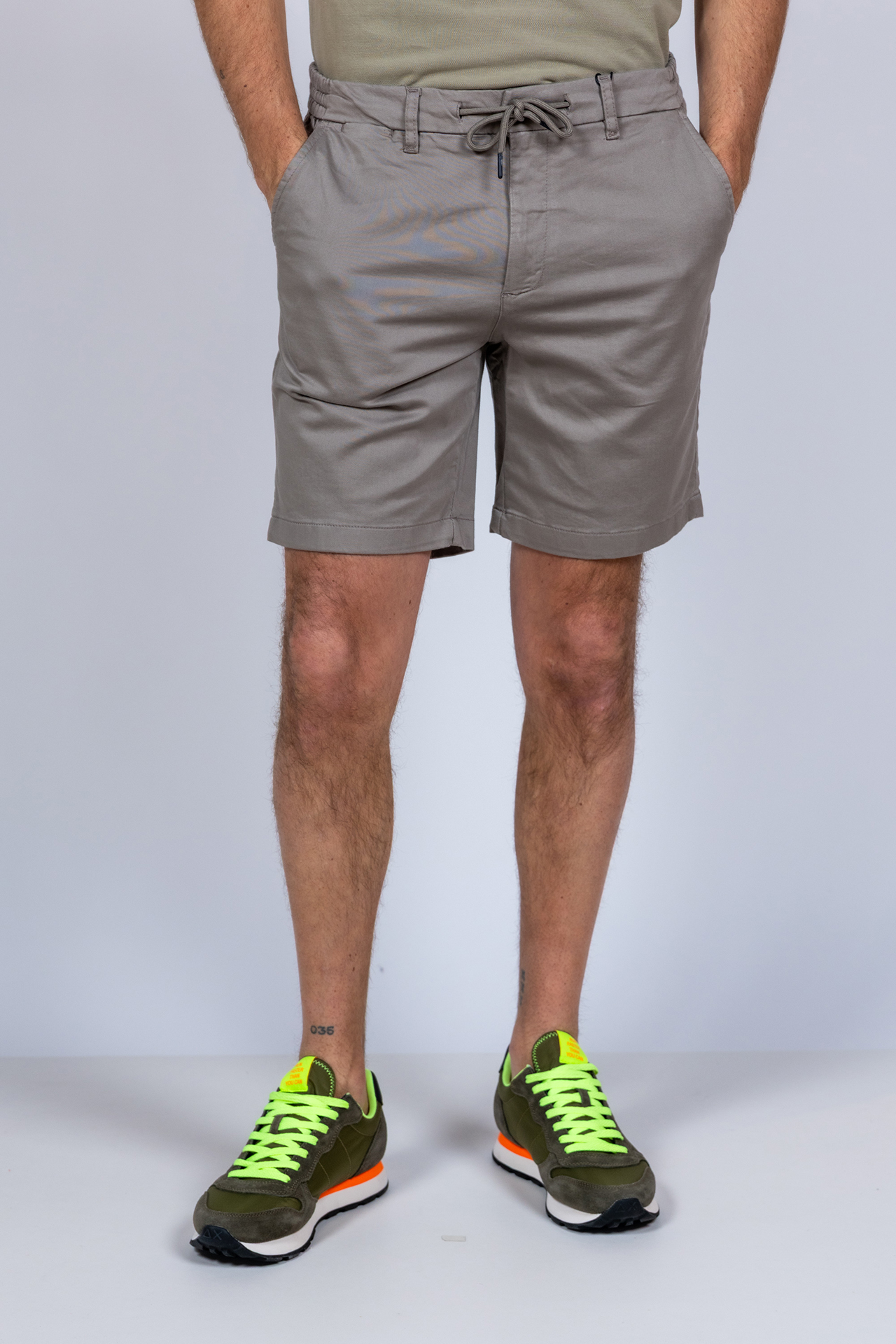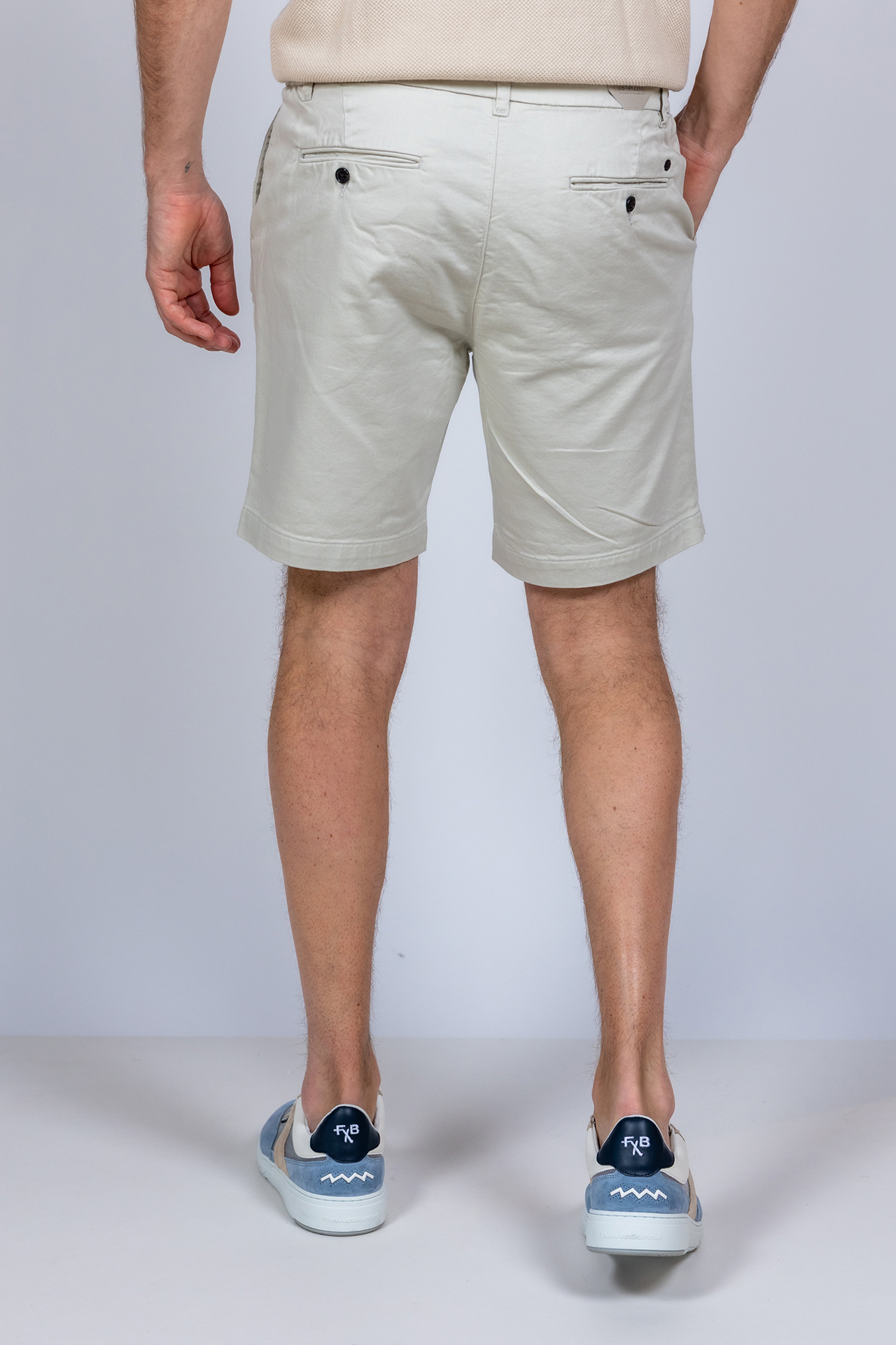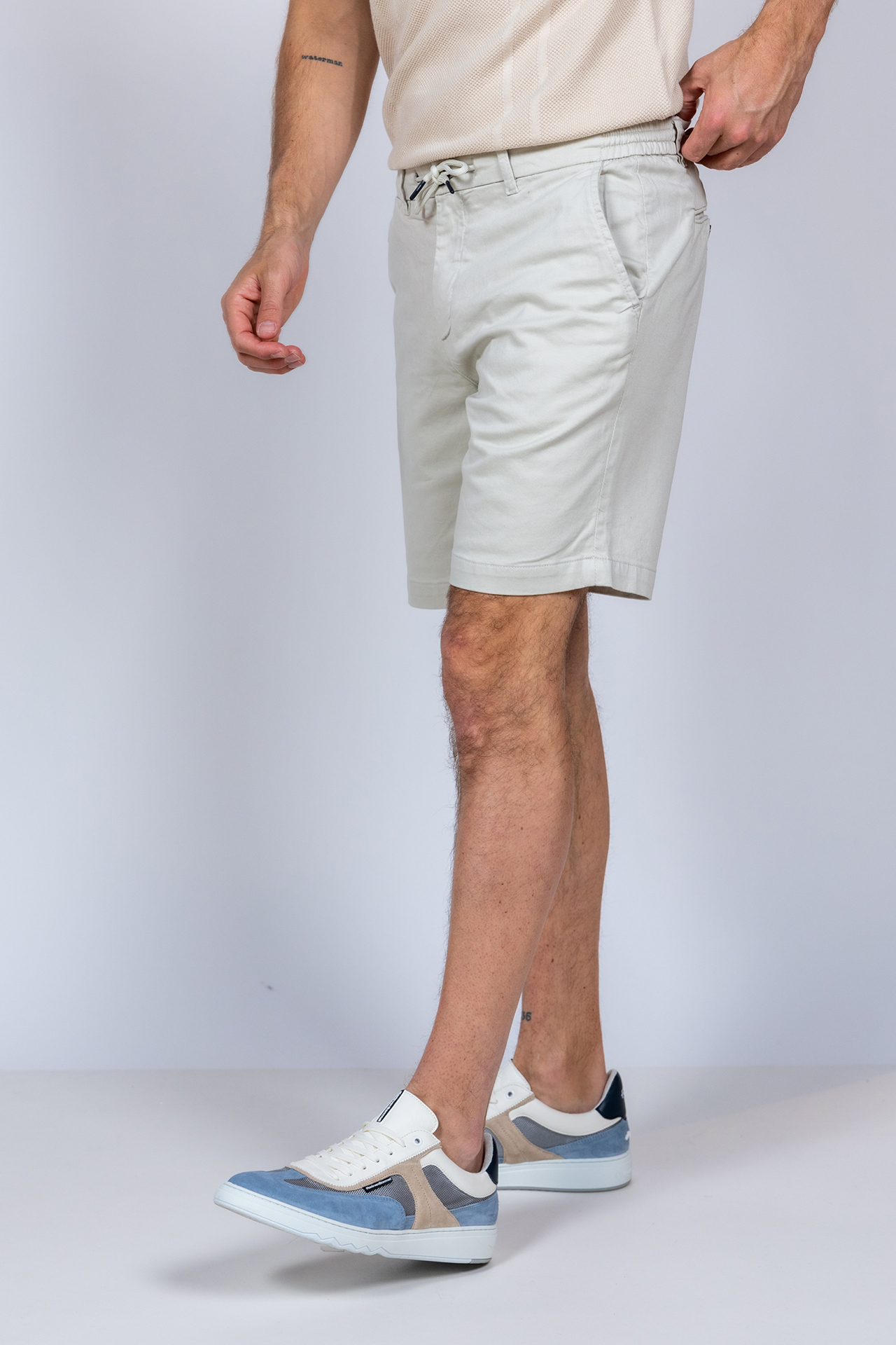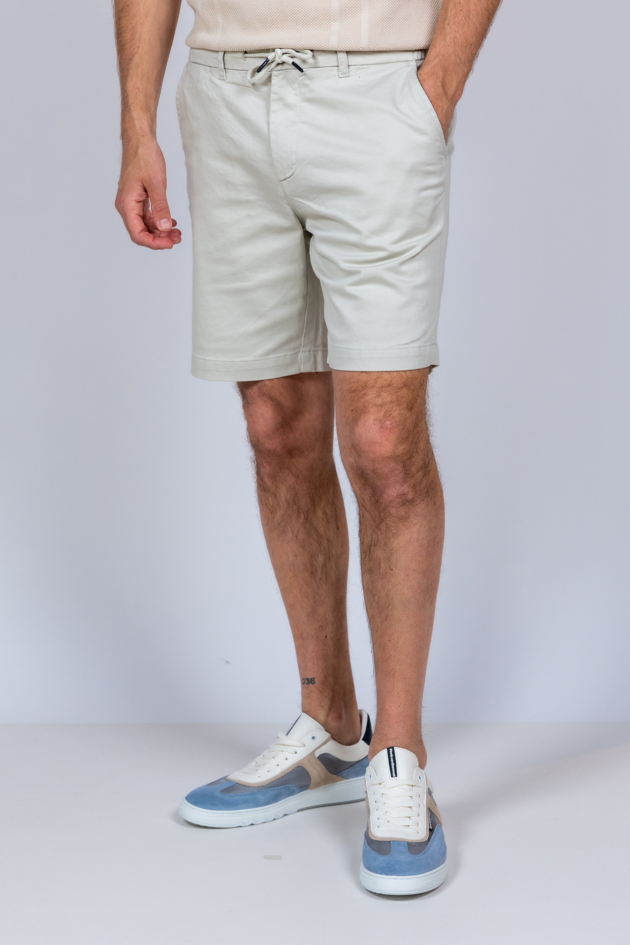 Katoenen short met een knoop- en ritssluiting en koordje in de band. Hij heeft steekzakken aan de voorkant, paspelzakken aan de achterkant en een klein beetje stretch waardoor hij comfortabel zit