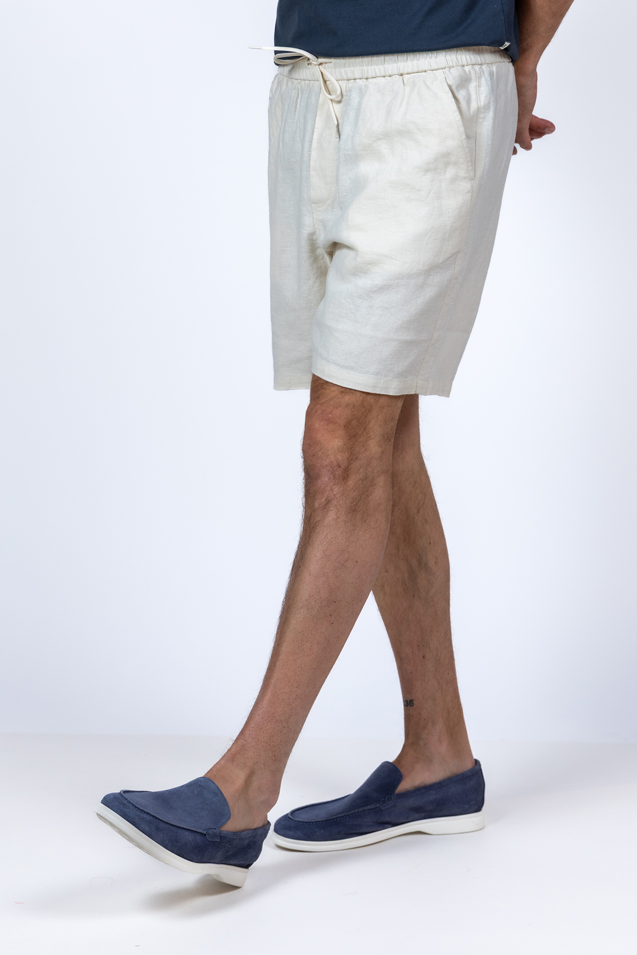 Linnenmix short met een elastische band met koordje in de taille. Hij heeft steekzakken aan de voorkant en een achterzak