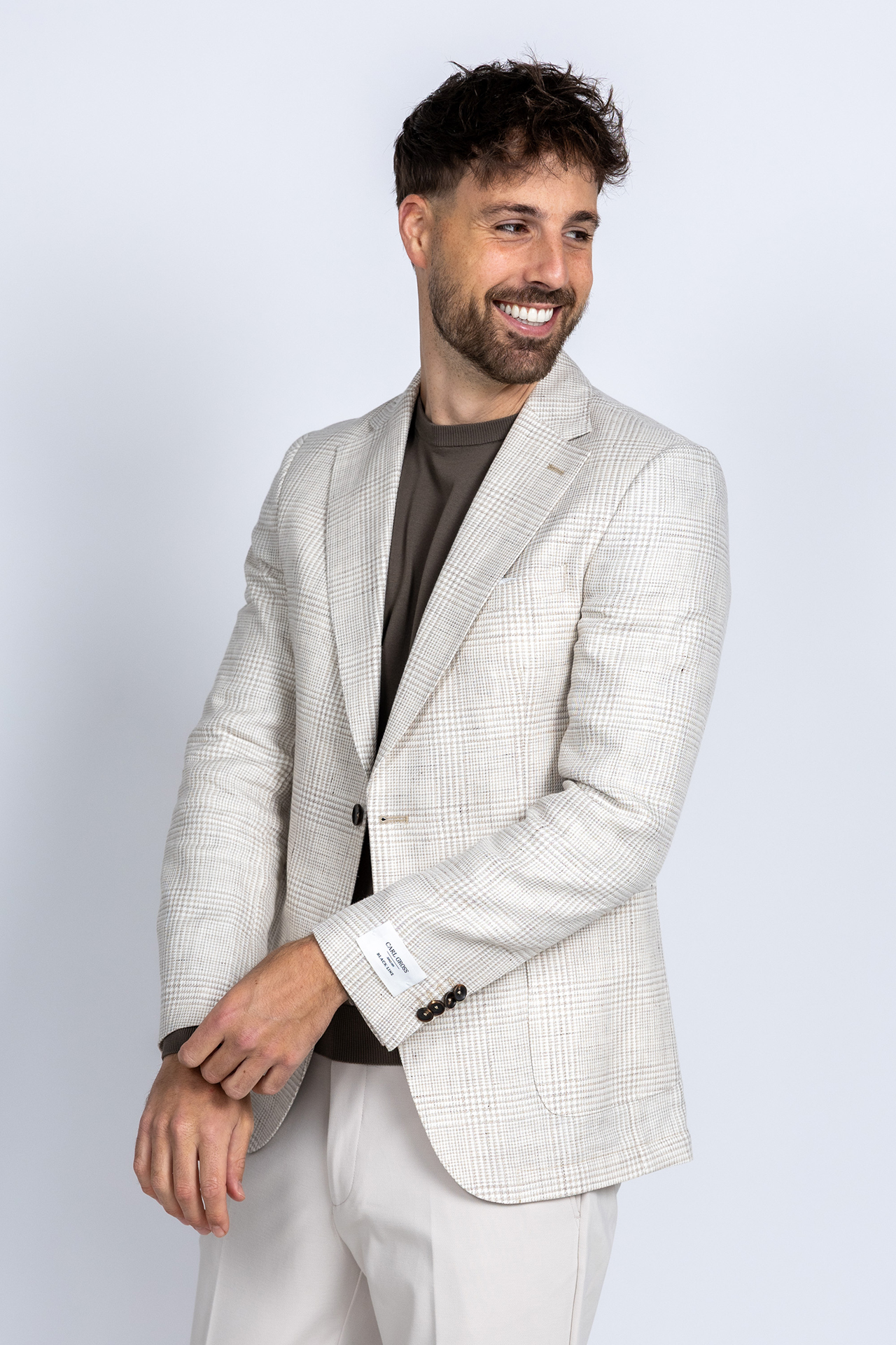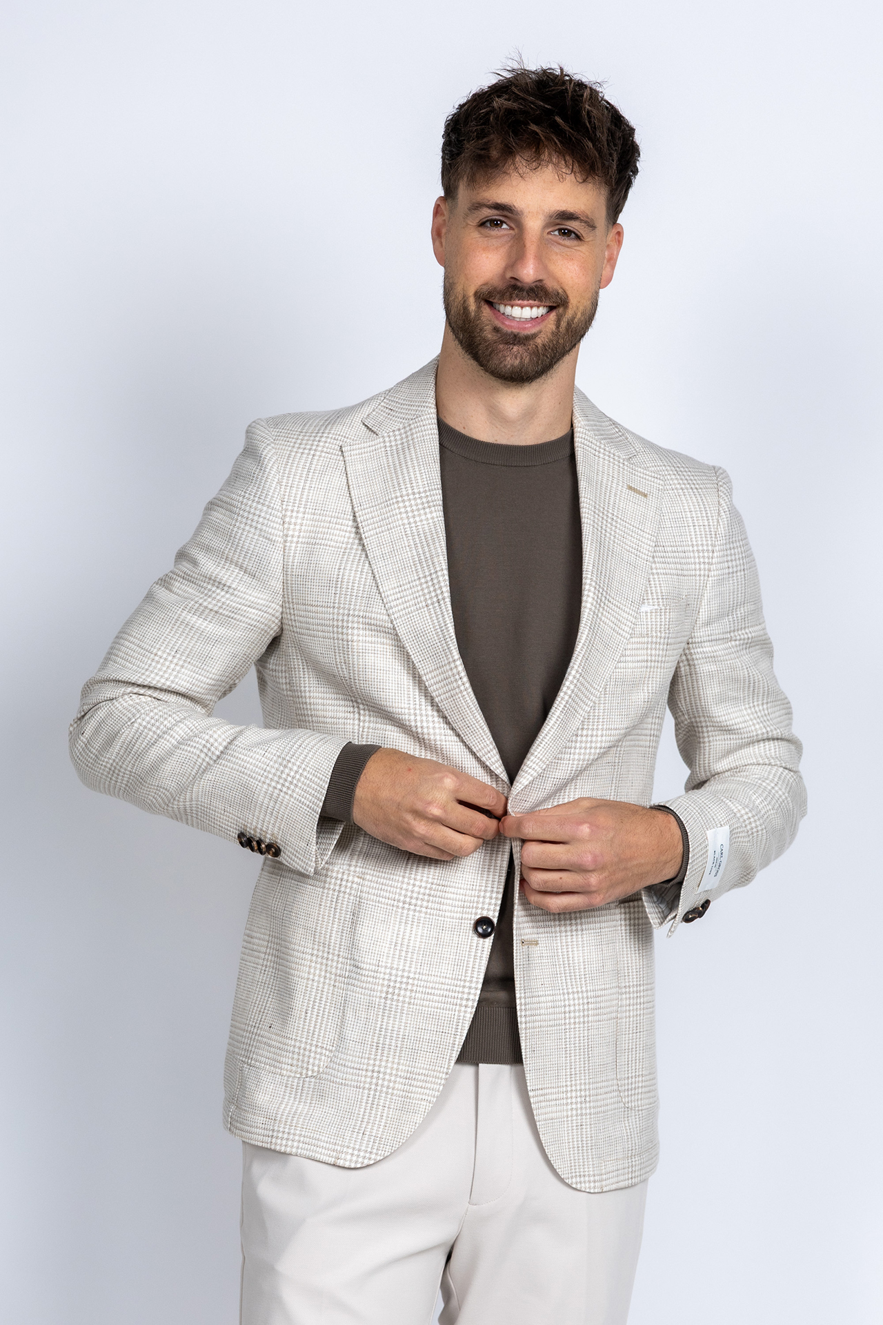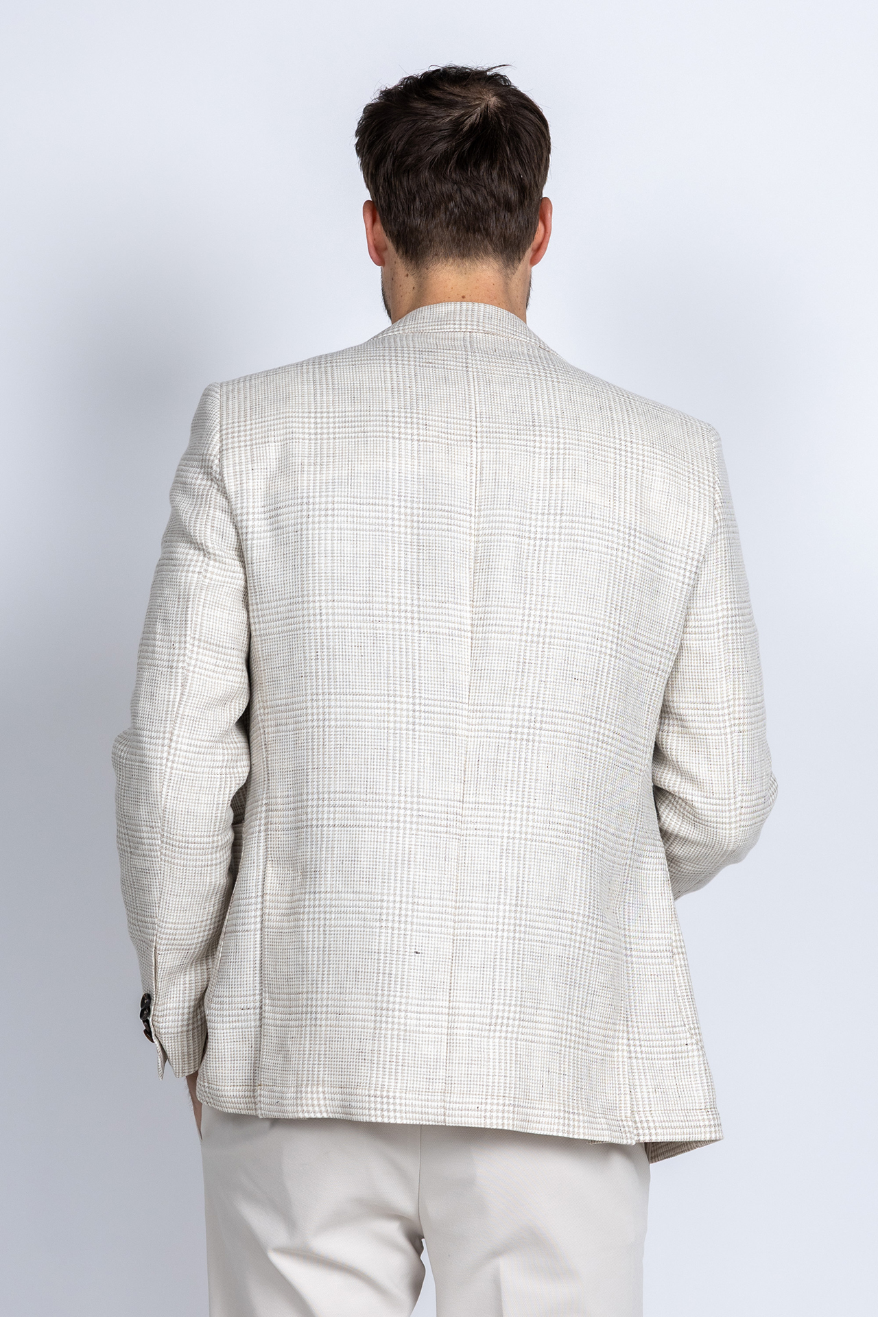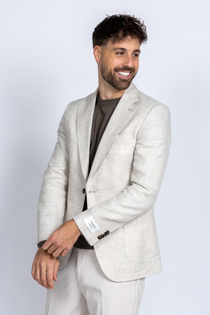Geruite linnen- en katoenmix blazer met een reverskraag en opgestikte zakken. Hij heeft knopen aan de voorkant en splitten aan de achterkant