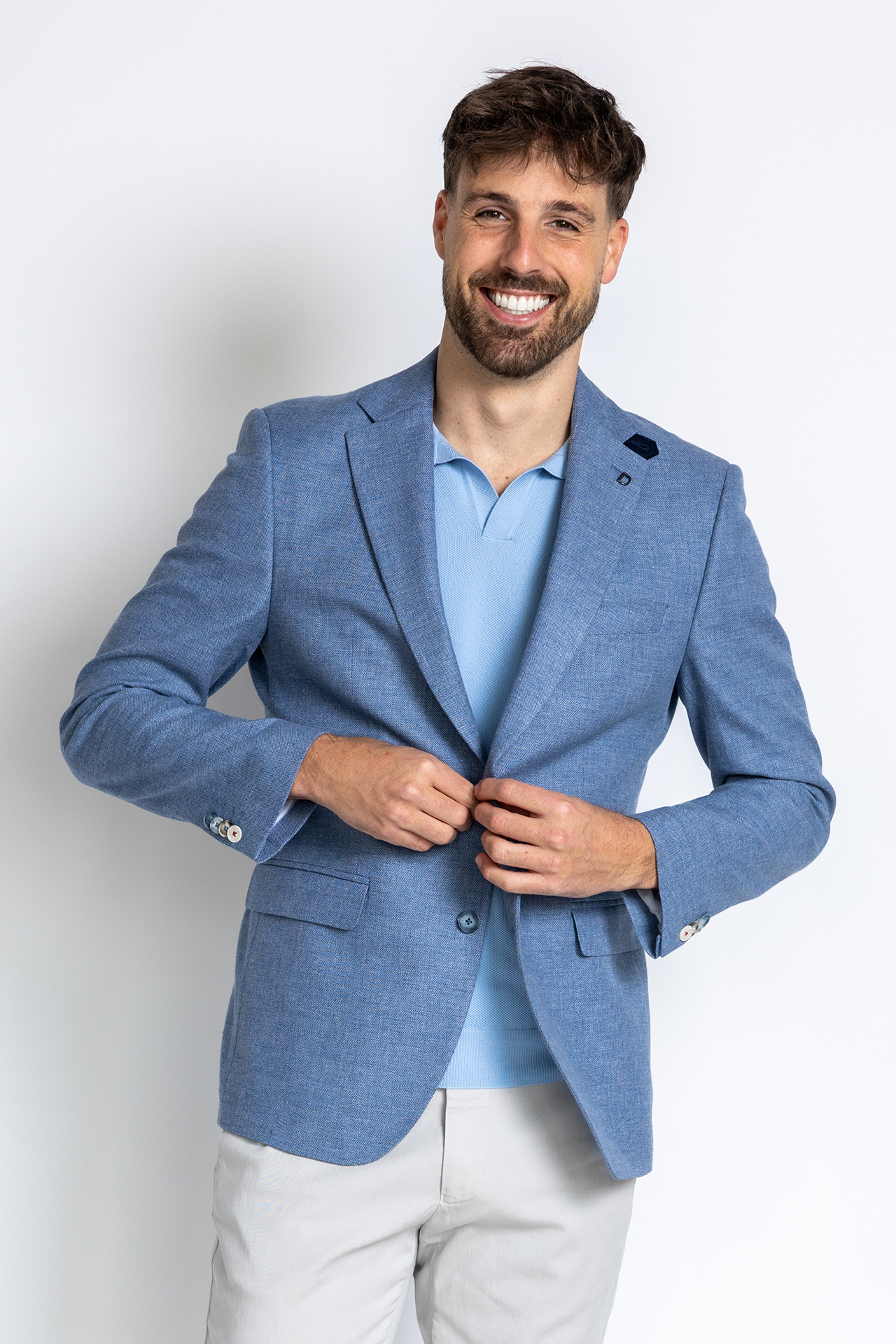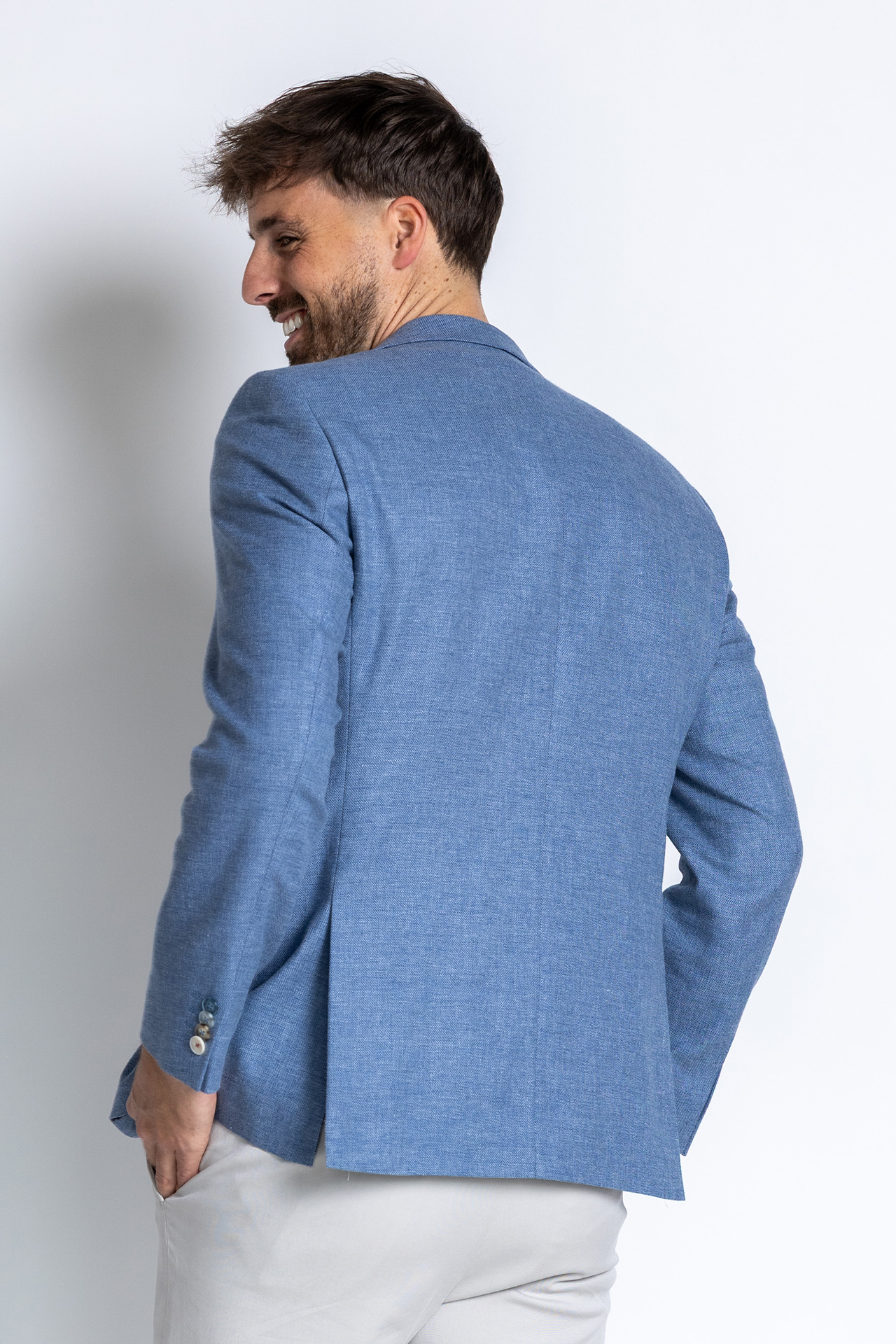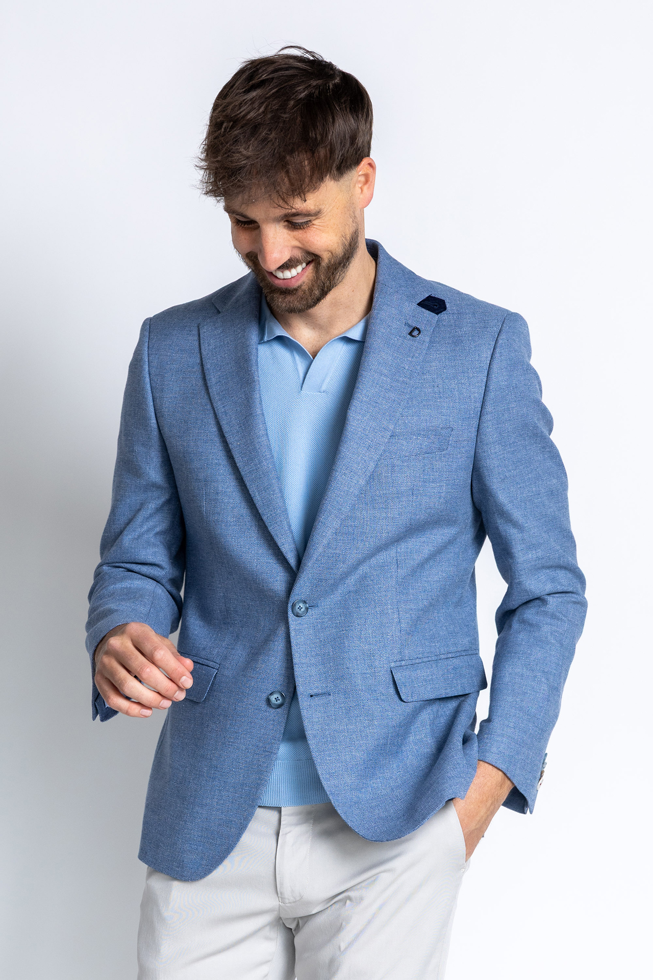 Colbert met een reverskraag, knopen en klepzakken aan de voorkant. Hij heeft splitten aan de achterkant en een klein beetje stretch in de stof waardoor hij comfortabel draagt
