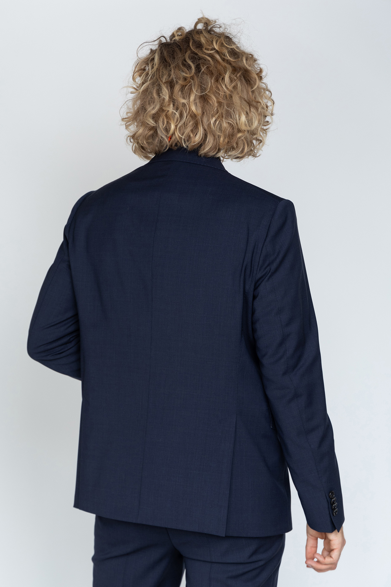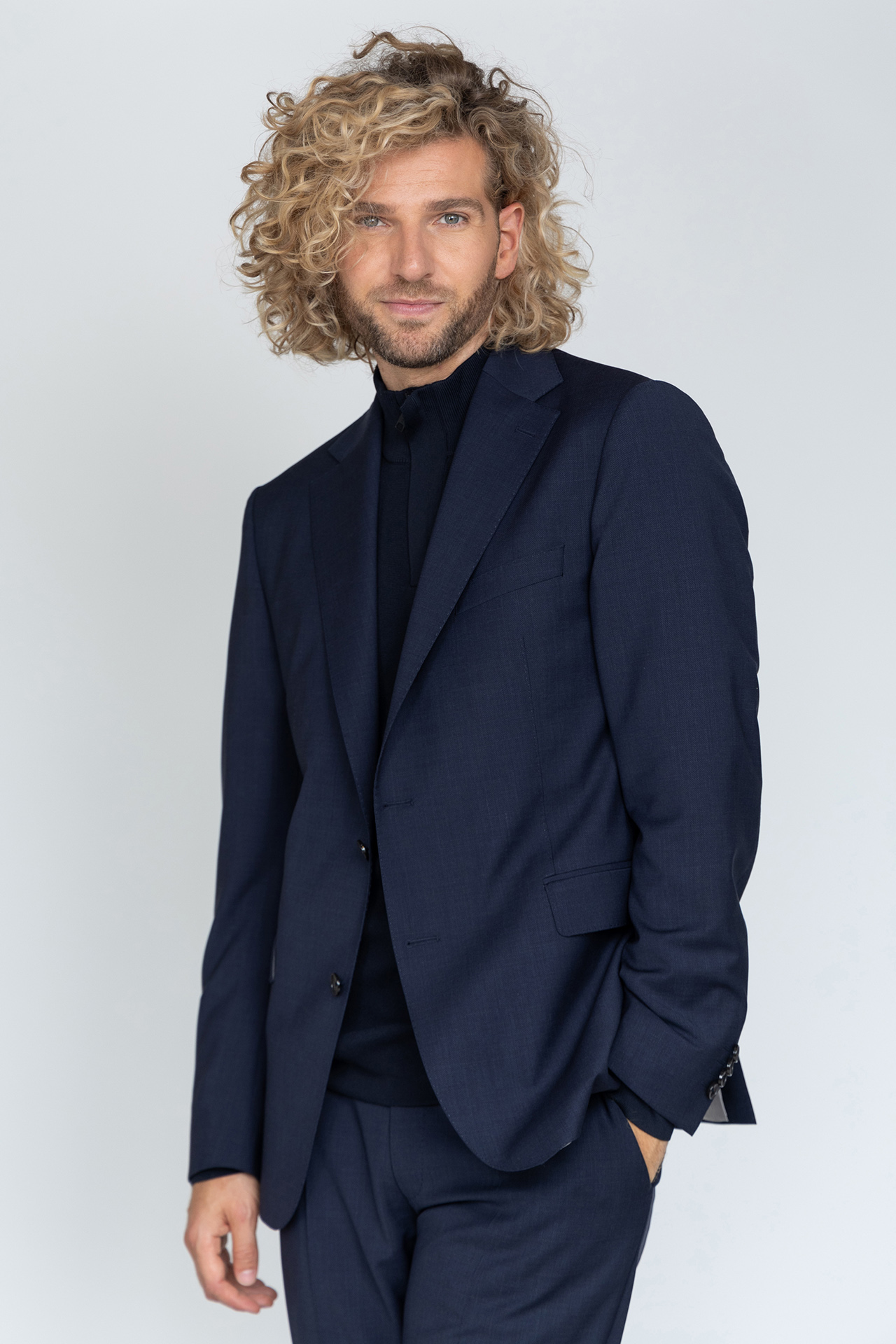 Getailleerd wollen kostuum. Het colbert heeft klepzakken aan de voorkant en splitten aan de achterkant