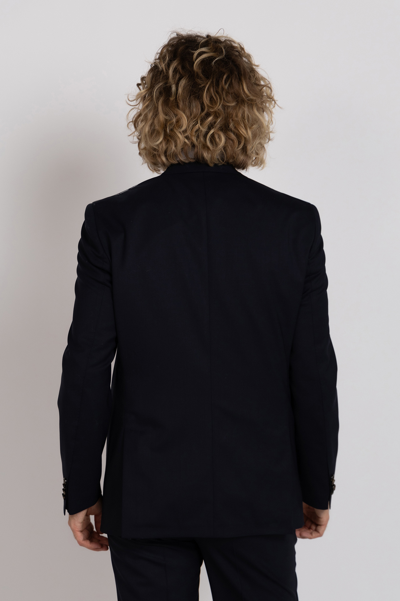 Getailleerd wollen kostuum. Het colbert heeft een knoopssluiting, opgestikte zakken en een borstzak aan de voorkant en splitten aan de achterkant. Er zit ook een klein beetje stretch in waardoor hij comfortabel draagt