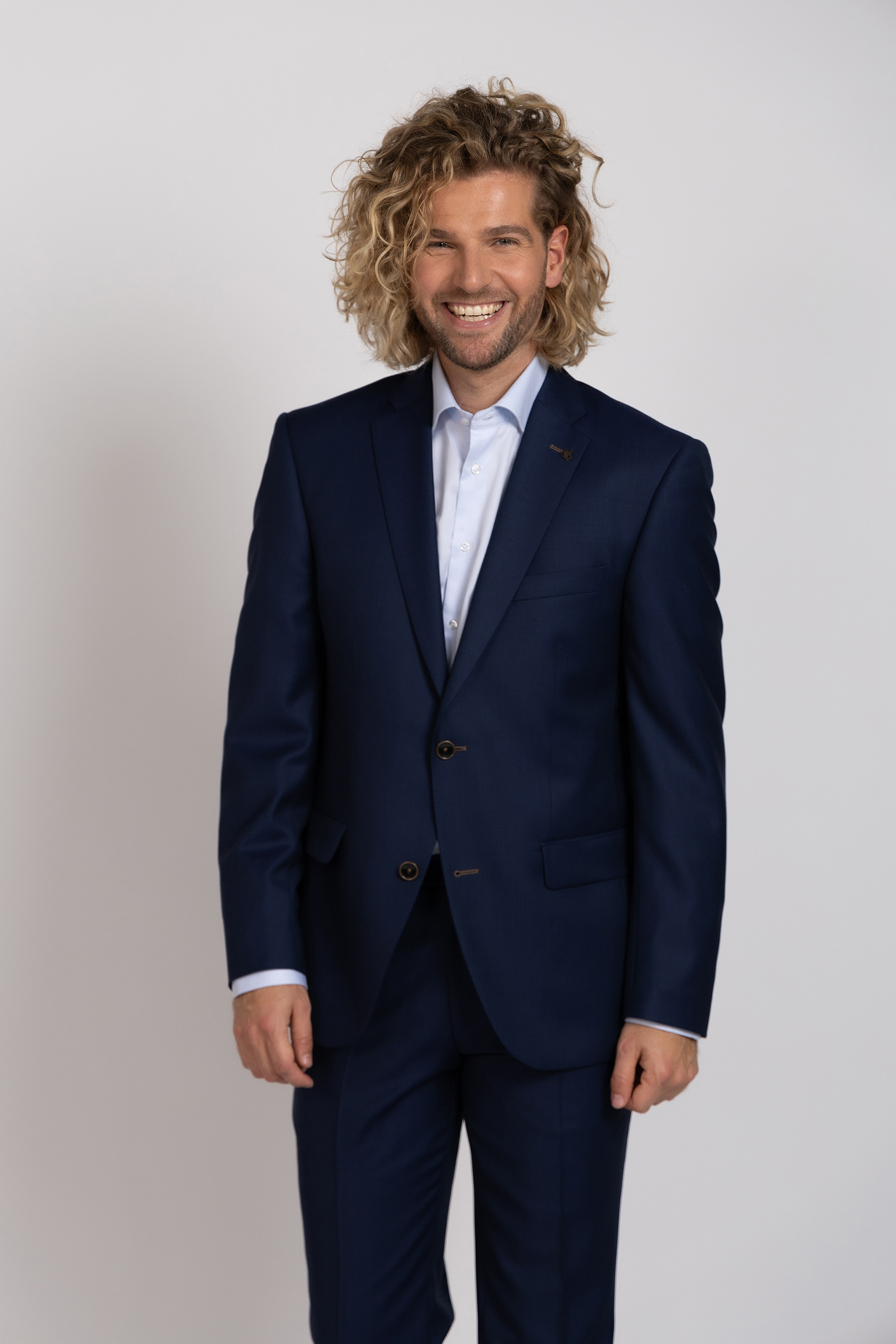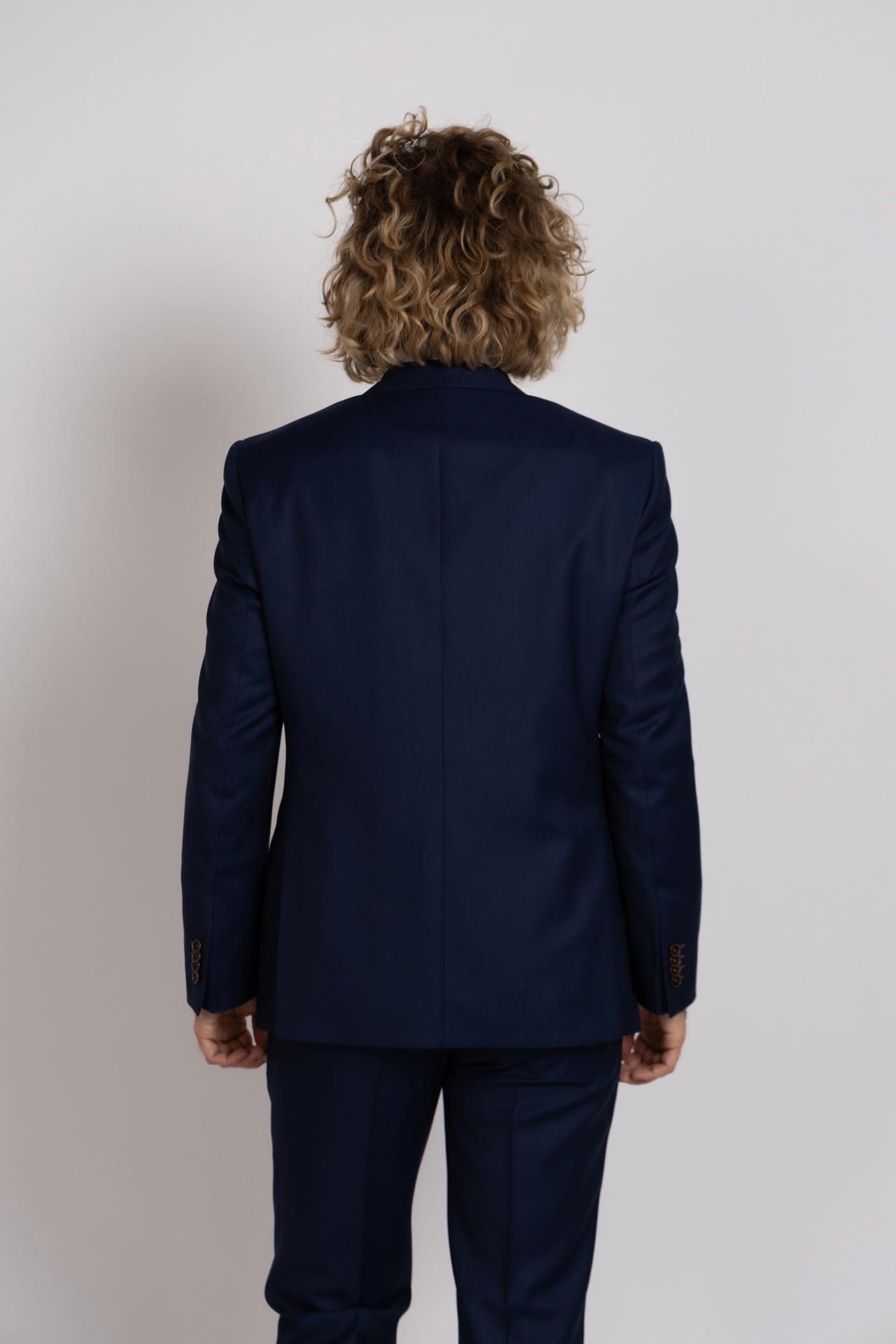 Getailleerd wollen colbert met knopen, klepzakken en een borstzak aan de voorkant. Hij heeft splitten aan de achterkant