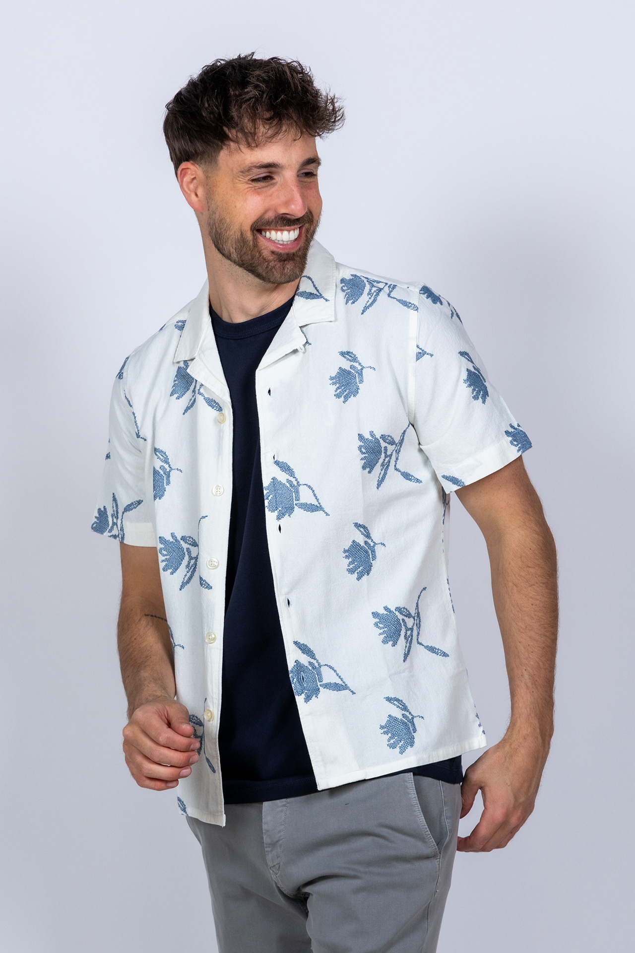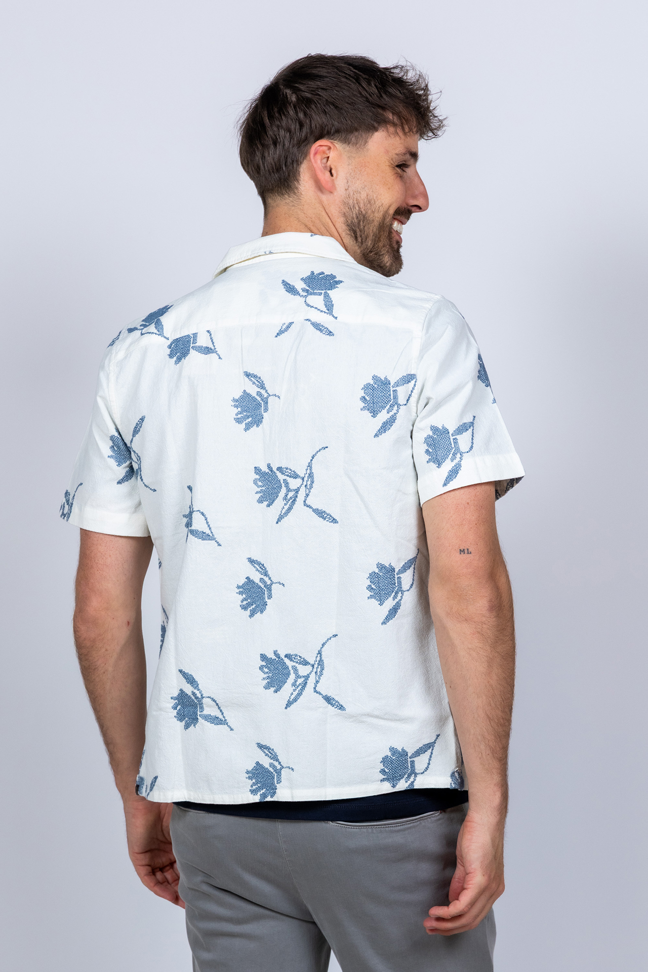 Katoenen shirt met korte mouwen en blauwe geborduurde bloemen