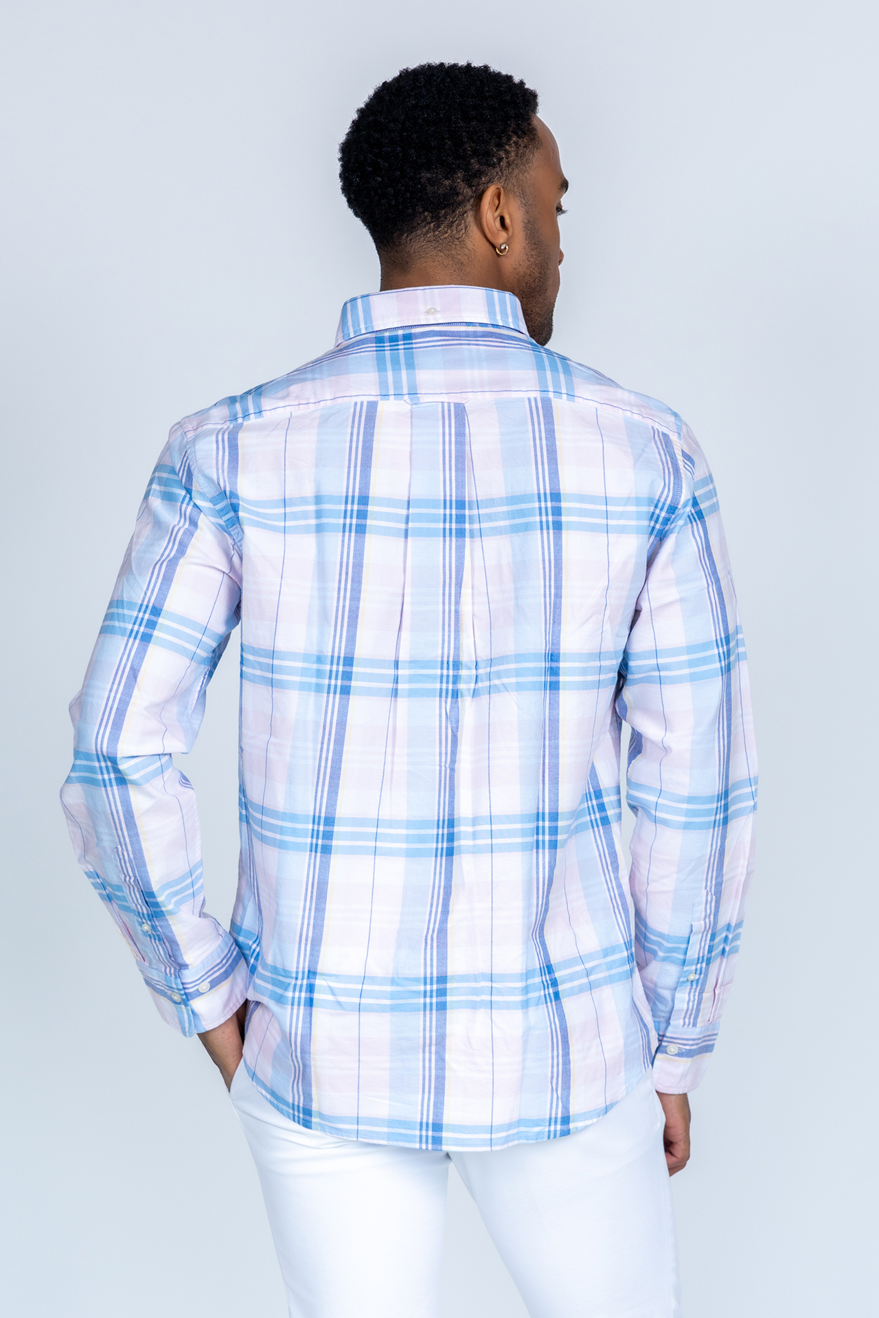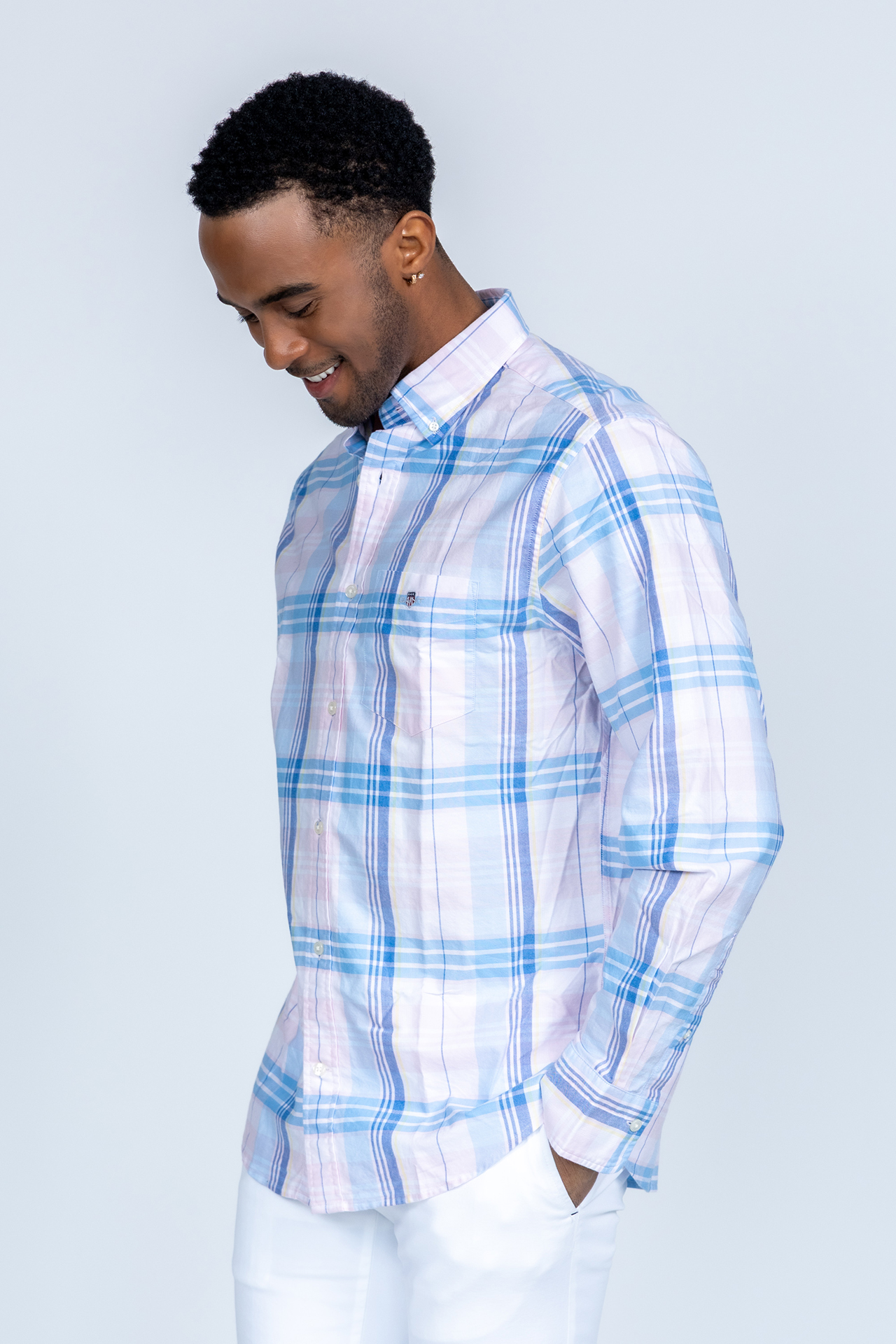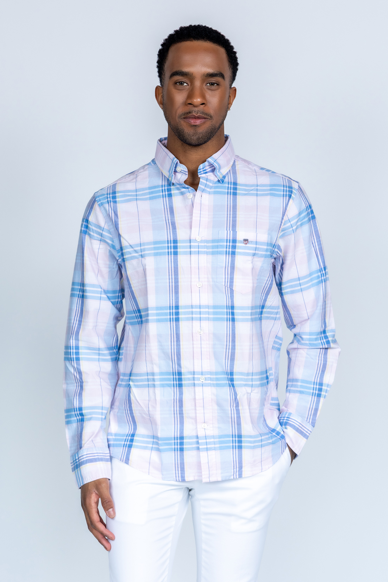 Button-down overhemd met een ruitdessin in roze/blauw. Hij heeft lange mouwen en een borstzak met het logo erop