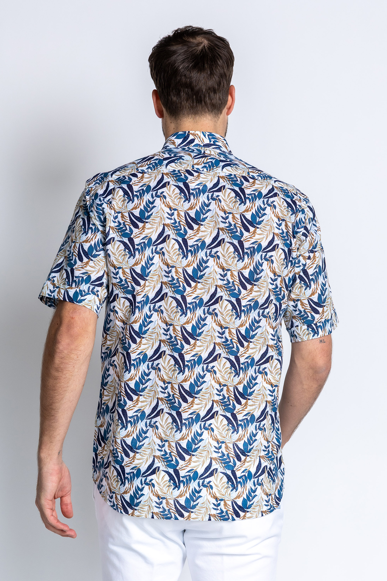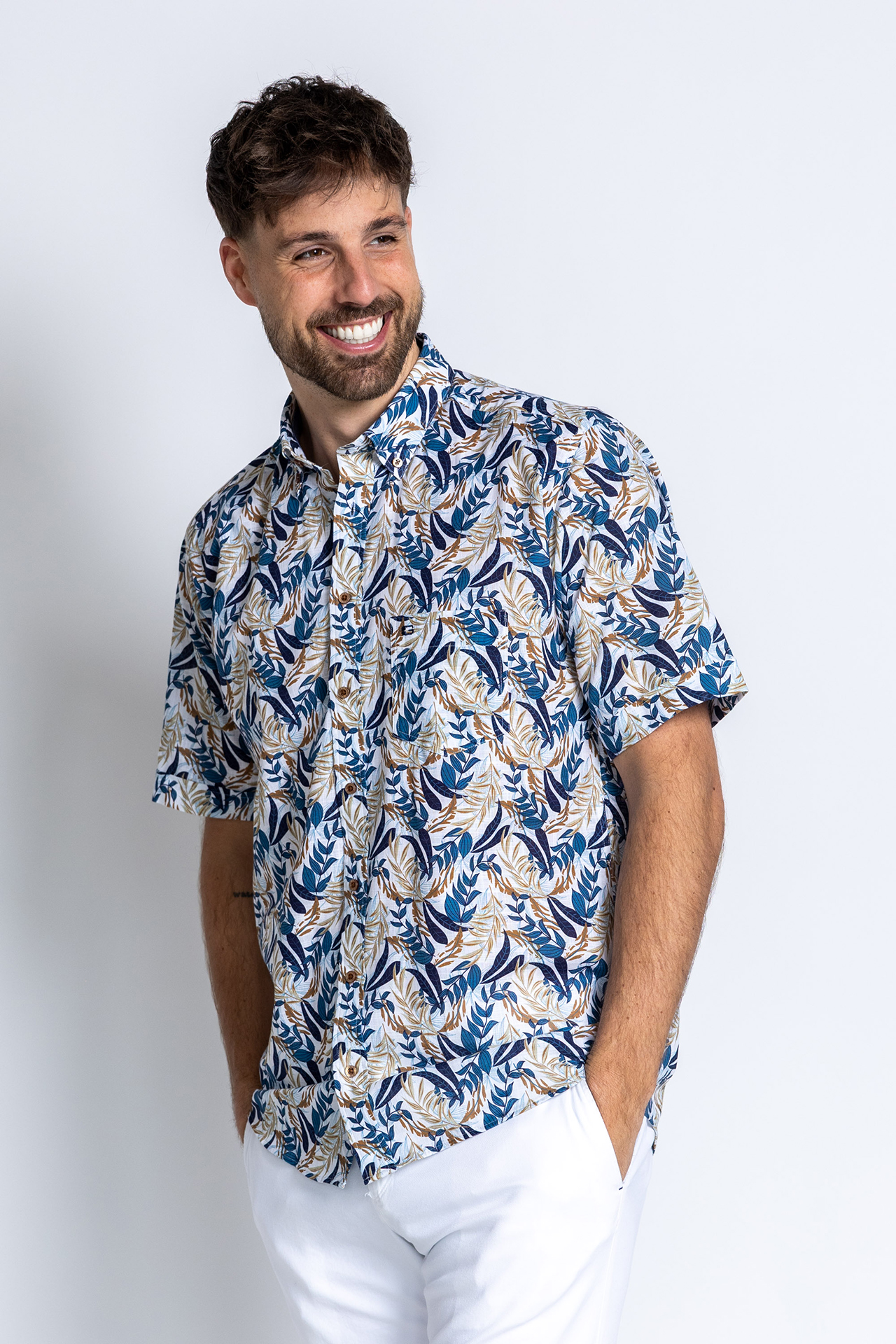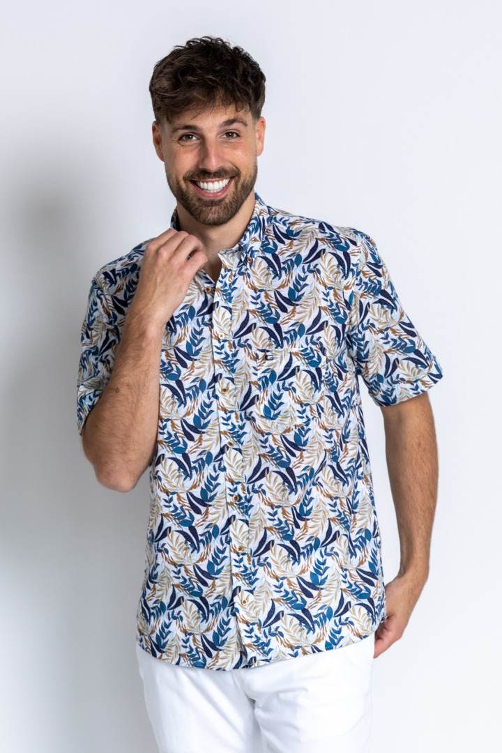 Overhemd met korte mouwen, borstzak en een drukke print in blauw/beige