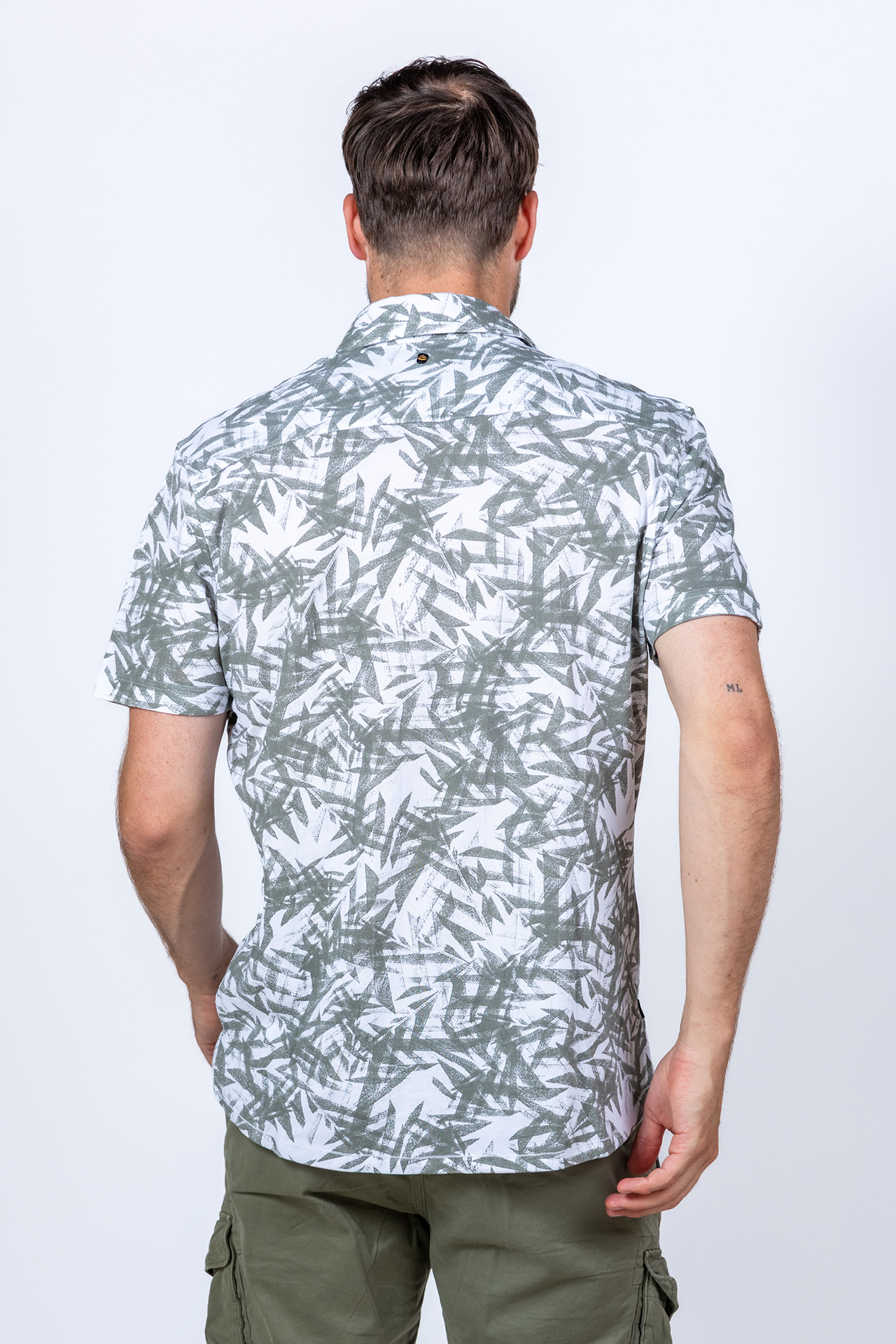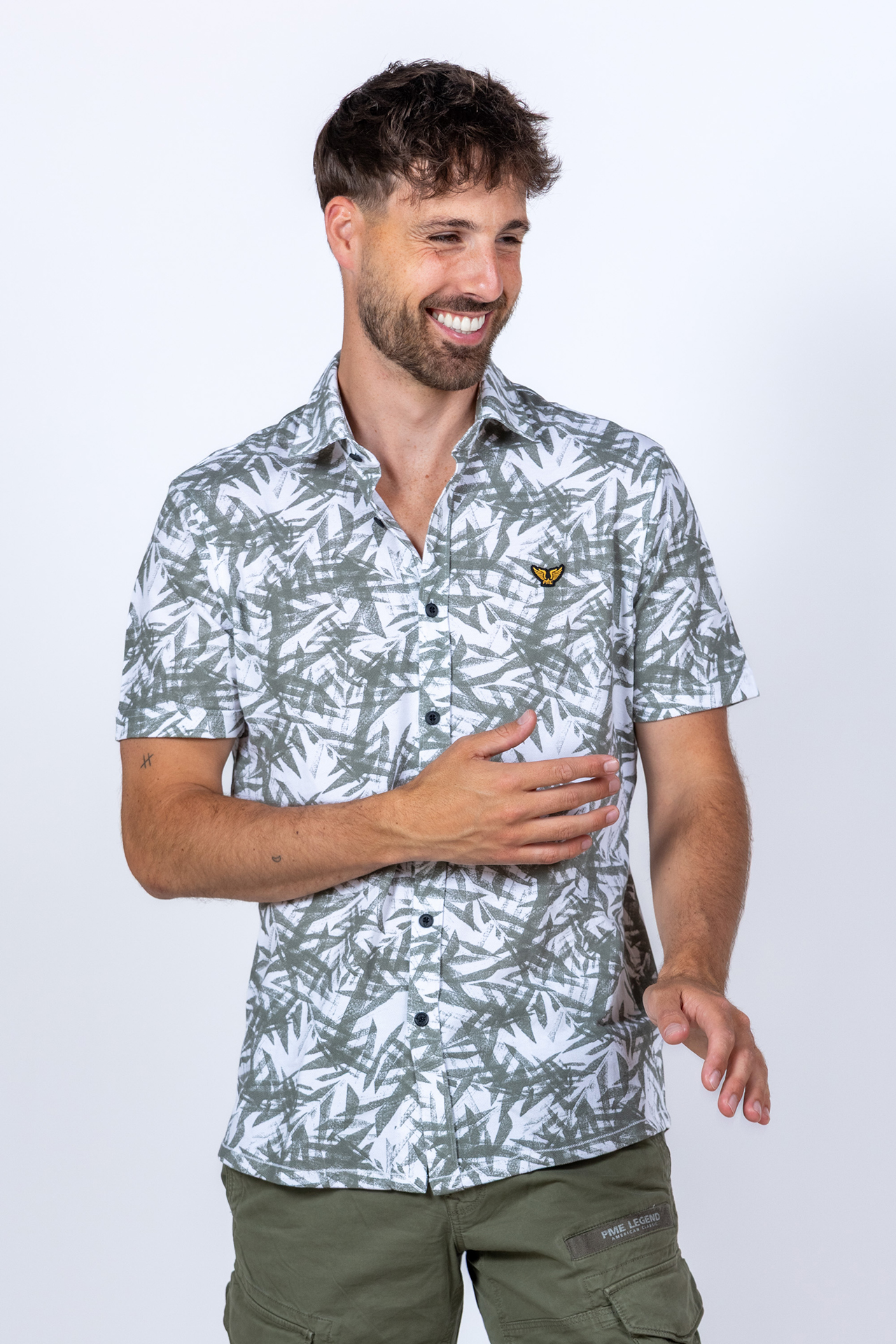 Overhemd met korte mouwen, een all-over dessin met bladeren en het logo op de borst