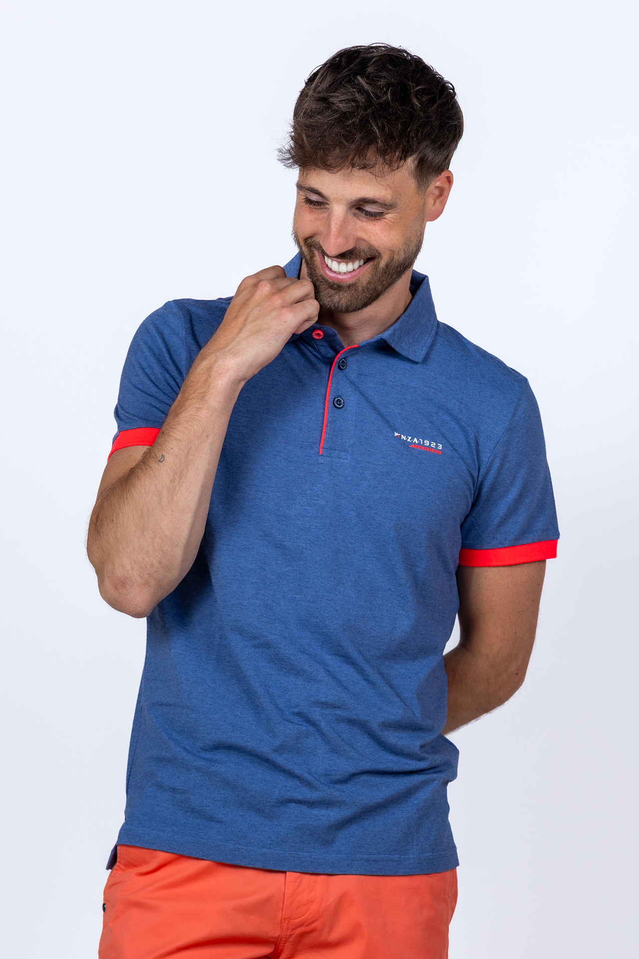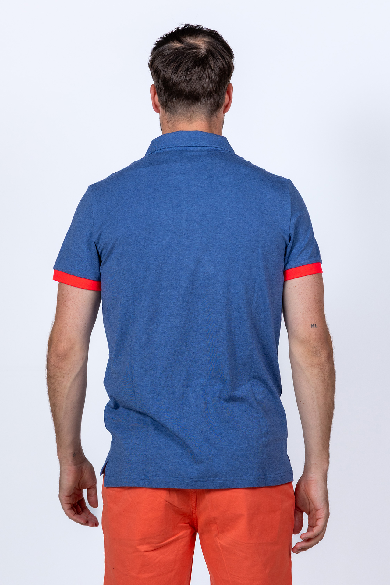 Polo met korte mouwen en het logo op de borst. Hij heeft splitjes aan de zijkant, oranjerode details en stretch in de stof waardoor hij comfortabel draagt
