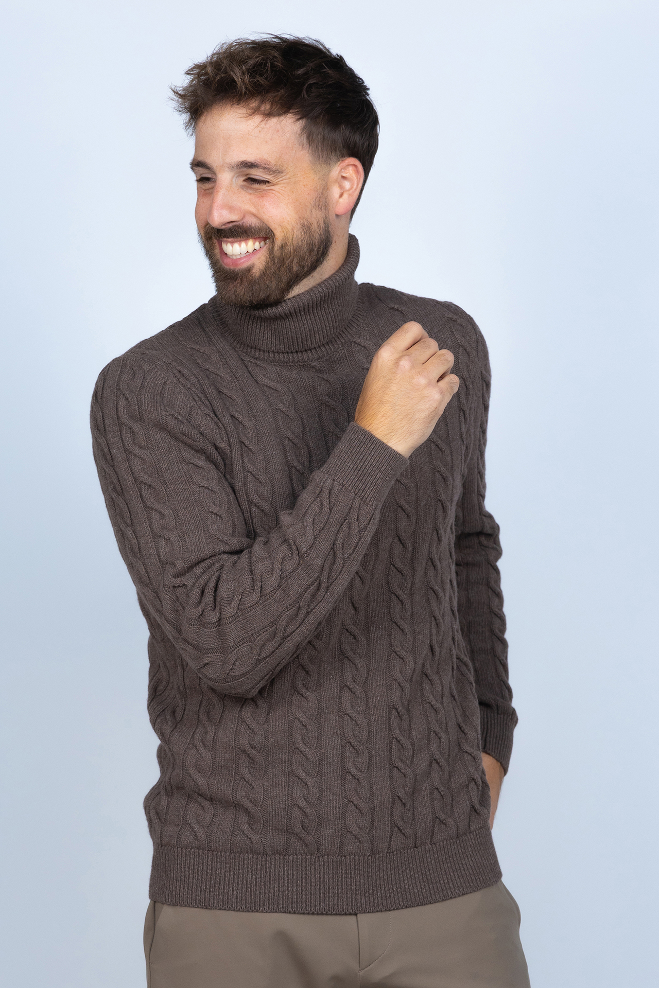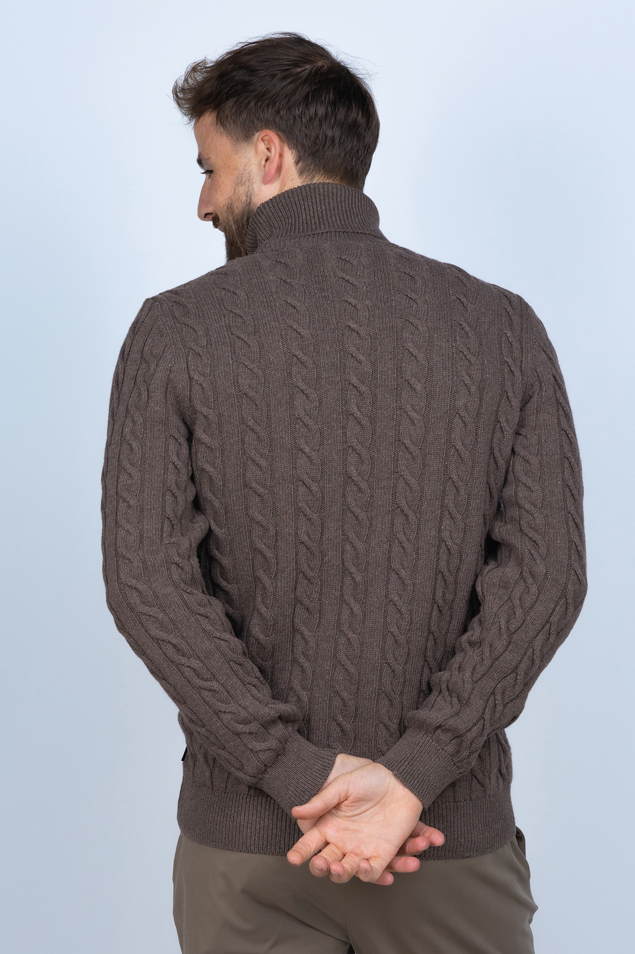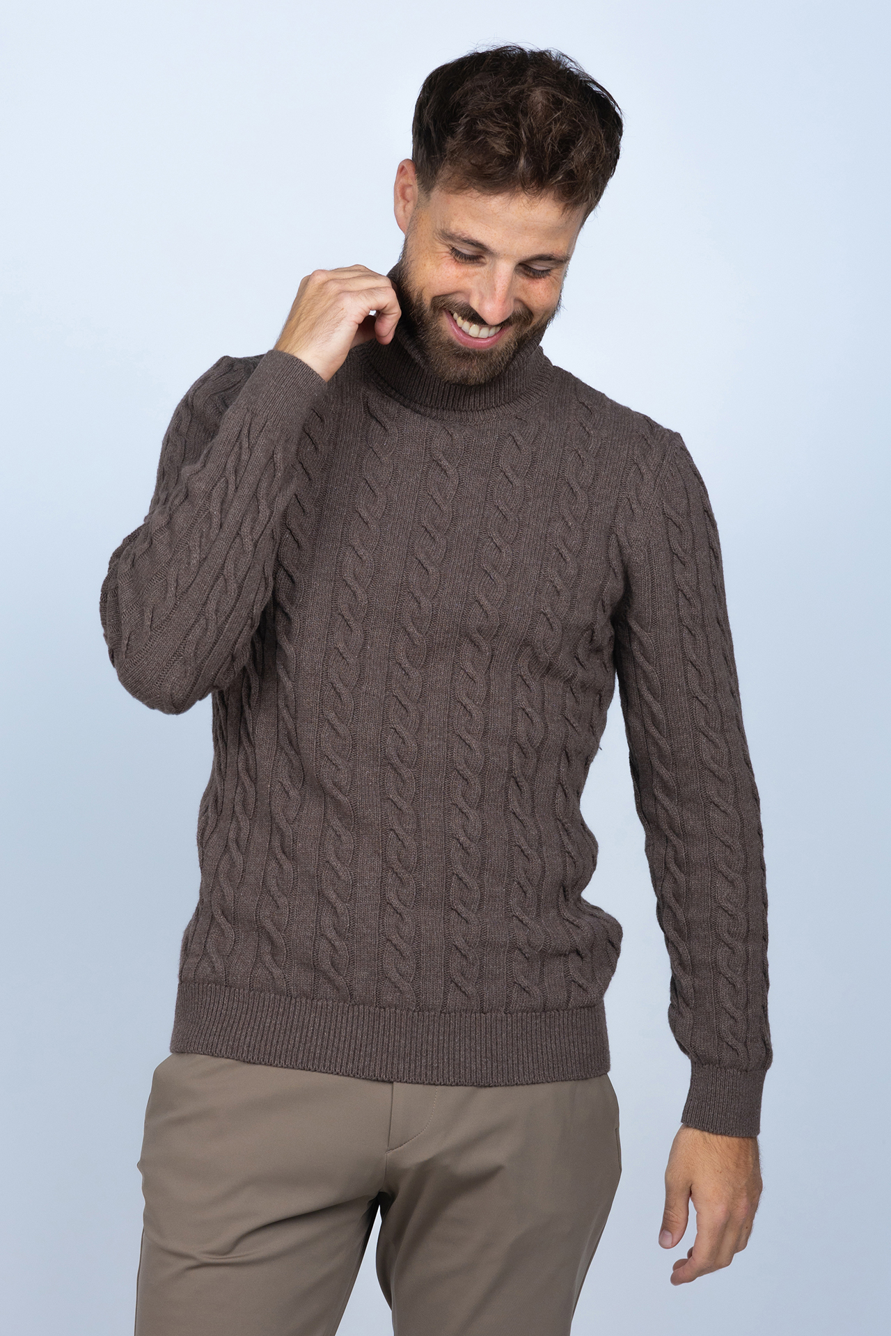 Gebreide katoen- en wolmix kabeltrui met een col
