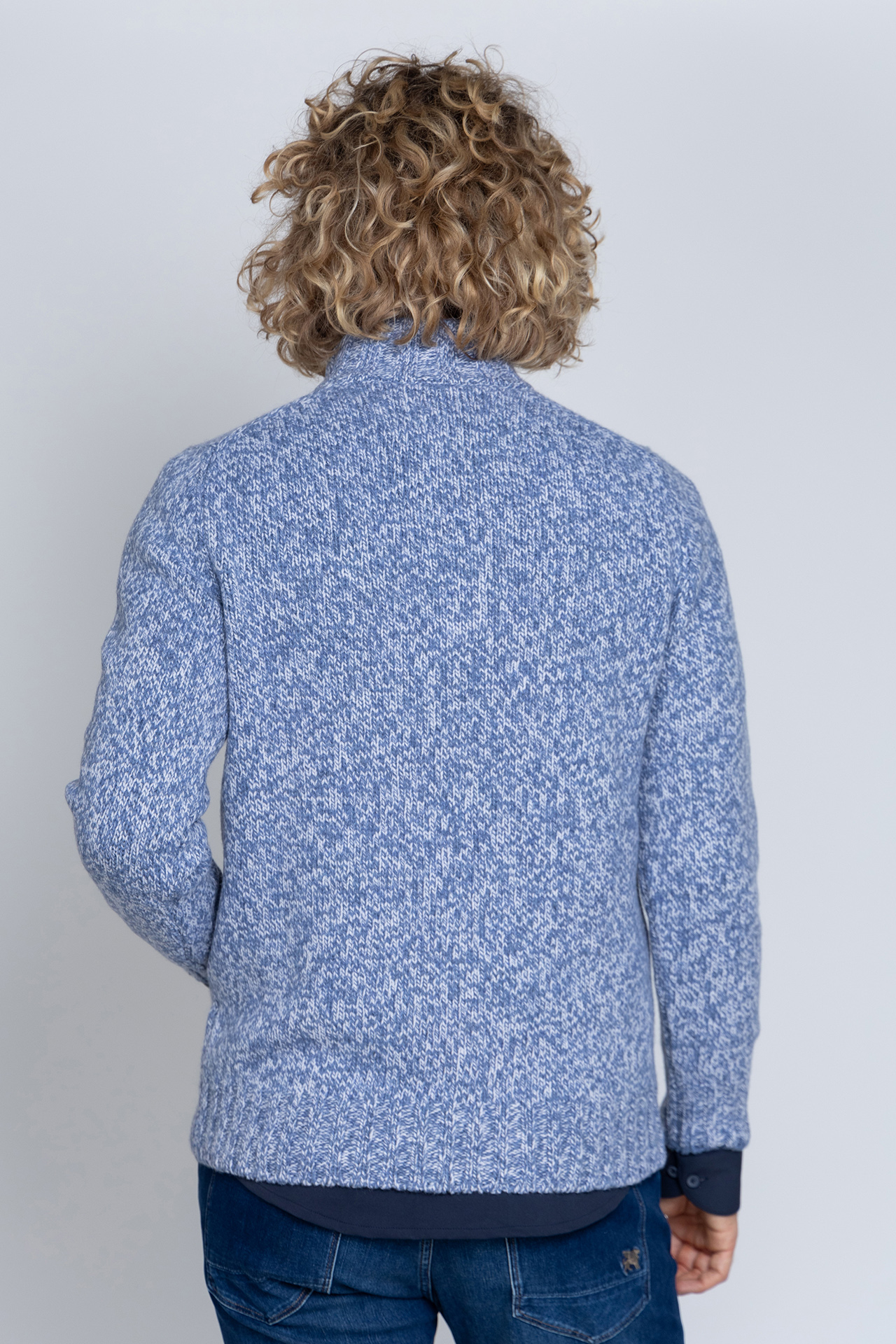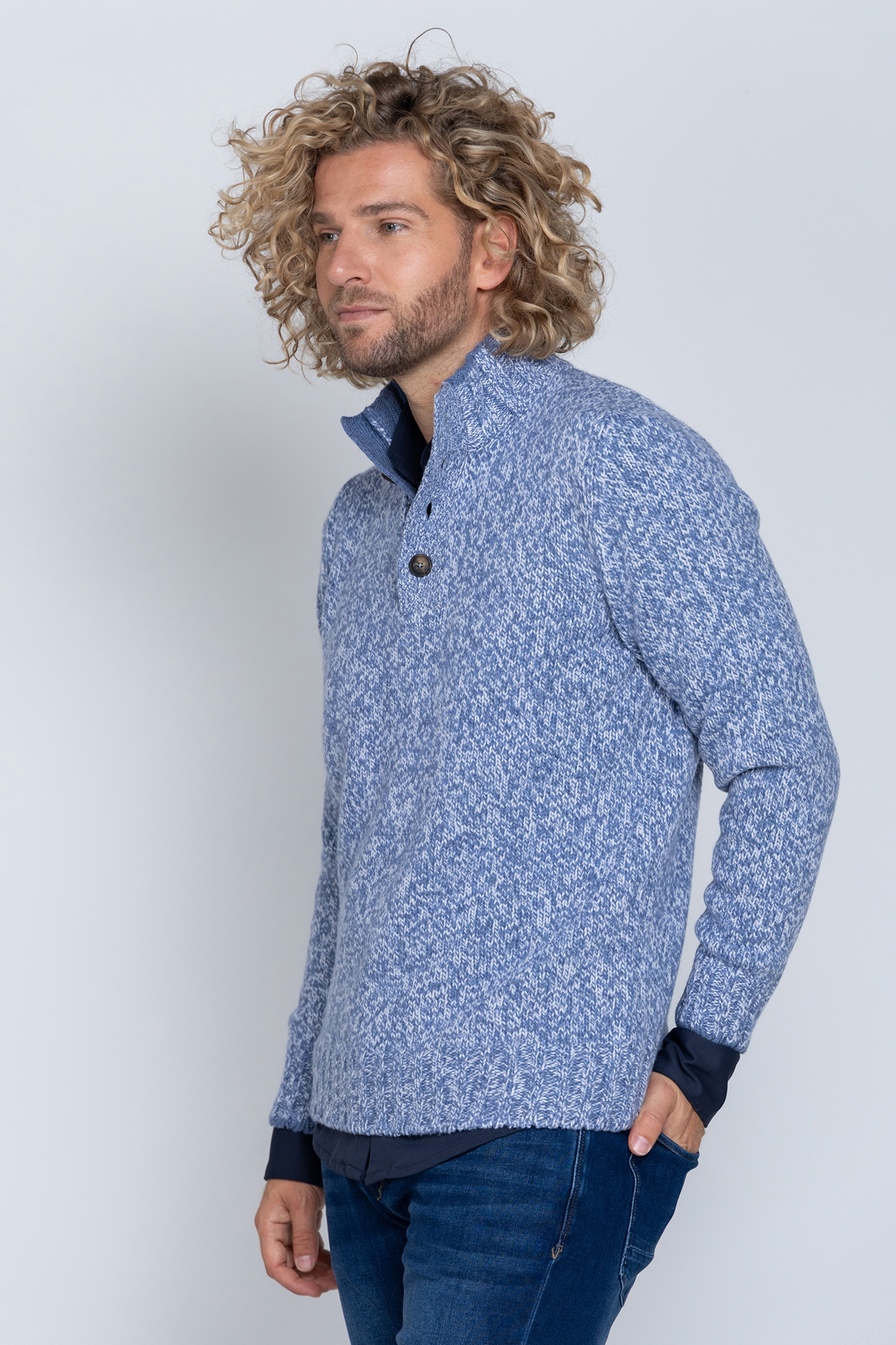 Gemêleerde wollen trui met een opstaande kraag met knopen en hij heeft lange mouwen