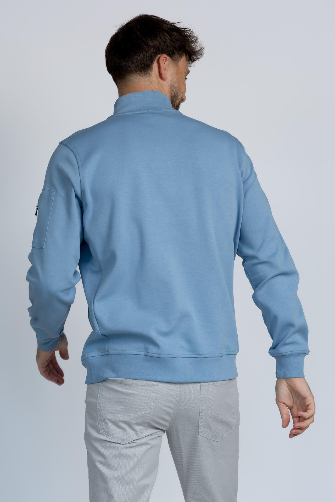 Sweater met een opstaande kraag met rits, lange mouwen, steekzakken met rits aan de voorkant en een zak op de linkermouw met rits