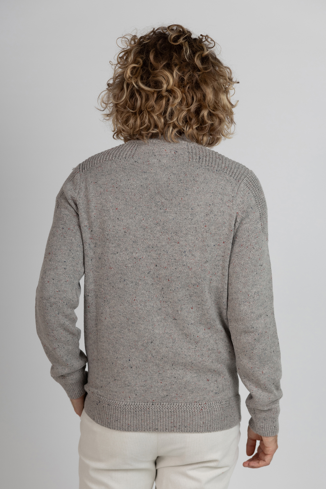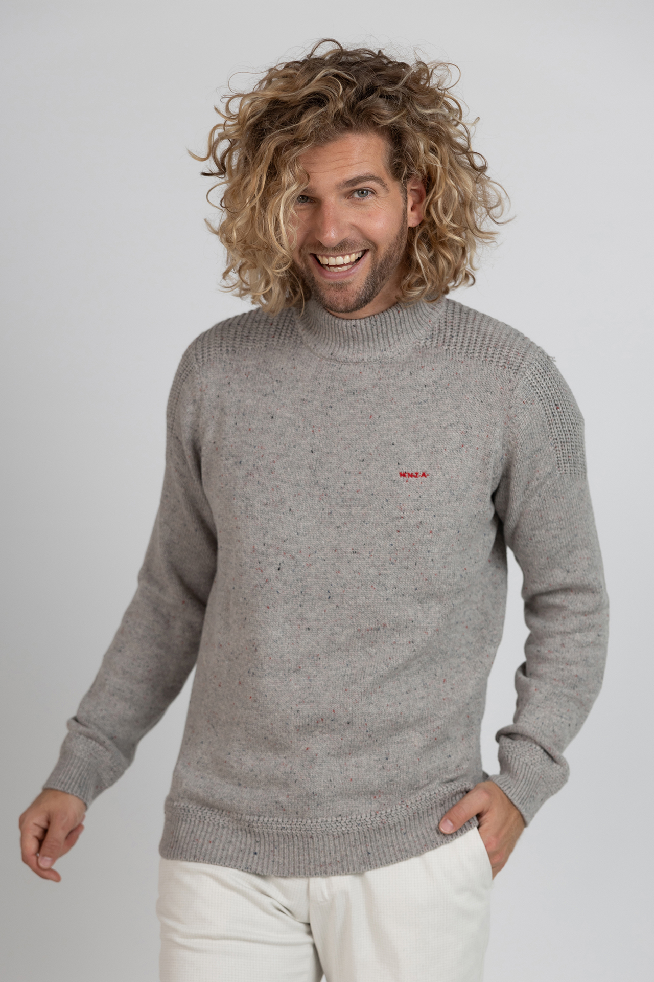 Gemêleerde trui met een hoge ronde hals, lange mouwen, geborduurd logo op de borst en een ander breisel op de schouders