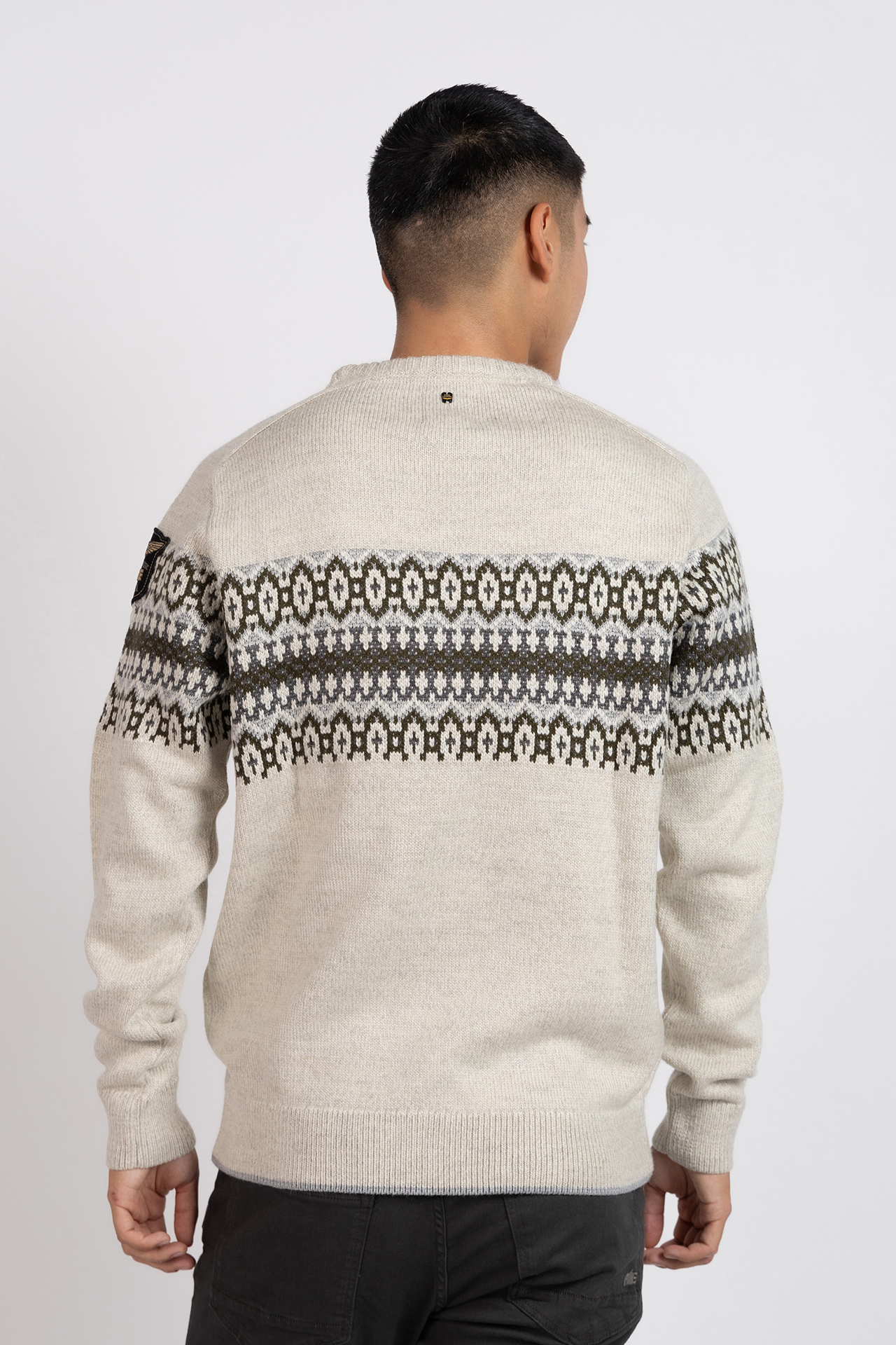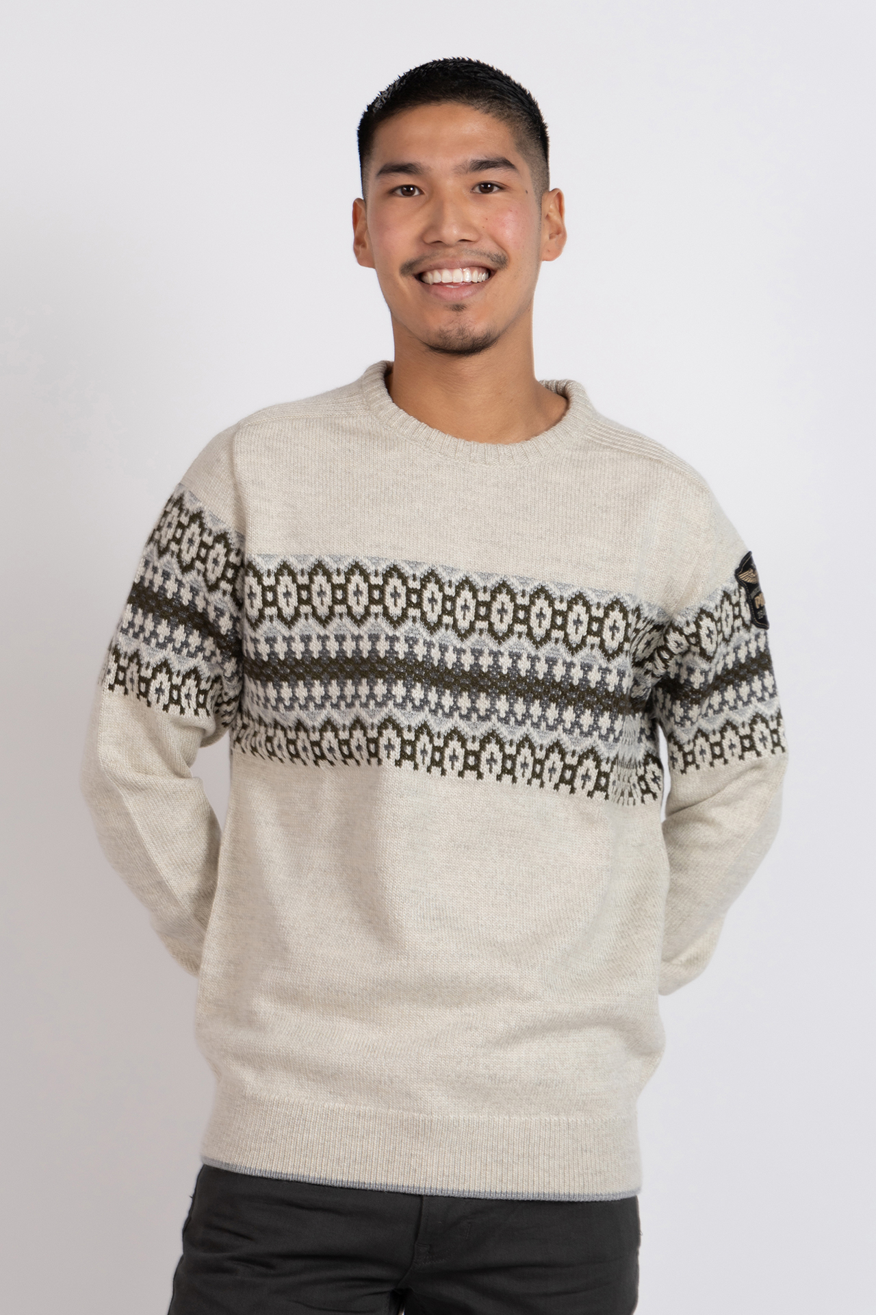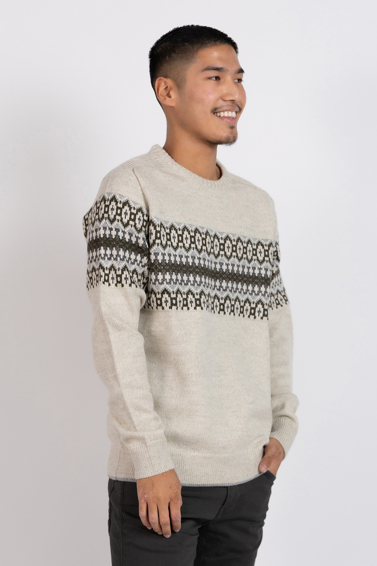 Gebreide trui met een fair Isle patroon over borst, lange mouwen en een ronde hals