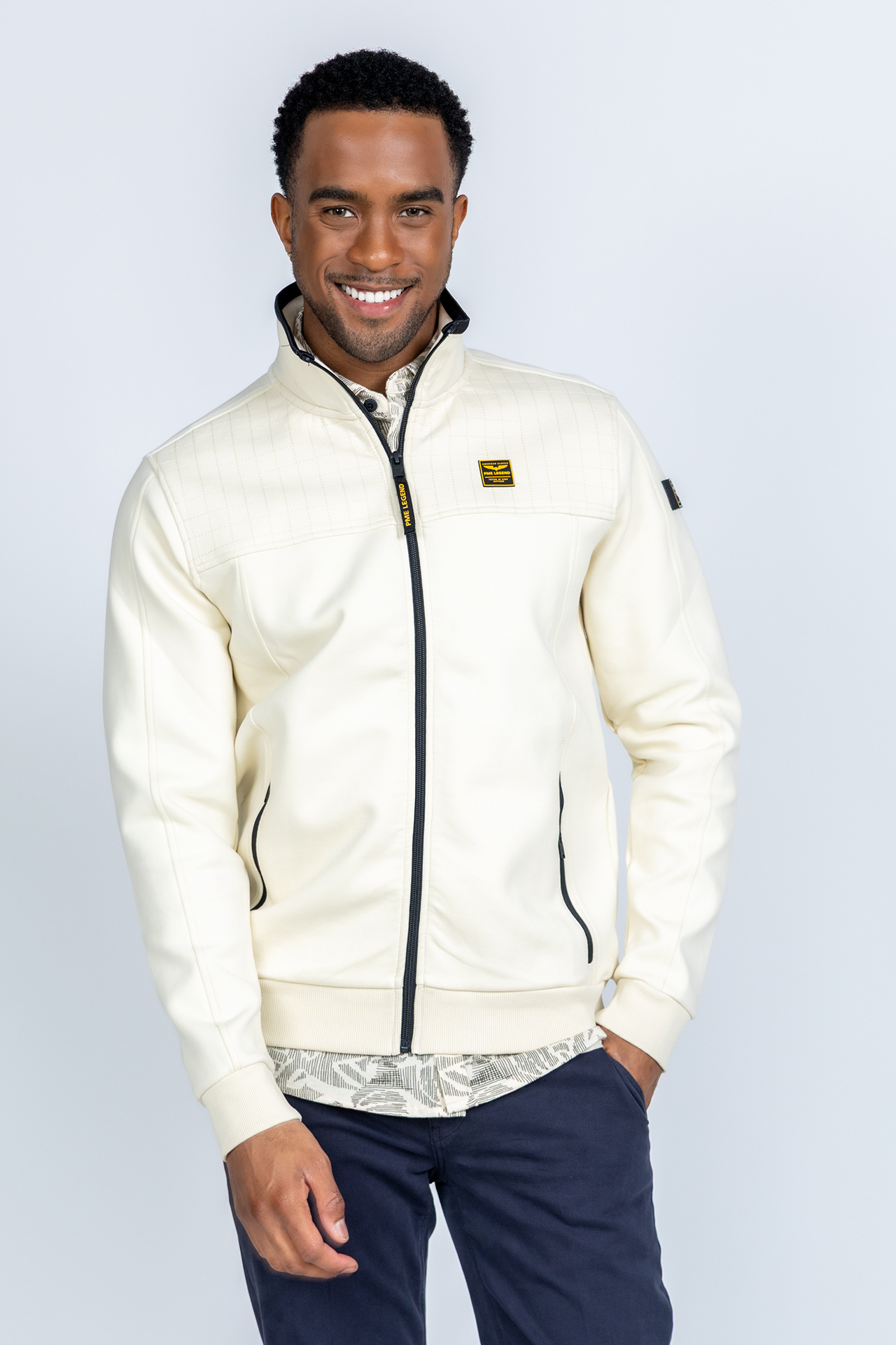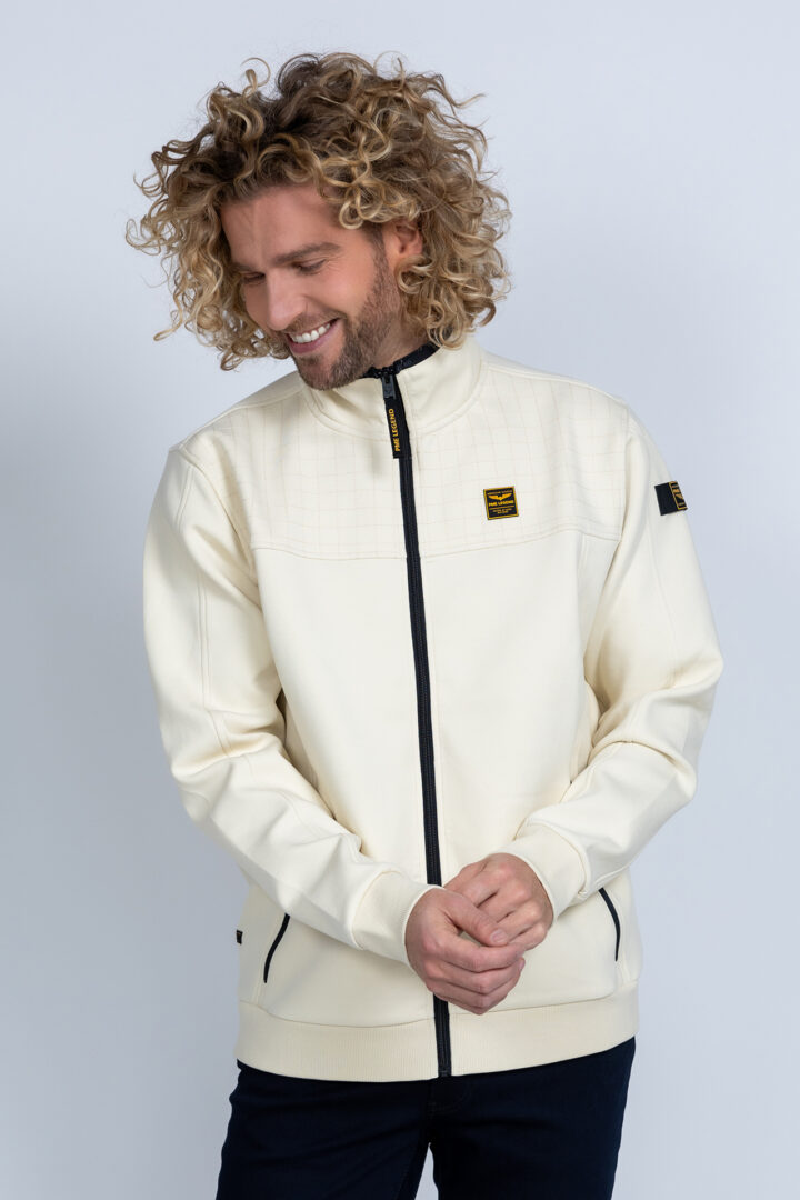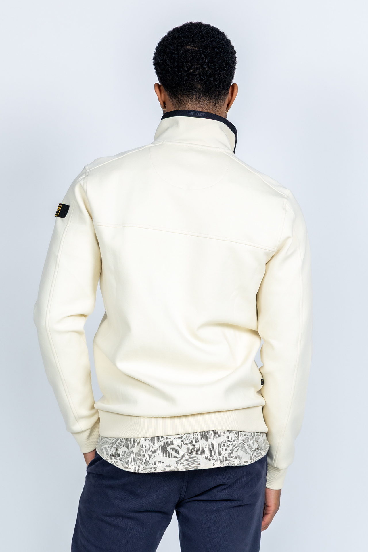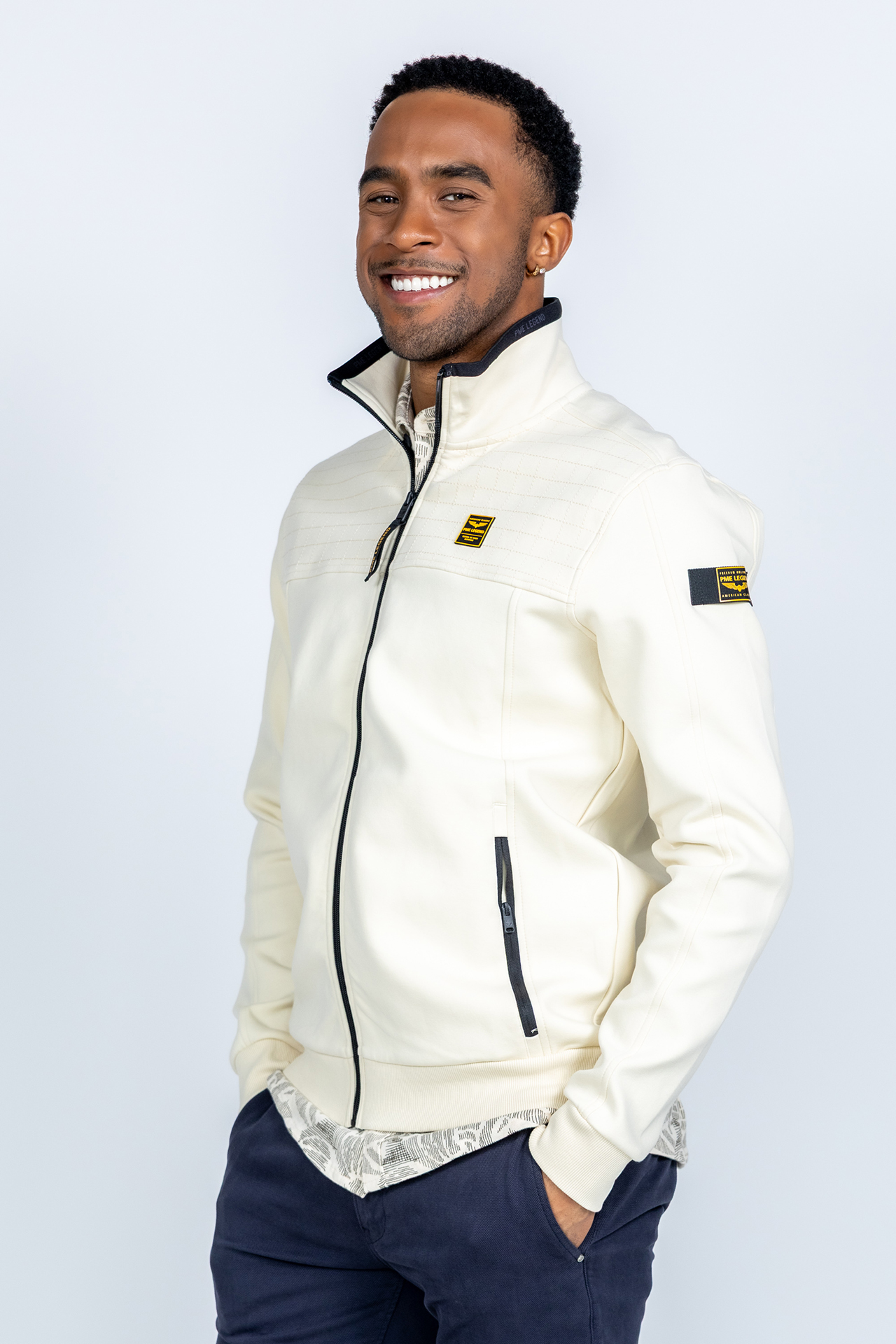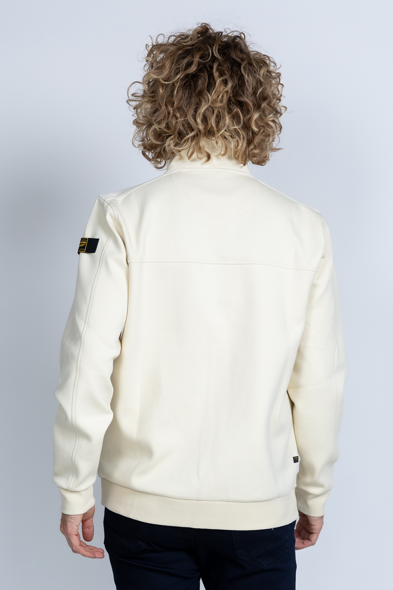 Ecru vest met een ritssluiting, opstaande kraag, steekzakken met rits aan de voorkant en zwarte details